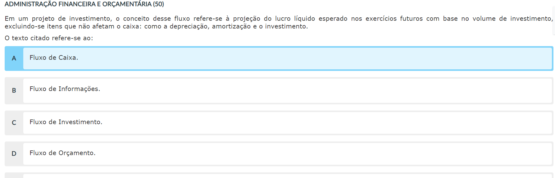 <p>ADMINISTRAÇÃO FINANCEIRA E ORÇAMENTÁRIA (50) Em um projeto de investimento, conceito desse fluxo refere-se à projeção do lucro líquido esperado nos exercícios futuros com base no volume de investimento, excluindo-se itens que não afetam caixa: como a depreciação, amortização e investimento. texto citado refere-se ao: A Fluxo de Caixa. B Fluxo de Informações. C Fluxo de Investimento. D Fluxo de Orçamento.</p>