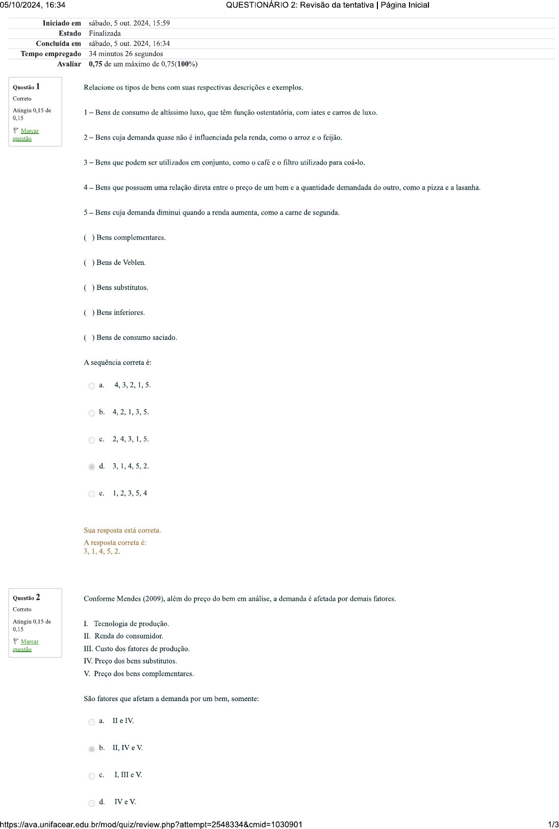 <p>05/10/2024, 16:34 QUESTIONÁRIO 2: Revisão da tentativa I Página Inicial Iniciado em sábado, 5 out. 2024, 15:59 Estado Finalizada Concluída em sábado, 5 out. 2024, 16:34 Tempo empregado 34 minutos 26 segundos Avaliar 0,75 de um máximo de 0,75(100%) Questão 1 Relacione os tipos de bens com suas respectivas descrições e exemplos. Correto Atingiu 0,15 de 1 - Bens de consumo de altíssimo luxo, que têm função ostentatória, com iates e carros de luxo. 0,15 P Marcar questão 2 - Bens cuja demanda quase não é influenciada pela renda, como o arroz e o feijão. 3 Bens que podem ser utilizados em conjunto, como o café e o filtro utilizado para coá-lo. 4 - Bens que possuem uma relação direta entre o preço de um bem e a quantidade demandada do outro, como a pizza e a lasanha. 5 - Bens cuja demanda diminui quando a renda aumenta, como a carne de segunda. ( ) Bens complementares. ( ) Bens de Veblen. ( ) Bens substitutos. ( ) Bens inferiores. ( ) Bens de consumo saciado. A sequência correta é: a. 4, 3. 2, 1, 5. b. 2,4,3,1,5. d. 3,1,4,5,2. e. 1, 2, 3, 5, 4 Sua resposta está correta. A resposta correta é: 3, 2. Questão 2 Conforme Mendes (2009), além do preço do bem em análise, a demanda é afetada por demais fatores. Correto Atingiu 0,15 de I. Tecnologia de produção. 0,15 II. Renda do consumidor. P Marcar questão III. Custo dos fatores de produção. IV. Preço dos bens substitutos. V. Preço dos bens complementares. São fatores que afetam a demanda por um bem, somente: a. II IV. b. II, IV e V. I, III e V. d. IV e V. 1/3</p><p>05/10/2024, 16:34 QUESTIONÁRIO 2: Revisão da tentativa I Página Inicial e. III Sua resposta está correta. A resposta correta é: II, IV V. Questão 3 Tanto a Macroeconomia quanto a Microeconomia são ramos da Economia, que é a ciência social que estuda o fenômeno da escassez de recursos. Correto Neste sentido, o objeto de estudo da Microeconomia: Atingiu 0,15 de 0,15 P Marcar a. São os agregados econômicos. questão b. É o nível de inflação. c. É o crescimento econômico. d. Não se refere à formação de preços nos mercados. e. São as unidades individuais da Economia (consumidores e empresas). Sua resposta está correta. A resposta correta é: São as unidades individuais da Economia (consumidores e empresas). Questão 4 Observando-se o gráfico abaixo de um mercado qualquer, marque V para verdadeiro e F para falso quanto às assertivas a seguir. Correto Preço Atingiu 0,15 de 5.00 0,15 Marcar questão Oferta 2.00 Demanda 0.00 15 ( ) o preço que equilibra a oferta e a demanda é de R$ 3,00. ( ) Ao preço de R$ 2,00, há excesso de oferta. ( ) Ao preço de R$ há excesso de demanda de 10 unidades (20 demandada - 10 ofertada). ( ) Ao preço de R$ 4,00, há excesso de oferta. ( ) Ao preço de R$ 4,00 há excesso de oferta de 10 unidades (20 ofertada - 10 demandada). Assinale a alternativa correta: a. b. c. https://ava.unifacear.edu.br/mod/quiz/review.php?attempt=2548334&cmid=1030901 2/3</p><p>05/10/2024, 16:34 QUESTIONÁRIO 2: Revisão da tentativa Página Inicial d. e. F,F,F,V,V. Sua resposta está correta. A resposta correta é: Questão 5 A Microeconomia, no seu objeto de análise, utiliza-se de alguns pressupostos básicos. Nesse sentido, marque V para verdadeiro e F para falso Correto quanto às assertivas abaixo. Atingiu 0,15 de 0,15 ( ) A Microeconomia se utiliza de modelos matemáticos para proceder às suas análises. P Marcar questão ( ) A Microeconomia sempre analisará a forma de passagem de uma situação para outra, e não analisará as situações de forma estática-comparativa. ( ) A análise microeconômica carrega juízo de valor. ( ) A Microeconomia utiliza-se da hipótese coeteris paribus (tudo o mais permanece constante). ( ) A Microeconomia nunca utilizará do instrumental estatístico e matemático. ( ) A Microeconomia se baseia na hipótese do homem racional (princípio da racionalidade). Assinale a alternativa correta: a. b. F,F,F,V,V,V V,F,V,V,V,F d. V.V.F.F.F.F e. V,F,F,V,F,V Sua resposta está correta. A resposta correta é: V,F,F,V,F,V 3/3</p>