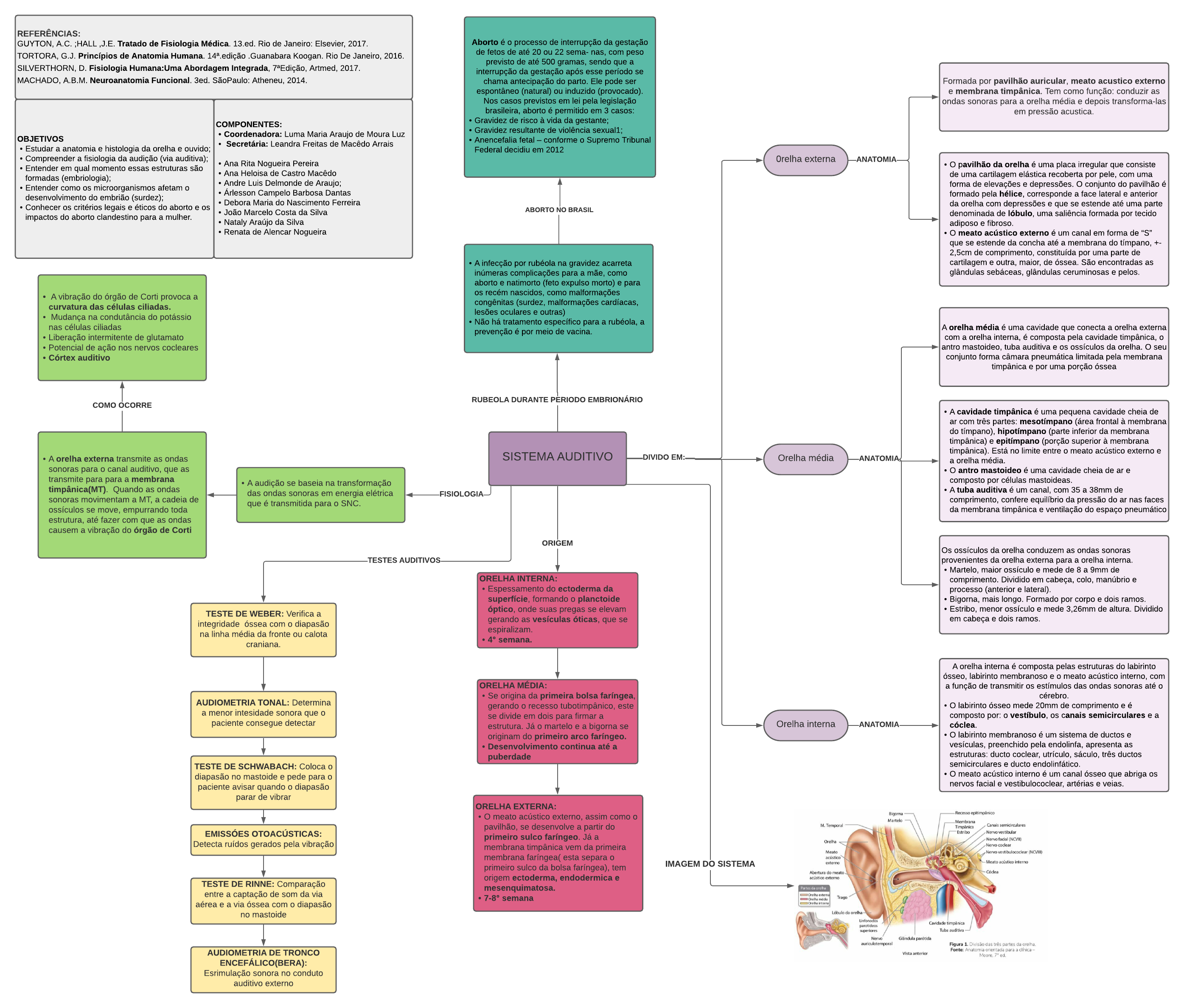 <p>SISTEMA AUDITIVO DIVIDO EM: Orelha média</p><p>Orelha interna</p><p>0relha externa ANATOMIA</p><p>Formada por pavilhão auricular, meato acustico externo</p><p>e membrana timpânica. Tem como função: conduzir as</p><p>ondas sonoras para a orelha média e depois transforma-las</p><p>em pressão acustica.</p><p>- A audição se baseia na transformação</p><p>das ondas sonoras em energia elétrica</p><p>que é transmitida para o SNC.</p><p>- A orelha externa transmite as ondas</p><p>sonoras para o canal auditivo, que as</p><p>transmite para para a membrana</p><p>timpânica(MT). Quando as ondas</p><p>sonoras movimentam a MT, a cadeia de</p><p>ossículos se move, empurrando toda</p><p>estrutura, até fazer com que as ondas</p><p>causem a vibração do órgão de Corti</p><p>- A vibração do órgão de Corti provoca a</p><p>curvatura das células ciliadas.</p><p>- Mudança na condutância do potássio</p><p>nas células ciliadas</p><p>- Liberação intermitente de glutamato</p><p>- Potencial de ação nos nervos cocleares</p><p>- Córtex auditivo</p><p>COMO OCORRE</p><p>FISIOLOGIA</p><p>TESTE DE WEBER: Verifica a</p><p>integridade óssea com o diapasão</p><p>na linha média da fronte ou calota</p><p>craniana.</p><p>TESTES AUDITIVOS</p><p>AUDIOMETRIA TONAL: Determina</p><p>a menor intesidade sonora que o</p><p>paciente consegue detectar</p><p>TESTE DE SCHWABACH: Coloca o</p><p>diapasão no mastoide e pede para o</p><p>paciente avisar quando o diapasão</p><p>parar de vibrar</p><p>EMISSÓES OTOACÚSTICAS:</p><p>Detecta ruídos gerados pela vibração</p><p>TESTE DE RINNE: Comparação</p><p>entre a captação de som da via</p><p>aérea e a via óssea com o diapasão</p><p>no mastoide</p><p>AUDIOMETRIA DE TRONCO</p><p>ENCEFÁLICO(BERA):</p><p>Esrimulação sonora no conduto</p><p>auditivo externo</p><p>ORELHA INTERNA:</p><p>- Espessamento do ectoderma da</p><p>superfície, formando o planctoide</p><p>óptico, onde suas pregas se elevam</p><p>gerando as vesículas óticas, que se</p><p>espiralizam.</p><p>- 4° semana.</p><p>ORELHA MÉDIA:</p><p>- Se origina da primeira bolsa faríngea,</p><p>gerando o recesso tubotimpânico, este</p><p>se divide em dois para firmar a</p><p>estrutura. Já o martelo e a bigorna se</p><p>originam do primeiro arco faríngeo.</p><p>- Desenvolvimento continua até a</p><p>puberdade</p><p>ORELHA EXTERNA:</p><p>- O meato acústico externo, assim como o</p><p>pavilhão, se desenvolve a partir do</p><p>primeiro sulco faríngeo. Já a</p><p>membrana timpânica vem da primeira</p><p>membrana faríngea( esta separa o</p><p>primeiro sulco da bolsa faríngea), tem</p><p>origem ectoderma, endodermica e</p><p>mesenquimatosa.</p><p>- 7-8° semana</p><p>ORIGEM</p><p>- O pavilhão da orelha é uma placa irregular que consiste</p><p>de uma cartilagem elástica recoberta por pele, com uma</p><p>forma de elevações e depressões. O conjunto do pavilhão é</p><p>formado pela hélice, corresponde a face lateral e anterior</p><p>da orelha com depressões e que se estende até uma parte</p><p>denominada de lóbulo, uma saliência formada por tecido</p><p>adiposo e fibroso.</p><p>- O meato acústico externo é um canal em forma de ?S?</p><p>que se estende da concha até a membrana do tímpano, +-</p><p>2,5cm de comprimento, constituída por uma parte de</p><p>cartilagem e outra, maior, de óssea. São encontradas as</p><p>glândulas sebáceas, glândulas ceruminosas e pelos.</p><p>ANATOMIA</p><p>A orelha média é uma cavidade que conecta a orelha externa</p><p>com a orelha interna, é composta pela cavidade timpânica, o</p><p>antro mastoideo, tuba auditiva e os ossículos da orelha. O seu</p><p>conjunto forma câmara pneumática limitada pela membrana</p><p>timpânica e por uma porção óssea</p><p>- A cavidade timpânica é uma pequena cavidade cheia de</p><p>ar com três partes: mesotímpano (área frontal à membrana</p><p>do tímpano), hipotímpano (parte inferior da membrana</p><p>timpânica) e epitímpano (porção superior à membrana</p><p>timpânica). Está no limite entre o meato acústico externo e</p><p>a orelha média.</p><p>- O antro mastoideo é uma cavidade cheia de ar e</p><p>composto por células mastoideas.</p><p>- A tuba auditiva é um canal, com 35 a 38mm de</p><p>comprimento, confere equilíbrio da pressão do ar nas faces</p><p>da membrana timpânica e ventilação do espaço pneumático</p><p>ANATOMIA</p><p>A orelha interna é composta pelas estruturas do labirinto</p><p>ósseo, labirinto membranoso e o meato acústico interno, com</p><p>a função de transmitir os estímulos das ondas sonoras até o</p><p>cérebro.</p><p>- O labirinto ósseo mede 20mm de comprimento e é</p><p>composto por: o vestíbulo, os canais semicirculares e a</p><p>cóclea.</p><p>- O labirinto membranoso é um sistema de ductos e</p><p>vesículas, preenchido pela endolinfa, apresenta as</p><p>estruturas: ducto coclear, utrículo, sáculo, três ductos</p><p>semicirculares e ducto endolinfático.</p><p>- O meato acústico interno é um canal ósseo que abriga os</p><p>nervos facial e vestibulococlear, artérias e veias.</p><p>IMAGEM DO SISTEMA</p><p>- A infecção por rubéola na gravidez acarreta</p><p>inúmeras complicações para a mãe, como</p><p>aborto e natimorto (feto expulso morto) e para</p><p>os recém nascidos, como malformações</p><p>congênitas (surdez, malformações cardíacas,</p><p>lesões oculares e outras)</p><p>- Não há tratamento específico para a rubéola, a</p><p>prevenção é por meio de vacina.</p><p>RUBEOLA DURANTE PERIODO EMBRIONÁRIO</p><p>ABORTO NO BRASIL</p><p>Aborto é o processo de interrupção da gestação</p><p>de fetos de até 20 ou 22 sema- nas, com peso</p><p>previsto de até 500 gramas, sendo que a</p><p>interrupção da gestação após esse período se</p><p>chama antecipação do parto. Ele pode ser</p><p>espontâneo (natural) ou induzido (provocado).</p><p>Nos casos previstos em lei pela legislação</p><p>brasileira, aborto é pe
