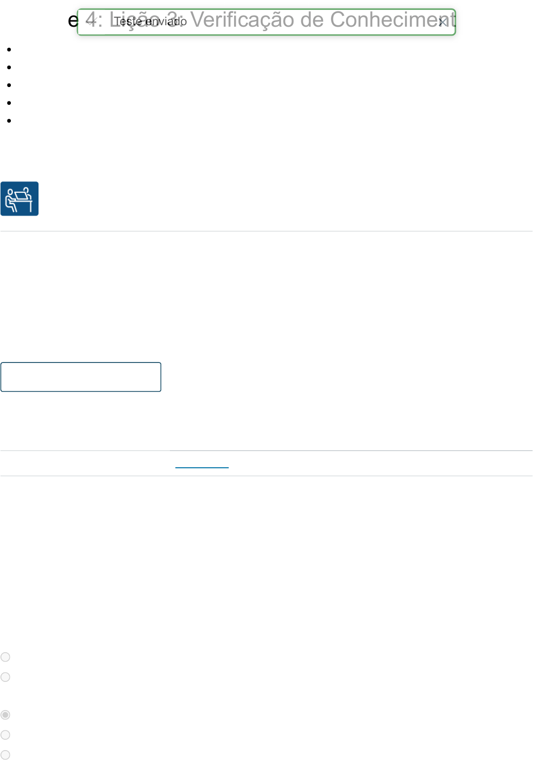 <p>Unidade 4: Lição 3: Verificação de Conhecimento</p><p>Entrega Sem prazo</p><p>Pontos 100</p><p>Perguntas 2</p><p>Limite de tempo Nenhum</p><p>Tentativas permitidas Sem limite</p><p>Instruções</p><p>Histórico de tentativas</p><p>Tentativa Tempo Pontuação</p><p>MAIS RECENTE Tentativa 1 2 minutos 50 de 100</p><p>Enviado 5 out em 17:36</p><p></p><p>Pergunta 1</p><p>50 / 50 pts</p><p>Elementos fiscais e análises estatísticas.</p><p>Elementos financeiros por meio de cruzamento de dados.</p><p>Correto!</p><p>Elementos patrimoniais por meio de índices.</p><p>Elementos de resultado por meio de análises econômicas.</p><p>Elementos econômicos por meio de projeções.</p><p>Verificação de Conhecimento</p><p>Após a atividade anterior, faça este teste para verificar sua compreensão.</p><p>Como este exercício é corrigido automaticamente, você verá seus resultados no final do teste.</p><p>Estude cuidadosamente as explicações para qualquer pergunta que você responda incorretamente.</p><p>Esse feedback ajudará a redirecioná-lo no início do seu aprendizado se um conceito não estiver</p><p>claro.</p><p>Fazer o teste novamente</p><p>O modelo dinâmico de capital de giro, que também é conhecido como Modelo de Fleuriet, é</p><p>usado para a análise financeira de uma forma diferenciada, sendo adequado ao que as</p><p>empresas possuem em território nacional.</p><p>Assim sendo, esse modelo utiliza, em suas análises:</p><p>Teste enviado </p><p>05/10/2024, 17:36 Unidade 4: Lição 3: Verificação de Conhecimento: GESTÃO FINANCEIRA (0106)</p><p>https://uva.instructure.com/courses/44035/quizzes/19634 1/2</p><p>https://uva.instructure.com/courses/44035/quizzes/19634/history?version=1</p><p>https://uva.instructure.com/courses/44035/quizzes/19634/take?user_id=92560000000061570</p><p>O Modelo de Fleuriet, ou, ainda, modelo dinâmico de capital de giro, é diferenciado, porque utiliza as</p><p>contas do balanço patrimonial para a sua análise com a utilização de índices.</p><p></p><p>Pergunta 2</p><p>0 / 50 pts</p><p>Resposta correta</p><p>Ter retorno marginal dos ativos acima dos recursos alocados.</p><p>Ter retorno exponencial dos ativos acima dos recursos alocados.</p><p>Ter retorno marginal dos patrimônios acima dos recursos alocados.</p><p>Ter retorno marginal dos passivos acima dos recursos alocados.</p><p>Você respondeu</p><p>Ter retorno marginal das receitas acima dos recursos alocados.</p><p>De acordo com a leitura “O capital de giro na decisão de financiamento das empresas: uma revisão”,</p><p>a fórmula do retorno não necessita que este ocorra de maneira exponencial, e sim que seja maior</p><p>que as origens. O retorno nos ativos, e não no resultado, está baseado nas origens, e não apenas</p><p>no patrimônio líquido.</p><p>“A administração do capital de giro vem recebendo cada vez mais atenção por parte das</p><p>empresas. Ao ser reconhecida como uma área de extrema importância para um saudável</p><p>equilíbrio financeiro, pode servir como um termômetro para o sucesso dos negócios”</p><p>(NUNES; VISOTO; SILVA, 2019, p. 42).</p><p>NUNES, A.; VISOTO, M. C. R.; SILVA, M. C. da. O capital de giro na decisão de financiamento das</p><p>empresas: uma revisão. Pensar Contábil, v. 21, n. 75, p. 42-49, 2019. Disponível em:</p><p>http://www.atena.org.br/revista/ojs-2.2.3-</p><p>06/index.php/pensarcontabil/article/viewFile/3501/2656 (http://www.atena.org.br/revista/ojs-</p><p>2.2.3-06/index.php/pensarcontabil/article/viewFile/3501/2656) . Acesso em: 9 maio 2022.</p><p>Para que a empresa decida investir em capital de giro, ela deve:</p><p>Teste enviado</p><p>05/10/2024, 17:36 Unidade 4: Lição 3: Verificação de Conhecimento: GESTÃO FINANCEIRA (0106)</p><p>https://uva.instructure.com/courses/44035/quizzes/19634 2/2</p><p>http://www.atena.org.br/revista/ojs-2.2.3-06/index.php/pensarcontabil/article/viewFile/3501/2656</p><p>http://www.atena.org.br/revista/ojs-2.2.3-06/index.php/pensarcontabil/article/viewFile/3501/2656</p><p>http://www.atena.org.br/revista/ojs-2.2.3-06/index.php/pensarcontabil/article/viewFile/3501/2656</p><p>http://www.atena.org.br/revista/ojs-2.2.3-06/index.php/pensarcontabil/article/viewFile/3501/2656</p><p>http://www.atena.org.br/revista/ojs-2.2.3-06/index.php/pensarcontabil/article/viewFile/3501/2656</p>