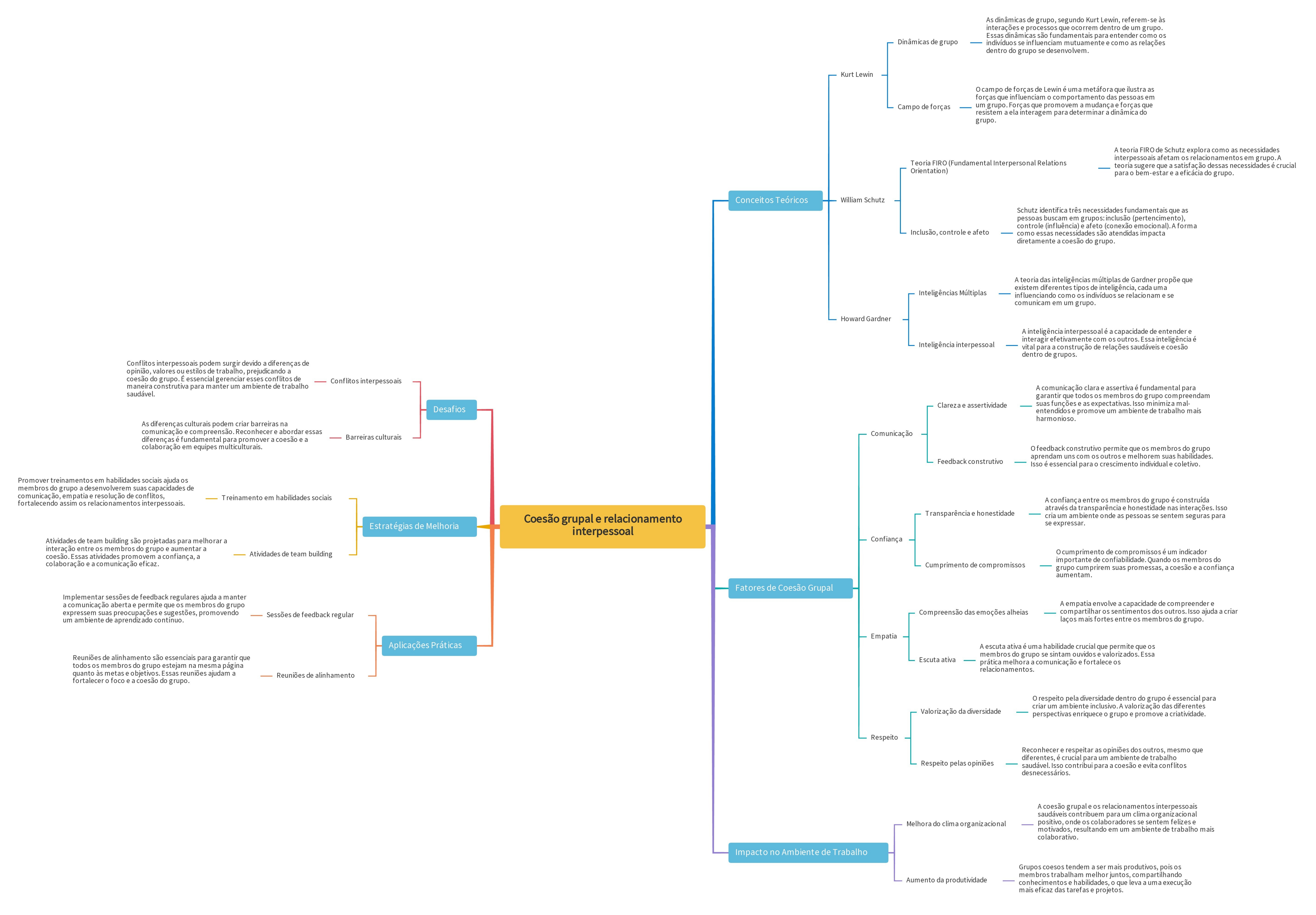 <p>As dinâmicas de grupo, segundo Kurt referem- às interações processos que ocorrem dentro de um grupo. Essas dinâmicas são fundamentais para entender como os Dinâmicas de grupo indivíduos se influenciam mutuamente como as relações dentro do grupo se Kurt Lewin Ocampo de forças de Lewin é uma metáfora que ilustra as forças que influenciam o comportamento das pessoas em Campo de forças um grupo. Forças que promovem mudança forças que resistem ela interagem para determinar dinâmica do grupo. A teoria FIRO de Schutz explora como as necessidades interpessoais afetam os relacionamentos em Teoria FIRO (Fundamental Interpersonal Relations teoria sugere que satisfa ão dessas necessidades crucial Orientation) para bem-estar eficácia do grupo. Conceitos Teóricos William Schutz Schutz identifica três necessidades fundamentais que as pessoas buscam em grupos:inclusão (pertencimento), controle (influência) afeto (conexão emocional). A forma controle afeto como essas necessidades são atendidas impacta diretamente coesão do grupo. A teoria das inteligências múltiplas de Gardner propõe que existem diferentes tipos de inteligência, cada uma Inteligências Múltiplas como os indivíduos se relacionam se comunicam em um grupo. Howard Gardner A inteligência interpessoal capacidade de entender e interagir ef com os outros. Essa inteligência é Inteligência interpessoal vital para de relações saudáveis coesão dentro de grupos. Conflitos interpessoais podem surgir devido diferenças de opinião valores ouestilos de trabalho, prejudicando a coesão do grupo. essencial gerenciar esses conflitos de Conflitos interpessoais maneira construtiva para manter um ambiente de trabalho A comunicação clara assertiva é para saudável. garantir que todos os membros do grupo compreendam Clareza assertividade suas funções as expectativas Isso minimiza mal- Desafios entendidos promove um ambiente de trabalho mais As diferenças culturais podem criar barreiras na comunicação compreensão. Reconhecer abordar essas diferenças é fundamental para promover coesão Barreiras culturais Comunicação colaboraç ão em equipes feedback construtivo permite que os membros do grupo aprendam uns com os outros melhorem suas habilidades Feedback construtivo Isso é essencial para crescimento Promover treinamentos em habilidades sociais ajuda os membros do grupo desenvolverem suas capacidades de resolução de Treinamento em habilidades sociais fortalecendo assim os relacionamentos A confianca entre os membros do grupo é construída através da transparência honestidade nas Isso Transparência honestidade Coesão grupal e relacionamento cria um ambiente onde as pessoas se sentem seguras para Estratégias de Melhoria se expressar. interpessoal Atividades de team building são projetadas para melhorar a Confiança interação entre os membros do grupo aumentar a Atividades de team building cumprimento de compromissos é um indicador Essas atividades promovem confiança, a importante de confiabilidade Quando os membros do colaboração comunicaç eficaz. Cumprimento de compromissos grupo cumprirem suas promessas, coesão confiança aumentam. Fatores de Coesão Grupal Implementar sessões de feedback regulares ajuda manter a ão aberta e permite que os membros do grupo A empatia envolve capacidade de compreender e expressem suas preocupações sugestões, promovendo Compreensão das emoções alheias compartilhar os sentimentos dos outros. Isso ajuda criar Sessões de feedback regular um ambiente de aprendizado laços mais fortes entre os membros do grupo. Empatia Aplicações Práticas A escuta ativa uma habilidade crucial que permite que os membros do grupo se sintam ouvidos valorizados. Essa Reuniões de alinhamento são essenciais para garantir que Escuta ativa prática melhora comunicação fortalece os todos os membros do grupo estejam na mesma página relacionamentos. quanto às metas objetivos. Essas reuniões ajudam a Reuniões de alinhamento fortalecer foco coesão do grupo. o respeito pela diversidade dentro do grupo é essencial para criar um ambiente valorização das diferentes Valorização da diversidade perspectivas enriquece grupo promove criatividade. Respeito Reconhecer respeitar as opiniões dos outros, mesmo que diferentes, crucial para um ambiente de trabalho Respeito pelas opiniões saudável Isso para coesão evita conflitos A coesão grupal os relacionamentos interpessoais saudáveis contribuem para um clima organizacional Melhora do clima organizacional positivo, onde os colaboradores se sentem felizes e motivados, resultando em um ambiente de trabalho mais Impacto no Ambiente de Trabalho Grupos coesos tendem ser mais produtivos, pois os membros trabalham melhor juntos compartilhando Aumento da produtividade conhecimentos habilidades, que leva uma execução mais eficaz das taref projetos</p>