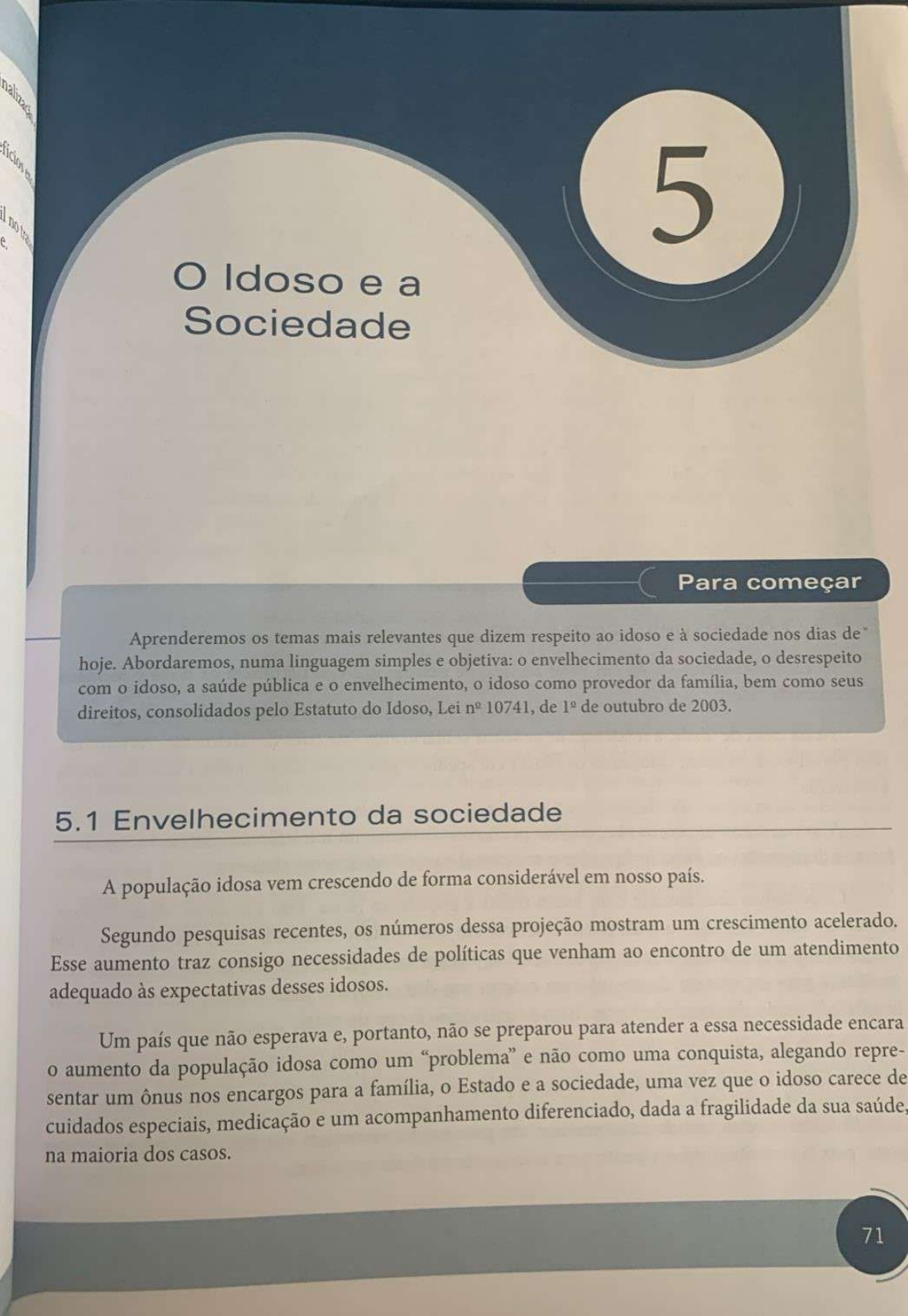 <p>5 O Idoso e a Sociedade Para começar Aprenderemos os temas mais relevantes que dizem respeito ao idoso e à sociedade nos dias de hoje. Abordaremos, numa linguagem simples e objetiva: o envelhecimento da sociedade, o desrespeito com o idoso, a saúde pública e o envelhecimento, o idoso como provedor da família, bem como seus direitos, consolidados pelo Estatuto do Idoso, Lei n° 10741, de 1° de outubro de 2003. 5.1 Envelhecimento da sociedade A população idosa vem crescendo de forma considerável em nosso país. Segundo pesquisas recentes, os números dessa projeção mostram um crescimento acelerado. Esse aumento traz consigo necessidades de políticas que venham ao encontro de um atendimento adequado às expectativas desses idosos. Um país que não esperava e, portanto, não se preparou para atender a essa necessidade encara aumento da população idosa como um "problema" e não como uma conquista, alegando repre- sentar o um ônus nos encargos para a família, o Estado e a sociedade, uma vez que o idoso carece de cuidados especiais, medicação e um acompanhamento diferenciado, dada a fragilidade da sua saúde, na maioria dos casos. 71</p><p>que dobrou nos 50 anos. viu essa expectativa população que Uma tinha em A expectativa 1960 uma expectativa de vida do brasileiro de vida em quase torno de 40 anos viu, em 2003, subir para 70 anos. Mas o provocou esse aumento? que principais fatores o avanço das tecnologias rapidamente e da medicina. e que agora tra- tamento As passou pesquisas a oferecer apontam novas como opções de cura para doenças que matavam podem ser controladas por vários anos. 5.1.1 Envelhecimento da população mundial rápido envelhecimento da população mundial assusta os pesquisadores fato sobre de que o assunto, as ao mesmo tempo em que pode ser um motivo de comemoração, pelo simples vai pessoas podem fazer planos de longo prazo e realizá-los. Esse novo quadro demográfico à sociedade obrigar os ses a transformar os idosos de fardos para a economia em pessoas integradas produtiva, capazes de oferecer mão de obra produtiva comparável à das pessoas de meia-idade. As sociedades terão que se preparar para um mundo que, em 2050, terá o mesmo número de idosos e de As leis que regem a aposentadoria terão que se modificar em função dessa realidade, operando com diminuição de cargas horárias em casos específicos e alongando o tempo previsto de aposentadoria para os trabalhadores, respeitando as leis já existentes, com as mulheres se aposentando com menos tempo de serviço que os homens. 5.1.2 desrespeito com idoso idoso brasileiro sonha em viver ao lado de pessoas que compartilhem os bons e os maus momentos da vida. Nessa faixa de idade, a tendência de se sentir solitário aumenta consideravelmente. As famílias, sem perceberem, acabam colocando os idosos em segundo plano, não dando a eles a atenção devida e merecida. A forma como os idosos são tratados pelos mais jovens, com intolerância e irritação, egoísmo, frieza e desrespeito, os deixa indignados e emocional e psicologicamente abalados. Convivemos diariamente com maus-tratos à população idosa. Eles assumem várias formas: tomemos como exemplo o transporte coletivo, em que o idoso é tratado com indiferença e até xingamentos por parte dos operadores e até dos passageiros, que na correria do dia a dia não têm paciência para esperar os idosos subirem e descerem dos coletivos, mais lentamente em razão da fragilidade ou de alguma deficiência física adquirida ao longo da vida. Uma sociedade que a cada dia percebe um aumento na população idosa não pode continuar a tratar os idosos com indiferença, pois amanhã pode ser você o próximo idoso a ser maltratado. gente, pois já em muito para o crescimento desta idoso contribuíram precisa sair de casa, passear, ver pessoas diferentes em seu dia a dia, para se sentir 72 Evolução e Envelhecimento Humano</p><p>Figura 5.1 Como todo ser humano, o idoso precisa sentir o afeto familiar em seu Com isso, vêm a alegria, o carinho, o respeito e a esperança para uma vida melhor. 5.1.3 Saúde pública e envelhecimento envelhecimento populacional é um dos maiores desafios da saúde pública contemporânea. Esse fenômeno ocorreu inicialmente em países desenvolvidos, mas, mais recentemente, é nos países em desenvolvimento que o envelhecimento da população tem ocorrido de forma mais acentuada. No Brasil, o número de idosos com 60 anos de idade ou mais passou de 3 milhões em 1960 para 7 milhões em 1975 e 14 milhões em 2002, um aumento de 500% em 40 anos, e estima-se que alcançará 32 milhões em 2020. Em países como a Bélgica, por exemplo, foram necessários 100 anos para que a população idosa dobrasse de tamanho. Em paralelo às modificações observadas na pirâmide populacional, doenças próprias do envelhecimento ganham maior expressão no conjunto da sociedade. Um dos resultados dessa dinâmica é uma demanda crescente por serviços de saúde. Aliás, este é um dos desafios atuais: escassez de recursos para uma demanda crescente. idoso consome mais serviços de saúde, as internações hospitalares são mais frequentes, e o tempo de ocupação do leito é maior quando comparado ao de outras faixas etárias. Em geral, as doenças dos idosos são crônicas e múltiplas, perduram por vários anos e exigem acompanhamento constante, cuidados permanentes, medica- ção contínua e exames periódicos. 73 0 Idoso e a Sociedade</p><p>Sem dúvida, um dos maiores feitos da humanidade foi a de ampliação saúde das do populações, tempo de vida, ainda que que Se essas conquistas estejam longe de se distribuir de forma equitativa chegar à velhice, hoje passa a ser a norma. fez acompanhar de uma melhora substancial dos parâmetros nos diferentes países e contextos que era antes o privilégio de poucos, do século XX se transforma, no entanto, em maior mesmo nos países mais pobres. Essa conquista envelhecimento da populaç