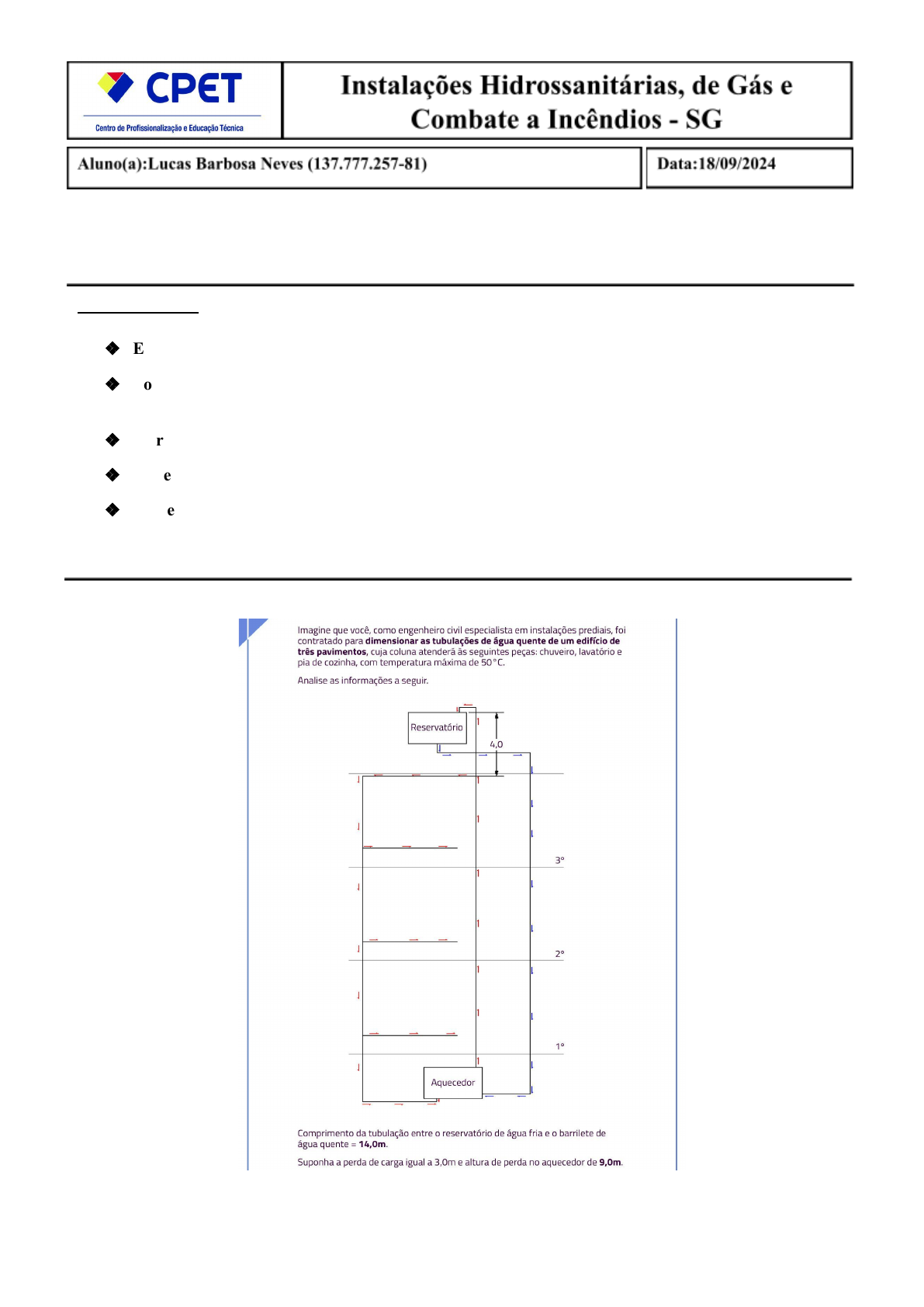 <p>Atividade Prática</p><p>INSTRUÇÕES:</p><p>❖ Esta Atividade contém uma ou mais questões totalizando 10 (dez) pontos;</p><p>❖ Você deve preencher dos dados no Cabeçalho para sua identificação:</p><p>o Nome / Data de entrega.</p><p>❖ As respostas devem ser digitadas abaixo de cada pergunta;</p><p>❖ Ao terminar salve o arquivo no formato PDF ou DOC;</p><p>❖ Envie o arquivo pelo sistema no local indicado;</p><p>O sistema predial de água quente do tipo central coletivo consiste em um equipamento responsável pelo aquecimento da</p><p>água e de uma rede de tubulações que distribuem a água aquecida a conjuntos de aparelhos pertencentes amais de uma</p><p>unidade, por exemplo, um edifício.</p><p>Considere a situação a seguir:</p><p>De acordo com o contexto apresentado, descreva qual material você utilizará no sistema de água quente,</p><p>justificando a sua escolha, e dimensione a coluna d’água.</p><p>Resposta: O material escolhido é o CPVC, pois é resistente à corrosão e outras patologias</p><p>características dos metais, sua instalação é simples porém durável (quando realizada corretamente) e</p><p>não necessita de isolamento térmico, possui superfície lisa proporcionando pouco atrito, além de</p><p>suportar até 80°C.</p><p>Pesos Por Pavimento e Pontos</p><p>● Pia de Cozinha: 0,7;</p><p>● Lavatório: 0,5;</p><p>● Chuveiro: 0,5.</p><p>Peso acumulado por pavimento = 1,7.</p><p>Peso acumulado total= 5,1.</p><p>Q=0,3√5,1 = 0,677 l/s ou 0,000677m³/s</p><p>Altura estática disponível no Barrilete: 4m;</p><p>● C= 150 (cpvc);</p><p>● Comprimento real da tubulação: (14 + 0,5 x 14) = 21m;</p><p>● Perda de carga= 3m;</p><p>● Altura de perda no aquecedor: 9m;</p><p>● Diâmetro encontrado: 27,65mm;</p><p>● Perda contínua de carga em m/s= 4 - 3 = 1mca;</p><p>● Velocidade do fluido: 0,355 x 0,1042 x 0,1983 = 1,10m/s (velocidade mínima).</p><p>● Velocidade máxima: de acordo com os dados presentes no material a valor máximo de</p><p>velocidade permitido é de 2,25 m/s.</p><p>Conclusão: O material escolhido foi o cpvc por sua eficiência e a tubulação com diâmetro interno de</p><p>27,65mm a uma velocidade de 1,10m/s.</p>
