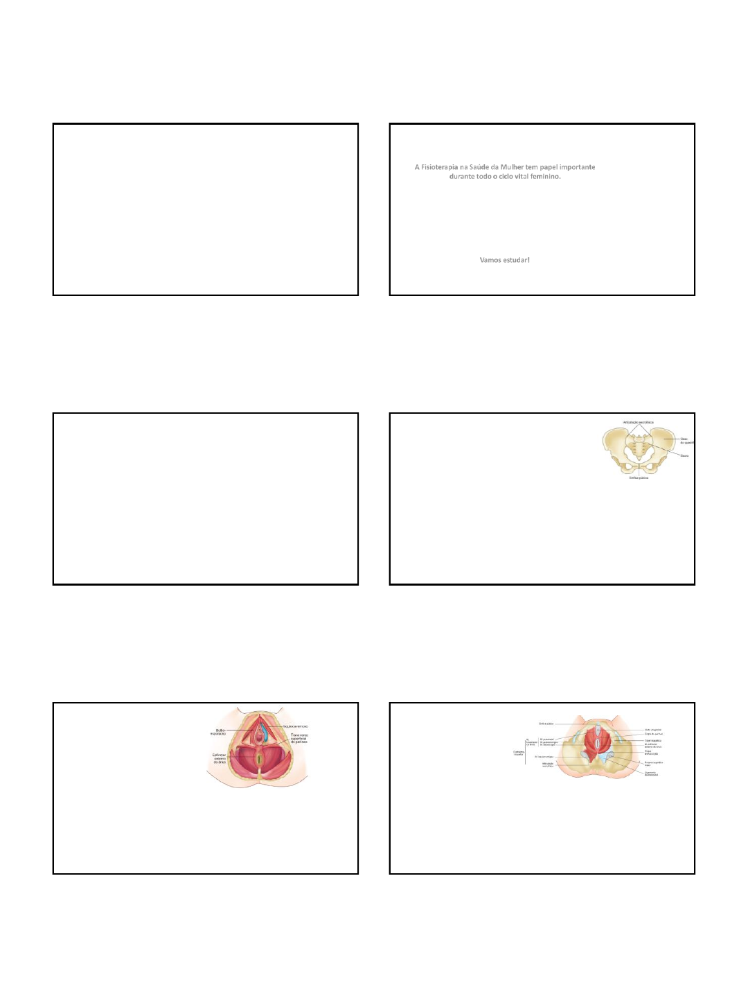 <p>1</p><p>Fisioterapia na Saúde</p><p>da Mulher</p><p>Fisioterapia em Uroginecologia e Disfunções</p><p>Pélvicas Femininas</p><p>Profa. Gabriela Krinski</p><p>Contextualização</p><p>A Fisioterapia na Saúde da Mulher tem papel importante</p><p>durante todo o ciclo vital feminino.</p><p>➢ Na promoção à saúde;</p><p>➢ Prevenção e tratamento de diversas disfunções</p><p>uroginecológicas.</p><p>Vamos estudar!</p><p>Anatomia e Fisiologia do</p><p>Sistema Genitourinário</p><p>Feminino</p><p>Assoalho Pélvico</p><p>Elza, BARACHO,. Fisioterapia Aplicada à Saúde da Mulher. Disponível em:</p><p>Minha Biblioteca, (6th edição). Grupo GEN, 2018.</p><p>Composto por músculos (MAP), fáscias e ligamentos.</p><p>Funções:</p><p>➢ Sustentação de órgãos internos;</p><p>➢ Proporciona ação esfincteriana para uretra, vagina e reto;</p><p>➢ Possibilita a passagem do feto no canal do parto.</p><p>Assoalho Pélvico</p><p>Elza, BARACHO,. Fisioterapia Aplicada à Saúde da Mulher. Disponível em:</p><p>Minha Biblioteca, (6th edição). Grupo GEN, 2018.</p><p>Os MAP são divididos em duas camadas:</p><p>Camada superficial</p><p>➢ Bulboesponjoso</p><p>➢ Isquiocavernoso,</p><p>➢ Transverso superficial e profundo do períneo</p><p>➢ Esfíncter anal externo.</p><p>Assoalho Pélvico</p><p>Elza, BARACHO,. Fisioterapia Aplicada à Saúde da Mulher. Disponível em:</p><p>Minha Biblioteca, (6th edição). Grupo GEN, 2018.</p><p>Os MAP são divididos em duas camadas:</p><p>Camada profunda</p><p>➢ Coccígeo</p><p>➢ Levantador do ânus: puborretal, ilioccocígeo e pubococcígeo</p><p>1 2</p><p>3 4</p><p>5 6</p><p>2</p><p>Arco reflexo miccional</p><p>Fonte: Material didático</p><p>Receptores do músculo detrusor;</p><p>Nervo pélvico (raízes nervosas S2-S4);</p><p>Neurotransmissores (ação parassimpática);</p><p>Contração do músculo detrusor da bexiga.</p><p>Relaxamento do esfíncter uretral interno.</p><p>Rins →</p><p>Ureter →</p><p>Bexiga →</p><p>MICÇÃO</p><p>Arco reflexo miccional</p><p>Fonte: Material didático</p><p>Rins →</p><p>Ureter →</p><p>Bexiga →</p><p>Centro pontino da micção (COM):</p><p>➢ Inibe o reflexo miccional até que voluntariamente haja a micção.</p><p>Neurotransmissores</p><p>(ação simpática);</p><p>Relaxamento do</p><p>músculo detrusor</p><p>da bexiga.</p><p>Contração do</p><p>esfíncter uretral</p><p>interno.</p><p>No momento adequado, ocorre a inibição da ação do CPM</p><p>MICÇÃO</p><p>Incontinência Urinária</p><p>Incontinência Urinária (IU)</p><p>Define-se IU como qualquer perda involuntária de urina.</p><p>➢ A incontinência urinária (IU) é duas vezes mais frequente nas</p><p>mulheres;</p><p>➢ Atinge 30 a 70% das mulheres na pós-menopausa.</p><p>Dentre os tipos de IU, a incontinência urinária de esforço é a</p><p>mais prevalente (86%).</p><p>Fonte: Material didático</p><p>Rins →</p><p>Ureter →</p><p>Bexiga →</p><p>Incontinência Urinária (IU)</p><p>IU de esforço</p><p>Perda urinária involuntária, que</p><p>ocorre após exercício físico,</p><p>risada, tosse ou espirro</p><p>IU de urgência</p><p>Perda urinária acompanhada por</p><p>forte desejo de urinar</p><p>IU mista</p><p>Há, simultaneamente, IU de</p><p>esforço e urgência</p><p>IU inconsciente</p><p>Perda urinária sem urgência ou</p><p>reconhecimento consciente do</p><p>extravasamento.</p><p>Fonte: Material didático</p><p>Rins →</p><p>Ureter →</p><p>Bexiga → Incontinência Urinária</p><p>7 8</p><p>9 10</p><p>11 12</p><p>3</p><p>Situação Problema</p><p>Dona Mariana, 59 anos, relata que após o nascimento da sua filha mais nova, percebe</p><p>perda urinária ao eu tossir, espirrar ou dar gargalhadas, além disso, demonstra</p><p>incômodo pelo desejo miccional ser urgente e repentino.</p><p>➢ Qual é o tipo de IU de Dona Mariana? Justifique.</p><p>Situação Problema</p><p>Qual é o tipo de IU de Dona Mariana? Justifique.</p><p>IU Mista</p><p>Esforço + Urgência</p><p>Tosse e gargalhada Desejo miccional repentino</p><p>Perguntas?</p><p>Disfunções Pélvicas</p><p>Bexiga Hiperativa</p><p>Fonte: Material didático</p><p>Rins →</p><p>Ureter →</p><p>Bexiga →</p><p>Contrações involuntárias do detrusor.</p><p>Sintomas</p><p>Urgência Miccional</p><p>Incontinência Urinária;</p><p>Aumento da frequência urinária</p><p>diurna;</p><p>Noctúria à necessidade de acordar</p><p>para urinar;</p><p>Bexiga Neurogênica</p><p>Fonte: Material didático</p><p>Rins →</p><p>Ureter →</p><p>Bexiga →</p><p>➢ Disfunção vesical por alteração do controle vesicoesfincteriano;</p><p>➢ Disfunção do armazenamento e do esvaziamento da bexiga.</p><p>➢ Acomete portadores de doenças neurológicas.</p><p>Traumatismos</p><p>cranioencefálicos e</p><p>raquimedulares</p><p>Acidente vacular</p><p>encefálico</p><p>Mielomeningocele Paralisia Cerebral</p><p>13 14</p><p>15 16</p><p>17 18</p><p>4</p><p>Bexiga Neurogênica</p><p>Fonte: Material didático</p><p>Rins →</p><p>Ureter →</p><p>Bexiga →</p><p>✓ “Bexigoma” (bexiga grande)</p><p>✓ Pode haver IU por transbordamento ou necessidade de</p><p>sonda vesical de alívio.</p><p>Bexiga hipotônica</p><p>✓ Pequena capacidade de armazenamento</p><p>✓ Aumento da frequência miccional</p><p>✓ Pode haver IU de urgência.</p><p>Bexiga hipertônica</p><p>Prolapso de Órgão Pélvico (POP)</p><p>Berek, Jonathan S. Tratado de Ginecologia. Disponível em: Minha</p><p>Biblioteca, (15th edição). Grupo GEN, 2014.</p><p>Perda do suporte para o útero, a bexiga, o cólon ou o reto;</p><p>Causando prolapso para dentro da vagina.</p><p>Fatores de risco</p><p>✓ Hereditariedade</p><p>✓ N° de gestações</p><p>✓ Tipo de parto</p><p>✓ Tosse crônica</p><p>✓ Obesidade</p><p>✓ Exercício físico de alta intensidade.</p><p>Uterocele</p><p>Prolapso de Órgão Pélvico (POP)</p><p>Berek, Jonathan S. Tratado de Ginecologia. Disponível em: Minha</p><p>Biblioteca, (15th e