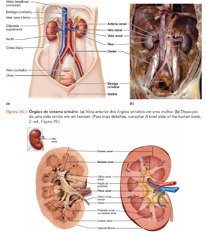 <p>RESUMO DE SISTEMA URINÁRIO – ANATOMIA.</p><p>Rins são os responsáveis pela formação da urina —, os outros órgãos do sistema são: par de ureteres, bexiga urinária e uretra. Os ureteres são tubos que transportam a urina dos rins para a bexiga, que é um reservatório de armazenamento temporário da urina. A uretra e um tubo que transporta urina da bexiga para fora do corpo.</p><p>RINS: os rins são os responsáveis por manter a pureza e a constância químicas do sangue e de outros fluidos corporais extracelulares. Os principais produtos residuais excretados na urina são três compostos nitrogenados:</p><p>1) ureia, derivada da decomposição dos aminoácidos durante a reciclagem</p><p>normal das proteínas corporais;</p><p>2) ácido úrico, que resulta da renovação dos ácidos nucleicos; e</p><p>3) creatinina, formada pela decomposição da fosfocreatina, uma molécula presente no musculo que armazena energia para a produção de trifosfato de adenosina (ATP).</p><p>Embora os pulmões, o fígado e a pele também participem da excreção, os rins são os principais órgãos excretores.</p><p>image1.png</p><p>image2.png</p>