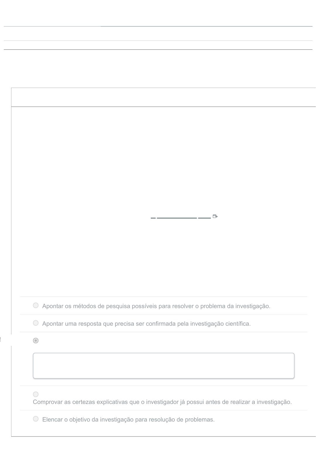 <p>Tentativa Tempo Pontuação</p><p>MAIS RECENTE Tentativa 1 51 minutos 3,6 de 6</p><p>Pontuação deste teste: 3,6 de 6</p><p>Enviado 30 set em 23:20</p><p>Esta tentativa levou 51 minutos.</p><p>0,6 / 0,6 ptsPergunta 1</p><p>Leia o texto a seguir:</p><p>(hi.pó.te.se)</p><p>1. Juízo, opinião, afirmação etc. que se consideram como válidos antes de comprovados,</p><p>ger. us. como ponto de partida para sua demonstração e comprovação (hipótese</p><p>científica)</p><p>2. Fato ou ação que podem vir a ocorrer ou não; EVENTUALIDADE; POSSIBILIDADE:</p><p>Reservei passagens para a hipótese de ter de viajar.</p><p>3. Fil. Teoria para explicar uma certa ordem de fatos, se bem que ainda não demonstrada.</p><p>4. Mat. Conjunto de dados a partir do qual se procura demonstrar um teorema.</p><p>Fonte: HIPOTÉSE. In: Dicionário Aulete Digital. Disponível em: https://aulete.com.br/hipotese . Acesso em: 14 ago. 2023.</p><p>Segundo os estudos sobre o método científico, a elaboração de uma hipótese na pesquisa</p><p>científica deve levar a um teste e deve ser passível de verificação. Ela ajuda no progresso</p><p>científico e na tomada de decisão.</p><p>Acompanhando Pedro Demo em seu livro Introdução à metodologia da ciência (2013),</p><p>qual a mais correta definição para a função da hipótese na pesquisa científica?</p><p>Apontar os métodos de pesquisa possíveis para resolver o problema da investigação.</p><p>Apontar uma resposta que precisa ser confirmada pela investigação científica.</p><p>Levantar possíveis respostas para os problemas que a pesquisa busca investigar. !!</p><p>Alternativa correta. A função da hipótese na pesquisa científica é apresentar possíveis</p><p>explicações e respostas para os problemas de pesquisa levantados pelo investigador, por</p><p>isso se forma no início da elaboração da pesquisa (DEMO, 2013).</p><p>Comprovar as certezas explicativas que o investigador já possui antes de realizar a investigação.</p><p>Elencar o objetivo da investigação para resolução de problemas.</p><p>https://famonline.instructure.com/courses/40805/quizzes/197492/history?version=1</p><p>https://aulete.com.br/hipotese</p><p>https://aulete.com.br/hipotese</p><p>https://aulete.com.br/hipotese</p><p>0,6 / 0,6 ptsPergunta 2</p><p>Observe o exemplo a seguir:</p><p>Fonte: SOUZA, L. Saiba agora o que é um fichamento, como fazer, tipos e modelos com exemplo. TCC Pronto, [s.d.]</p><p>Disponível em: https://tcc-pronto.com/como-fazer-um-fichamento/amp/ . Acesso em: 14 ago. 2023.</p><p>Considerando as informações apresentadas, assinale a opção correta.</p><p>O modelo apresentado é de um fichamento de citação, pois traz o conteúdo de uma obra de</p><p>maneira idêntica ao texto original.</p><p>!!</p><p>Alternativa correta. O fichamento de citação deve destacar trechos da obra fichada</p><p>transcritos literalmente e que foram considerados importantes para citação direta na escrita</p><p>do texto de uma investigação.</p><p>O modelo apresentado é de um fichamento de citação, pois traz a comparação entre duas obras</p><p>sobre um mesmo assunto, mesclando trechos das obras numa ficha.</p><p>O modelo apresentado é de um fichamento de citação, pois traz uma visão crítica do autor que</p><p>está realizando o fichamento de uma obra para posterior consulta.</p><p>O modelo apresentado é de um fichamento de citação, pois há um resumo com as ideias</p><p>principais do autor da obra que será utilizada na construção de outro texto.</p><p>https://tcc-pronto.com/como-fazer-um-fichamento/amp/</p><p>https://tcc-pronto.com/como-fazer-um-fichamento/amp/</p><p>https://tcc-pronto.com/como-fazer-um-fichamento/amp/</p><p>O modelo apresentado é de um fichamento de citação, pois há um resumo objetivo da obra</p><p>fichada e uma análise do conteúdo da mesma para consulta.</p><p>0,6 / 0,6 ptsPergunta 3</p><p>Leia o texto a seguir:</p><p>Marcela está no momento de iniciar a coleta de dados do seu doutorado em Educação. Mas,</p><p>primeiramente, necessita submeter seu projeto ao Comitê de Ética de sua universidade. Ela</p><p>esteve bastante atenta ao preparo do Termo de Consentimento Livre e Esclarecido para que</p><p>os participantes do seu questionário ficassem cientes dos possíveis riscos da pesquisa e que</p><p>também poderiam retirar seu consentimento em qualquer momento da pesquisa.</p><p>Após submeter o projeto na Plataforma Brasil, Marcela teve a resposta que seu projeto tinha</p><p>sido aprovado. Seguindo, ela coletou seus dados, analisou-os e finalizou a escrita de sua</p><p>tese.</p><p>No dia da banca de defesa, uma das arguentes chamou a atenção de Marcela para o seu</p><p>texto, afirmando que, em alguns momentos, ela fazia paráfrases sem indicação de onde</p><p>retirou aquela determinada ideia e afirmou que isso poderia ser considerado plágio.</p><p>Marcela precisou, após sua banca, fazer a leitura completa do texto para perceber onde teria</p><p>feito as paráfrases sem a indicação de autoria, para assim entregar o texto final.</p><p>Considerando as informações apresentadas, assinale a opção correta.</p><p>O termo de consentimento livre e esclarecido é utilizado nas investigações com seres humanos</p><p>para respaldo o investigador e da pesquisa caso algum participante pretenda retirar seu</p><p>consentimento, assim o pesquisador não é prejudicado pela desistência.</p><p>O termo de consentimento livre e esclarecido é a principal maneira de garantir a ética em</p><p>pesquisa, pois garante que o investigador possa realizar qualquer procedimento em prol da</p><p>pesquisa, sem necessariamente esclarecer os pormenores da investigação.</p><p>Além da questão do esclarecimento e da autorização do participante para realização da</p><p>pesquisa, a atitude ética do pesquisador envolve também referenciar os autores utilizados na</p><p>investigação e envolve o compromisso social da investigação.</p><p