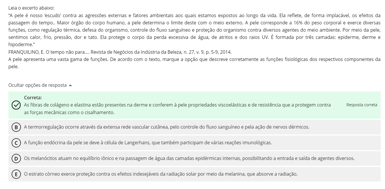 <p>Leia o excerto abaixo: "A pele é nosso contra as agressões externas e fatores ambientais aos quais estamos expostos ao longo da vida. Ela reflete, de forma implacável, os efeitos da passagem do tempo.. órgão do corpo humano, a pele determina limite deste com meio externo. A pele corresponde a 16% do peso corporal e exerce diversas funções, como regulação térmica, defesa do organismo, controle do fluxo sanguíneo e proteção do organismo contra diversos agentes do meio ambiente. Por meio da pele, sentimos calor, frio, pressão, dor e tato. Ela protege corpo da perda excessiva de água, de atritos e dos raios UV. É formada por três camadas: epiderme, derme e hipoderme." FRANQUILINO, E. tempo não para.... Revista de Negócios da Indústria da Beleza, n. 27, V. 9, p. 5-9, 2014. A pele apresenta uma vasta gama de funções. De acordo com o texto, marque a opção que descreve corretamente as funções fisiológicas dos respectivos componentes da pele. Ocultar opções de resposta Correta: As fibras de colágeno e elastina estão presentes na derme e conferem à pele propriedades viscoelásticas e de resistência que a protegem contra Resposta correta as forças mecânicas como B A termorregulação ocorre através da extensa rede vascular cutânea, pelo controle do fluxo sanguíneo e pela ação de nervos C A função endócrina da pele se deve à célula de Langerhans, que também participam de várias reações imunológicas. D Os melanócitos atuam no equilíbrio e na passagem de água das camadas epidérmicas internas, possibilitando a entrada e saída de agentes diversos. E estrato córneo exerce proteção contra os efeitos indesejáveis da radiação solar por meio da melanina, que absorve a radiação.</p>