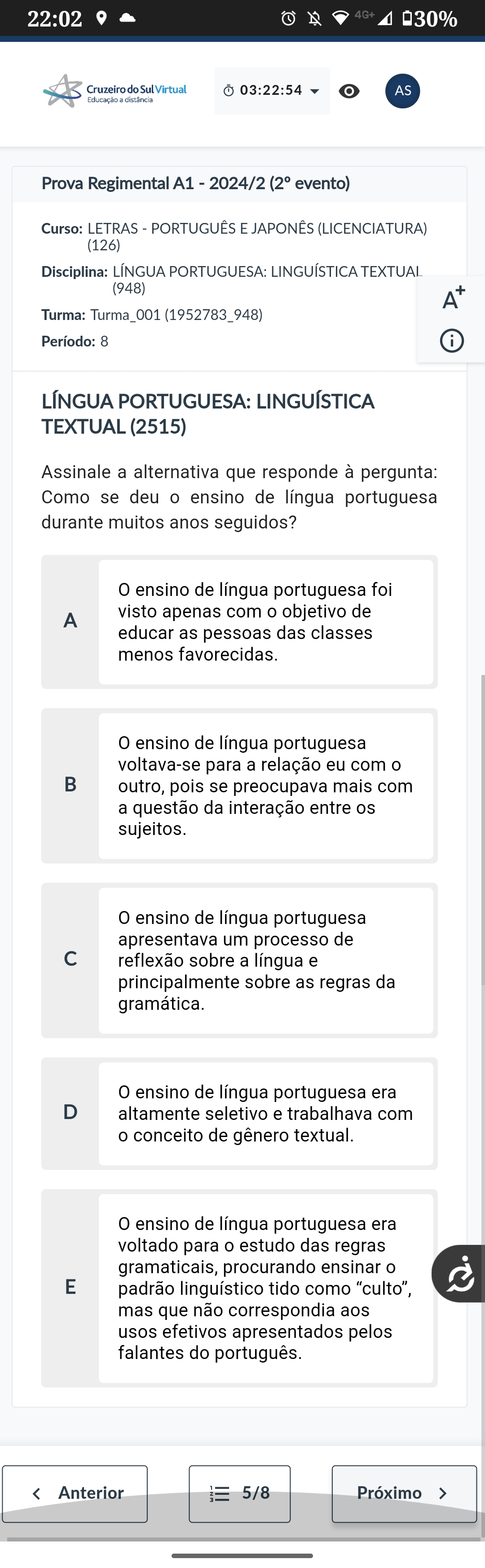 <p>22:02 4G+ Cruzeiro do Sul Virtual 03:22:54 AS Educação distância Prova Regimental A1 - 2024/2 (2° evento) Curso: LETRAS - PORTUGUÊS E JAPONÊS (LICENCIATURA) (126) Disciplina: LÍNGUA PORTUGUESA: LINGUÍSTICA TEXTUAL (948) A+ Turma: Turma_001 (1952783_948) Período: 8 i LÍNGUA PORTUGUESA: LINGUÍSTICA TEXTUAL (2515) Assinale a alternativa que responde à pergunta: Como se deu o ensino de língua portuguesa durante muitos anos seguidos? o ensino de língua portuguesa foi A visto apenas com o objetivo de educar as pessoas das classes menos favorecidas. o ensino de língua portuguesa voltava-se para a relação eu com o B outro, pois se preocupava mais com a questão da interação entre os sujeitos. o ensino de língua portuguesa apresentava um processo de C reflexão sobre a língua e principalmente sobre as regras da gramática. ensino de língua portuguesa era D altamente seletivo e trabalhava com o conceito de gênero textual. o ensino de língua portuguesa era voltado para o estudo das regras gramaticais, procurando ensinar o E padrão linguístico tido como "culto", mas que não correspondia aos usos efetivos apresentados pelos falantes do português.</p>