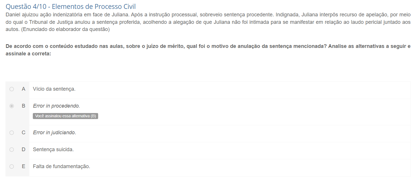 <p>Questão 4/10 - Elementos de Processo Civil Daniel ajuizou ação indenizatória em face de Juliana. Após a instrução processual, sentença procedente. Indignada, Juliana interpôs recurso de apelação, por meio do qual Tribunal de Justiça anulou a sentença proferida, acolhendo a alegação de que Juliana não foi intimada para se manifestar em relação ao laudo pericial juntado aos autos. (Enunciado do elaborador da questão) De acordo com o conteúdo estudado nas aulas, sobre juízo de mérito, qual foi motivo de anulação da sentença mencionada? Analise as alternativas a seguir e assinale a correta: A Vício da sentença. B Error in procedendo. Você assinalou essa alternativa (B) C Error in judiciando. D Sentença suicida. E Falta de fundamentação.</p>