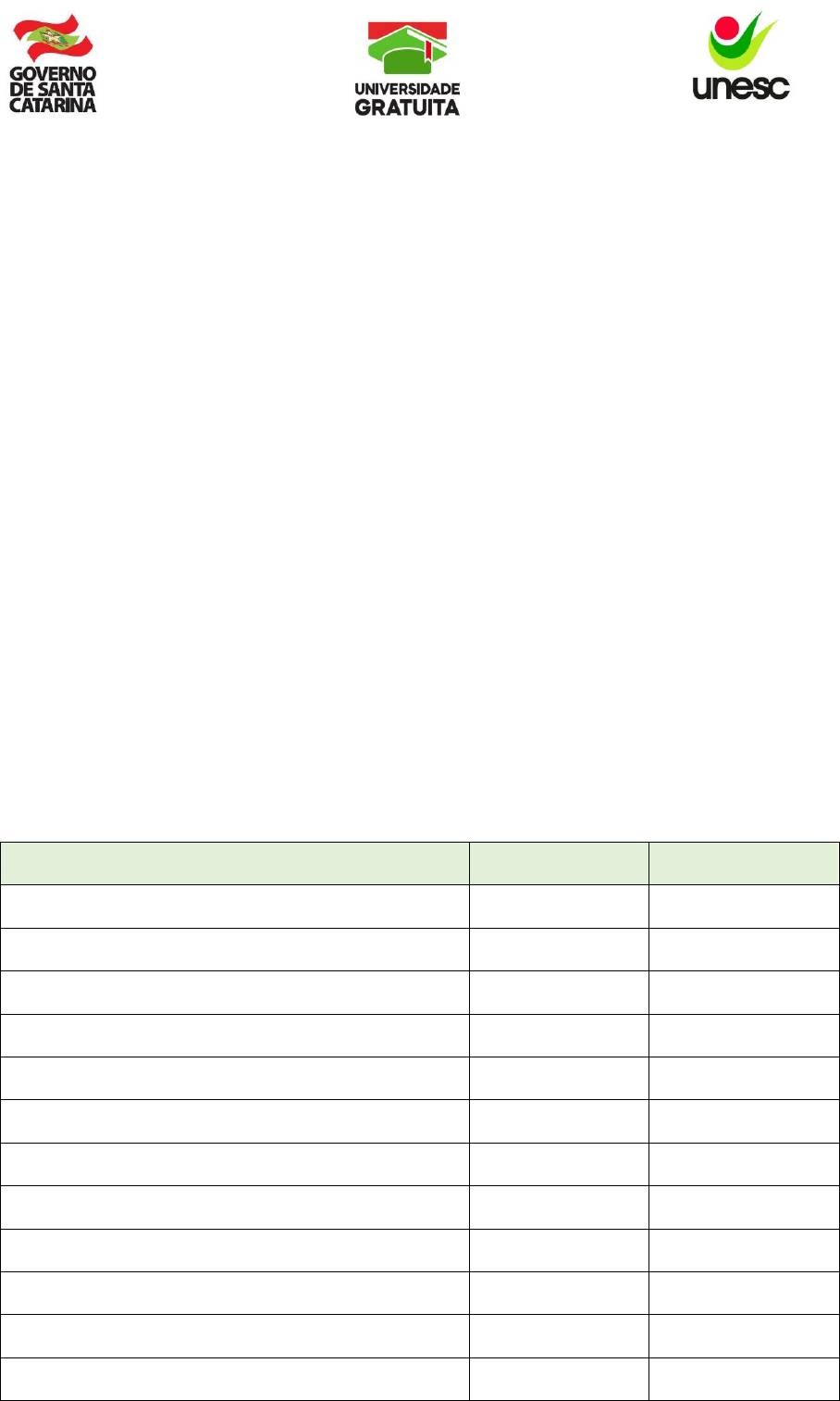 <p>1 / 58</p><p>UNIVERSIDADE DO EXTREMO SUL CATARINENSE – UNESC</p><p>EDITAL n. 177/2024</p><p>Divulga a retificação do item 1.1.1 da relação dos beneficiados do</p><p>Programa Universidade Gratuita, da Secretaria de Estado da</p><p>Educação (SED), na Universidade do Extremo Sul Catarinense –</p><p>UNESC, para o 1º semestre de 2024, referente ao Edital de</p><p>Abertura n. 119/2024/Reitoria, publicado no edital n.176/2024.</p><p>A Universidade do Extremo Sul Catarinense – UNESC – mantida pela FUNDAÇÃO</p><p>EDUCACIONAL DE CRICIÚMA – FUCRI, pessoa jurídica de direito privado, por sua Reitora, no</p><p>uso de suas atribuições e de acordo com a legislação em vigor, divulga a retificação do item 1.1.1</p><p>- Edital n. 176/2024, da relação dos beneficiados do Programa Universidade Gratuita, em</p><p>atendimento ao disposto na Lei Complementar nº 831, de 31 de julho de 2023, Lei Complementar</p><p>nº 853, de 11 de janeiro de 2024, Decreto nº 219, de 2 de agosto de 2023, Decreto nº 450, de 29</p><p>de janeiro de 2024, Edital 607/2024/SED e demais legislações correlatas em vigor.</p><p>1. DO RESULTADO</p><p>1.1. Conforme determina o item 9, do Edital 607/2024/SED e o Edital n. 119/2024/REITORIA, a</p><p>Comissão de Seleção do Programa Universidade Gratuita no âmbito da UNESC, divulga o</p><p>resultado da relação dos beneficiados pelo Programa Universidade Gratuita, discriminados por</p><p>ordem decrescente de IC – Índice de carência, no âmbito da UNESC, para o 1º semestre de 2024:</p><p>1.1.1. Relação alunos beneficiados com a continuidade (renovação) do benefício concedido pelo</p><p>Programa Universidade Gratuita por ordem decrescente de IC - índice de carência:</p><p>NOME CURSO ÍNDICE DE CARÊNCIA</p><p>KAROLINE MENDES GONÇALVES ENFERMAGEM 4.560,606060</p><p>DAIANE ROSA DA SILVA EDUCAÇÃO FÍSICA 2.980,000000</p><p>STHEFANY CARVALHO DE MEDEIROS ENFERMAGEM 1.893,333333</p><p>GISELE POSSAMAI LUCIETTI PSICOLOGIA 1.775,000000</p><p>LETÍCIA MIGUEL LINO ENFERMAGEM 1.620,000000</p><p>MARIA HELENA RESENA ROCHA FARMÁCIA 1.620,000000</p><p>LAURA CRISTINA MONTEIRO PADILHA</p><p>PROCESSOS</p><p>GERENCIAIS</p><p>1.266,666666</p><p>LUIZ HENRIQUE TOPANOTTI MORETTI ENFERMAGEM 1.100,775193</p><p>MARIANA FERNANDES OSÓRIO ODONTOLOGIA 927,710843</p><p>PEDRO HENRICK DA SILVA DESIGN DE MODA 4,590488</p><p>GABRIEL PERUCHI</p><p>CIÊNCIAS</p><p>BIOLÓGICAS</p><p>4,305949</p><p>MONIQUE CONSONI DA SILVA FISIOTERAPIA 3,414558</p><p>2 / 58</p><p>NOME CURSO ÍNDICE DE CARÊNCIA</p><p>VINICIUS DE AGUIAR GUETENER ADMINISTRAÇÃO 2,901098</p><p>MAX CAZUZA LOPES PSICOLOGIA 2,840000</p><p>STÉFANY DA ROSA DANIEL BIOMEDICINA 2,594995</p><p>KARINA PIRES DOS SANTOS EDUCAÇÃO FÍSICA 2,469565</p><p>GABRIEL MARCELINO BRISTOT</p><p>ARQUITETURA E</p><p>URBANISMO</p><p>2,440000</p><p>GABRIELLI KERBER DE OLIVEIRA PSICOLOGIA 2,440000</p><p>DULCE GOMES FAGUNDES</p><p>CIÊNCIAS</p><p>CONTÁBEIS</p><p>2,175000</p><p>VINICIO BORGES BITENCOURT DIREITO 2,160056</p><p>KAUÊH VITALI BENTO</p><p>CIÊNCIA DA</p><p>COMPUTAÇÃO</p><p>2,143272</p><p>RAFAEL CAETANO GONÇALVES NUTRIÇÃO 2,123763</p><p>PAULA RIBEIRO COSTA DIREITO 2,113600</p><p>DANIEL MAGNUM NUNES COSTA DIREITO 2,103703</p><p>JULIA GUIMARÃES PEREIRA BIOMEDICINA 2,030303</p><p>VITOR GUSTAVO DOS REIS PASSIA ENGENHARIA CIVIL 2,019379</p><p>SARA DE LIMA MOREIRA FISIOTERAPIA 1,980019</p><p>AMANDA GEREMIAS PERUCHI BIOMEDICINA 1,879380</p><p>ANA JULIA MAIATE VIEIRA PSICOLOGIA 1,869688</p><p>ANA BEATRIZ MORENO DE OLIVEIRA DIREITO 1,863488</p><p>DHJEINIFER XAVIER PRA</p><p>CIÊNCIAS</p><p>CONTÁBEIS</p><p>1,859047</p><p>ALICE TISCOSKI TOMASI BIOMEDICINA 1,791017</p><p>BEATRIZ FELISBINO MENDES PSICOLOGIA 1,685222</p><p>RENATA SOARES DOS SANTOS DIREITO 1,679284</p><p>CLARA FERREIRA GOMES MEDICINA 1,664305</p><p>GUILHERME AUGUSTO CAMPOS TODESCHINI ODONTOLOGIA 1,626666</p><p>HIGOR ANTONIO DA CRUZ MEDEIROS PSICOLOGIA 1,626666</p><p>KAMILA MOTA DE OLIVEIRA ODONTOLOGIA 1,606666</p><p>ENDRIO FRASSON DA SILVA DIREITO 1,565010</p><p>CAROLINE INÁCIO MEZZARI FISIOTERAPIA 1,557914</p><p>3 / 58</p><p>NOME CURSO ÍNDICE DE CARÊNCIA</p><p>ALYSSON GUILHERME SANTOS DA SILVA ADMINISTRAÇÃO 1,539676</p><p>MARIA EDUARDA MONTEIRO MATEUS</p><p>CIÊNCIAS</p><p>BIOLÓGICAS</p><p>1,515561</p><p>KEVEN WILLIANS SCHARTTZ DE MELO</p><p>CIÊNCIA DA</p><p>COMPUTAÇÃO</p><p>1,502721</p><p>ALICE RAMOS DOS SANTOS BIOMEDICINA 1,493333</p><p>LEONARDO RUCHERT DA SILVA DIREITO 1,493333</p><p>THAYNA VITÓRIA LUCIANO FALCÃO NUTRIÇÃO 1,493333</p><p>NATALYA SPRICIGO MADALENA FISIOTERAPIA 1,487383</p><p>THAMILY VENANCIO ERENO ODONTOLOGIA 1,453826</p><p>ANA CLARA STEFFENS BIOMEDICINA 1,426900</p><p>CÍNTIA BITENCOURT ELIAS FISIOTERAPIA 1,421417</p><p>RAMON RICHARD DO NASCIMENTO BENTO DIREITO 1,406896</p><p>JOICE ALVES DE ARAUJO DIREITO 1,406896</p><p>RAFAELA SEBASTIAO PEDAGOGIA 1,384790</p><p>LUCAS VIANA VITALI ENGENHARIA CIVIL 1,367405</p><p>ELVIS PREIS ANACLETO DIREITO 1,365411</p><p>RAFAEL CACIATORI TOMAZ EDUCAÇÃO FÍSICA 1,362500</p><p>BIANCA MATIAS DA ROCHA DIREITO 1,360000</p><p>ARIANE CRISTINA DUARTE RODRIGUES</p><p>CIÊNCIAS</p><p>CONTÁBEIS</p><p>1,357575</p><p>ISABELLA MARTINE JACOB PSICOLOGIA 1,355555</p><p>BRENDA ALVES PEREIRA PSICOLOGIA 1,347565</p><p>JOICE OLIVEIRA BORGES FARMÁCIA 1,344005</p><p>MATHEUS DA SILVA AGUIAR DIREITO 1,339393</p><p>JUÇARA DE CASSIA BARBOSA</p><p>LETRAS-LÍNGUA</p><p>PORTUGUESA</p><p>1,331953</p><p>BRUNO MICHELS ALVES</p><p>CIÊNCIA DA</p><p>COMPUTAÇÃO</p><p>1,331765</p><p>MARILEIA PACAGNAN LANGER ARCENO PSICOLOGIA 1,324137</p><p>ALICE GOMES DA SILVA ODONTOLOGIA 1,322425</p><p>LUÍS GABRIEL DAL MOLIN GAVA</p><p>ENGENHARIA</p><p>MECÂNICA</p><p>1,313012</p><p>CLEANDRY FENALI MORGEROT</p><p>ARQUITETURA E</p><p>URBANISMO</p><p>1,300754</p><p>4 / 58</p><p>NOME CURSO ÍNDICE DE CARÊNCIA</p><p>ANA LUIZA OLIVEIRA ANTUNES EDUCAÇÃO FÍSICA 1,290811</p><p>VITÓRIA PINTO MENDES PSICOLOGIA 1,290122</p><p>CAMILA BARBOSA DA SILVA ED