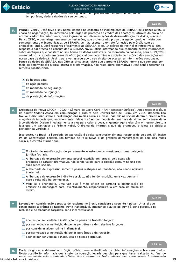 <p>Estácio ALEXANDRE CARDOSO FERREIRA Voltar 202007308271 / ARA0164 em pror 00 dada a rigidez de seu 1,25 pts. 5. (VUNESP/2019) José teve seu nome inserido no cadastro de inadimplente do SERASA pelo Banco XPTO. À época da negativação, foi informado pelo órgão de proteção ao crédito das anotações, através do envio de Posteriormente, José ingressou com diversas ações de desconstituição de dívida, contra Banco XPTO, o qual alega, em suas contestações, que cliente não prova alegado, tendo em vista que somente juntou do sem apresentar extrato fornecido pelo órgão com as Então, José requereu oficialmente ao SERASA, seu chistórico de restrições Em resposta à solicitação do consumidor, SERASA enviou ofício informando que ¿somente presta informações sobre anotações que constem no seu banco de dados cadastrais, no momento da consulta, para CPF/CNPJ consultado (...), exceto em casos de ofício judicial que determine a exibição de histórico das anotações em nossa base de Assim, para ver assegurado seu direito de acessar as informações contidas no banco de dados do SERASA, nos últimos cinco anos, visto que próprio SERASA informa que somente por meio de determinação judicial presta tais informações, não resta outra alternativa a José senão recorrer ao remédio constitucional do habeas data. da ação popular. do mandado de segurança. do mandado de injunção. da prestação de informações. 1,25 pts. 6. (Adaptada da Prova CPCON - 2020 Câmara de Cerro RN Assessor Jurídico). Após receber título de doutor honoris causa em comunicação e cultura pela Universidade de Turim, em 2015, Umberto Eco trouxe a discussão sobre a proliferação das sociais e disse: ¿As sociais deram direito à fala a legiões de imbecis que, anteriormente, falavam no bar, depois de uma taça de vinho, sem causar dano à coletividade. Diziam imediatamente a eles para calar a boca, enquanto agora eles têm mesmo direito à fala que um ganhador do Prêmio Nobel. O drama da internet é que ela promoveu idiota da aldeia a portador da Isso posto, no Brasil, a liberdade de expressão é direito constitucionalmente reconhecido pelo Art. inciso IV, da Constituição Federal. Em tempos de Fake News e de grandes demonstrações de ódio nas redes sociais, é correto afirmar que: direito de manifestação do pensamento é estanque e considerado uma categoria jurídica A liberdade de expressão somente possui restrição em jornais, pois estes são produtos de caráter informativo, não sendo válido para cidadão comum no uso das suas redes sociais. A liberdade de expressão somente possui restrições na realidade, não sendo aplicada à A liberdade de expressão é direito absoluto, não tendo restrição, uma vez que sem esse direito não há democracia. Veda-se anonimato, uma vez que é meio eficaz de permitir a identificação do emissor da mensagem para, eventualmente, responsabilizá-lo em caso de abuso de 1,25 pts. 7. Levando em consideração a prática do rascismo no Brasil, considere a seguinte hipótse: Uma lei que considerasse a prática de racismo crime sujeitando autor do crime à pena perpétua de reclusão e de trabalhos forçados, seria inconstitucional apenas por ser vedada a instituição de penas de trabalho forçado. por ser vedada a instituição de penas perpétuas e de trabalhos forçados. por considerar algum crime inafiançável. por ser vedada a instituição de penas perpétuas e de reclusão. apenas por ser vedada a instituição de penas perpétuas. 1,25 pts. 8. Maria dirigiu-se a determinado órgão público com a finalidade de obter informações sobre seus Nesta ocasião foi informada que a referida operação levaria dez dias para que fosse realizada. Ao final do A 3/4</p>
