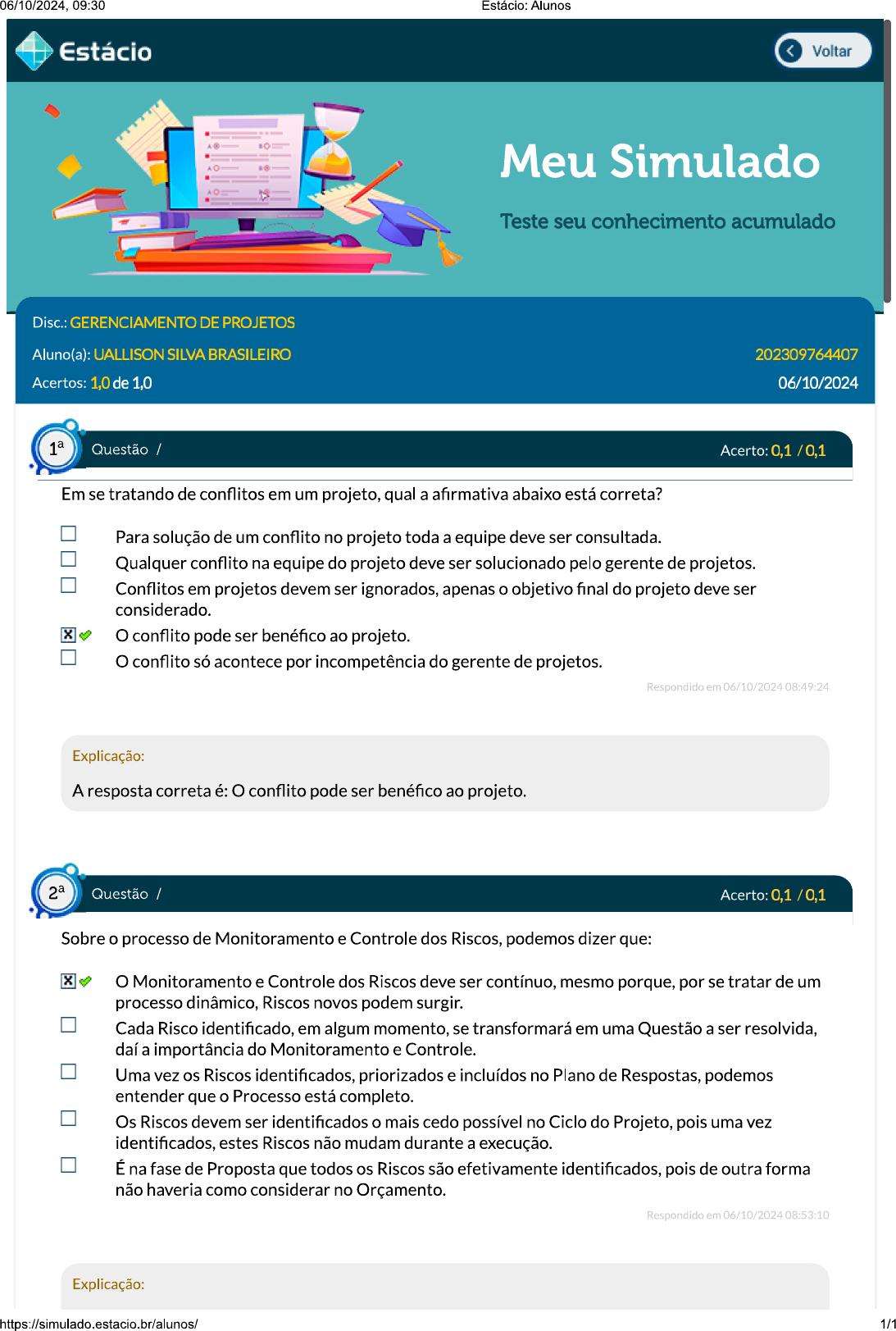 <p>06/10/2024, 09:30 Estácio: Alunos Estácio Voltar Meu Simulado Teste seu conhecimento acumulado Disc.: GERENCIAMENTO DE PROJETOS Aluno(a): UALLISON SILVA BRASILEIRO 202309764407 Acertos: 1,0 de 1,0 06/10/2024 Questão / Acerto: Em se tratando de conflitos em um projeto, qual a afirmativa abaixo está correta? Para solução de um conflito no projeto toda a equipe deve ser consultada. Qualquer conflito na equipe do projeto deve ser solucionado pelo gerente de projetos. Conflitos em projetos devem ser ignorados, apenas o objetivo final do projeto deve ser considerado. O conflito pode ser benéfico ao projeto. O conflito só acontece por incompetência do gerente de projetos. Respondido em 06/10/2024 08:49:24 Explicação: A resposta correta é: O conflito pode ser benéfico ao projeto. Questão / Acerto: Sobre o processo de Monitoramento e Controle dos Riscos, podemos dizer que: O Monitoramento e Controle dos Riscos deve ser contínuo, mesmo porque, por se tratar de um processo dinâmico, Riscos novos podem surgir. Cada Risco identificado, em algum momento, se transformará em uma Questão a ser resolvida, daí a importância do Monitoramento e Controle. Uma vez os Riscos identificados, priorizados e incluídos no Plano de Respostas, podemos entender que o Processo está completo. Os Riscos devem ser identificados o mais cedo possível no Ciclo do Projeto, pois uma vez identificados, estes Riscos não mudam durante a execução. É na fase de Proposta que todos os Riscos são efetivamente identificados, pois de outra forma não haveria como considerar no Orçamento. Respondido em 06/10/2024 08:53:10 Explicação: https://simulado.estacio.br/alunos/ 1/1</p>