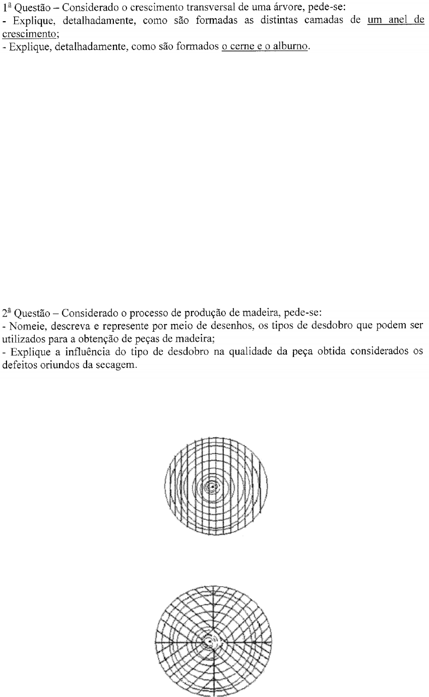 <p>R.A: As árvores podem ser classificadas conforme sua germinação e crescimento em:</p><p>Endógenas: De germinação e crescimento interno. O desenvolvimento transversal do caule se processa de dentro para fora; a parte externa do lenho é a mais antiga e endurecida. Exemplo: palmeiras e bambus.</p><p>Exógenas: De germinação e crescimento externo. O desenvolvimento transversal do caule se processa de fora para dentro com adições de novas camadas concêntricas de células formando os anéis de crescimento. Exemplo: Peroba, cedro e angelim.</p><p>R.B: À medida que a árvore cresce, as partes internas distanciam-se do câmbio. Assim o cerne é formado e ampliado pela alteração das células que pertenciam ao alburno (parte mais antiga do lenho). Essas células, a medida que perdem suas atividades vitais, sofrem alterações, ocorrendo o espessamento das paredes.</p><p>R.A: Os principais tipos de desdobro são:</p><p>Desdobro normal: quando o desdobro ocorre em pranchas paralelas;</p><p>Desdobro radial: quando o desdobro em pranchas retiradas normalmente aos anéis de crescimento.</p><p>R.B: O desdobro radial produz peças de melhor qualidade, pois exibem menor contração na secagem e maior homogeneidade de superfície. No entanto possui um alto custo em relação ao desdobro normal.</p><p>R.A: Como a madeira estava seca ao ar quando saiu de Nova Andradina-MS, a sua umidade era de 19%. No transporte, provavelmente, esta umidade variou até o ponto de 15% quando chegou no destino, que é a umidade de equilíbrio de Cascavel. Este 4% de umidade a qual a madeira perdeu é água de impregnação, sendo que a madeira perdeu toda a água livre ainda em Nova Andradina. Além disso, é claro, a água de constituição está presente.</p><p>R.B: Não é necessário, pois os pranchões chegarão com umidade adequada.</p><p>R.: Desvio de veio: Ocorre quando há um afastamento angular das fibras em relação ao eixo vertical do tronco.</p><p>Fibras torcidas: Resultam de uma orientação anormal das células lenhosas, que se distribuem segundo uma espiral em torno da medula.</p><p>Estes defeitos alteram consideravelmente a resistência das peças e são responsáveis pelo empeno em forma de arco ou hélice.</p><p>R.A: Os três principais componentes do vidro são:</p><p>Sílica ou óxido de silício (SiO2): Matéria-prima básica cuja função é vitrificante. Pelo resfriamento, este constituinte endurece sem cristalizar;</p><p>Óxido de sódio (Na2O): Tem por finalidade baixar o ponto de fusão da sílica;</p><p>Óxido de cálcio (CaO): Dá estabilidade ao vidro contra os ataques de agentes atmosféricos, dando estabilidade química ao vidro.</p><p>R.B: O vidro fundido corre para um banho de flutuação. Sob atmosfera devidamente controlada a faixa de vidro flutua num banho de estanho fundido, o que lhe confere perfeita planimetria das faces, seguida de um processo de polimento a quente na superfície.</p><p>R.: Vidros aramados, cujo processo consiste em fazer passar o vidro em fusão juntamente com a malha metálica, através de um par de rolos de tal forma que a malha metálica fique no centro do vidro.</p><p>Possui grande resistência ao fogo, além de reduzir o risco de acidentes visto que quando quebra não estilhaça, pois os fragmentos mantêm-se presos à tela metálica. O uso comum para este vidro é em passagens e saídas de incêndio.</p><p>R.: Termorefletores: São fabricados aplicando-se numa das faces do vidro float uma camada de metal suficientemente fina para ser transparente, com o objetivo de refletir/bloquear o calor que incide no vidro.</p><p>Termoabsorventes: São produzidos pela introdução de óxidos metálicos na massa do vidro, que produzem cores diversas, com o objetivo de aumentar no vidro a absorção ao calor.</p><p>R.A: Tintas resistentes ao calor: formuladas com veículos á base de siliconas, pigmentos estáveis ao calor e pós metálicos, que evitam a película venha a empolar ou apresentar bolhas.</p><p>Tintas inibidoras do desenvolvimento de organismos: Os veículos e pigmentos contém substâncias tóxicas à fungos, algas, mariscos etc.</p><p>R.B: Durabilidade: Indica o tempo que a tinta irá resistir à ação das intempéries sem apresentar perda da capacidade de proteção do substrato, perda de brilho, desbotamento etc.</p><p>Aplicabilidade: Indica a facilidade de espalhamento e nivelamento, ou seja, o desaparecimento das marcas do pincel deixando uma película uniforme.</p><p>R.: O processo de fabricação das tintas ocorre da seguinte forma:</p><p>1- Pesagem: Pesagem dos materiais líquidos para o veículo da tinta;</p><p>2- Pré-mistura: É colocado uma pequena quantidade de veículo em um grande misturador mecânico, adicionado gradualmente o pigmento pulverizado, resultando em uma pasta homogênea de pigmento e veículo;</p><p>3- Trituração ou moagem: Coloca-se a pasta em um moinho ou triturador para dispersar as partículas de pigmento e distribuí-las uniformemente pelo veículo;</p><p>4- Diluição e secagem: A pasta moída é derramada em um tanque. Onde é misturada mecanicamente com mais veículo, solventes e secantes;</p><p>5- Teste de cor e qualidade: Uma amostra da tinta é enviada para o laboratório de controle de qualidade da fábrica, que irá testar a cor e qualidade;</p><p>6- Tintagem: Uma pequena quantidade de pigmento é adicionada à tinta para conferir-lhe a cor exata e o brilho desejado;</p><p>7- Embalagem: A tinta é despejada em um tanque que irá encher as latas com a quantidade exata.</p><p>R.: Moldagem por injeção: O material polimérico é amolecido em um compartimento aquecido, em seguida o material é injetado sob alta pressão em um molde com temperatura mais baixa. Em seguida o molde é aberto e o material é ejetado.</p><p>Moldagem por compressão: A parte superior do molde desce e comprime a resina plástica. A pressão e o calor amolecem a resina e o plástico é forçado a encher as cavidades do molde. O ma
