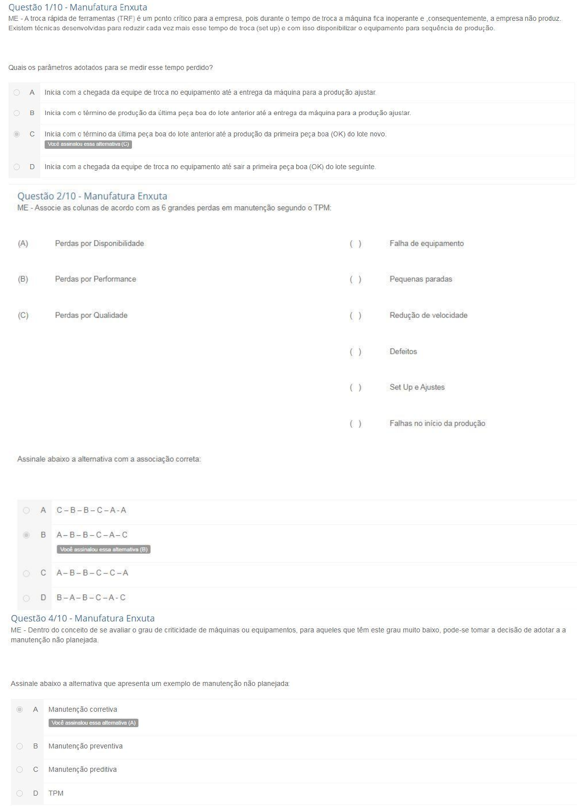 <p>Questão 1/10 Manufatura Enxuta ME A troca rápida de ferramentas (TRF) é um ponto crítico para a empresa, pois durante o tempo de troca a máquina fica inoperante e a empresa não produz. Existem técnicas desenvolvidas para reduzir cada vez mais esse tempo de troca (set up) e com isso disponibilizar equipamento para sequência de produção. Quais os parâmetros adotados para se medir esse tempo perdido? A Inicia com a chegada da equipe de troca no equipamento até a entrega da máquina para a produção ajustar. B Inicia com o término de produção da última peça boa do lote anterior até a entrega da máquina para a produção ajustar. C Inicia com o término da última peça boa do lote anterior até a produção da primeira peça boa (OK) do lote Você assinalou essa alternativa (C) D Inicia com a chegada da equipe de troca no equipamento até a primeira peça boa (OK) do lote seguinte. Questão 2/10 Manufatura Enxuta ME - Associe as colunas de acordo com as 6 grandes perdas em manutenção segundo o TPM: (A) Perdas por Disponibilidade ( ) Falha de equipamento (B) Perdas por Performance ( ) Pequenas paradas (C) Perdas por Qualidade ( ) Redução de velocidade ( ) Defeitos ( ) Set Up e Ajustes ( ) Falhas no início da produção Assinale abaixo a alternativa com a associação correta: A C-B-B-C-A-A B Você assinalou essa alternativa (B) C B-A-B-C-A-C Questão 4/10 Enxuta ME - Dentro do conceito de se avaliar o grau de criticidade de máquinas ou equipamentos, para aqueles que têm este grau muito baixo, pode-se tomar a decisão de adotar a a manutenção não planejada. Assinale abaixo a alternativa que apresenta um exemplo de manutenção não planejada: A Manutenção corretiva Você assinalou essa alternativa (A) B Manutenção preventiva C Manutenção preditiva D TPM</p><p>Questão 5/10 Manufatura Enxuta ME As falhas humanas, além de evitáveis, são significativas e podem ser classificadas de acordo com a circunstância em que ocorrem. Como são classificadas as falhas motivadas por falta de aptidão, habilidade ou conhecimento? A Falhas técnicas Você assinalou essa alternativa (A) B Falhas por inadvertência C Falhas premeditadas D Falhas ordinárias Questão 6/10 Manufatura Enxuta ME A metodologia de Troca Rápida de Ferramentas (SMED), foi desenvolvida por Sigueo Shingo, à partir do estudo de prensas na Toyota, identificando muitas fontes de durante o setup das consultor então definiu dois tipos específicos de setup. Como ele denominou o tipo de setup que ocorre com a máquina em funcionamento? A Interno B Externo Você assinalou essa alternativa (B) Misto D Alternativo E Comum Questão 7/10 Manufatura Enxuta ME Um programa Kaizen bem planejado é dividido em três segmentos, de acordo com a orientação definida para ele. Qual é a característica do segmento "orientado para o grupo"? A Consiste nas ações voltadas para o aprimoramento das questões estratégicas da organização e para as melhorias no desenvolvimento dos processos e projetos. B Procura desenvolver o processo de resolução de problemas dentro da organização, atentando para as necessidades de melhoria, com a execução da análise dos problemas, com a identificação das causas que são a raiz dos problemas e ainda com a implantação e avaliação das soluções encontradas. Você assinalou essa alternativa (B) C Visa desencadear melhorias para os Nesse segmento as ações são direcionadas para uma maior satisfação do colaborador em relação a seu local de bem como se voltam para aperfeiçoamento dos procedimentos, para a segurança pessoal D consiste nas ações voltadas para o aperfeiçoamento das questões levantadas pelo próprio grupo de trabalho, dentro da organização e para as melhorias no desenvolvimento dos processos e projetos.</p><p>Questão 8/10 Manufatura Enxuta ME Associe as colunas de acordo com as 6 grandes perdas em manutenção segundo o TPM: (A) Perdas por Disponibilidade ( ) Falha de equipamento (B) Perdas por Performance ( ) Pequenas paradas (C) Perdas por Qualidade ( ) Redução de velocidade ( ) Defeitos ( ) Set Up e Ajustes ( ) Falhas no início da produção Assinale abaixo a alternativa com a associação correta: A B Você assinalou essa (B) C D B-A-B-C-A-C Questão 9/10 - Manufatura Enxuta ME A Manutenção Produtiva Total ou TPM (Total Productive Maintenance), filosofia japonesa que busca maior eficiência da manutenção produtiva, por meio de um sistema baseado no respeito individual e na total participação dos empregados, inclui programas de manutenção preventiva e preditiva e hoje, um papel importantissimo na indústria, sendo amplamente utilizada como um poderoso instrumento para a redução dos custos e aumento da produtividade. Assinale a alternativa que define o objetivo da Manutenção Produtiva Total (TPM). A Demonstrar os métodos para um perfeito alinhamento de eixos rotativos dentro de tolerâncias específicas. B A redução de quebra dos equipamentos, redução do tempo de espera e de setup, através de uma maior participação e comprometimento de todos os funcionários da empresa, buscando uma maior confiabilidade do sistema. Você assinalou (B) C Aumentar a confiabilidade de máquinas que utilizam identificando e corrigindo problemas de desbalanceamento, diferenciandoos de outros problemas por meio do monitoramento de vibração e da análise de fase D Conhecimento das características normais de operação dos rolamentos e dos principais tipos de suas correções e</p><p>Questão 10/10 - Manufatura Enxuta ME A metodologia de Troca Rápida de Ferramentas (SMED), foi desenvolvida por Sigueo Shingo, à partir do estudo de prensas na Toyota, identificando muitas fontes de desperdícios durante setup das o consultor então definiu dois tipos específicos de setup. Analise as ações que normalmente realizadas durante o setup de máquinas abaixo, procurando identificar quais são internas (I) ou externas (E): Pré-aquecimento do conjunt