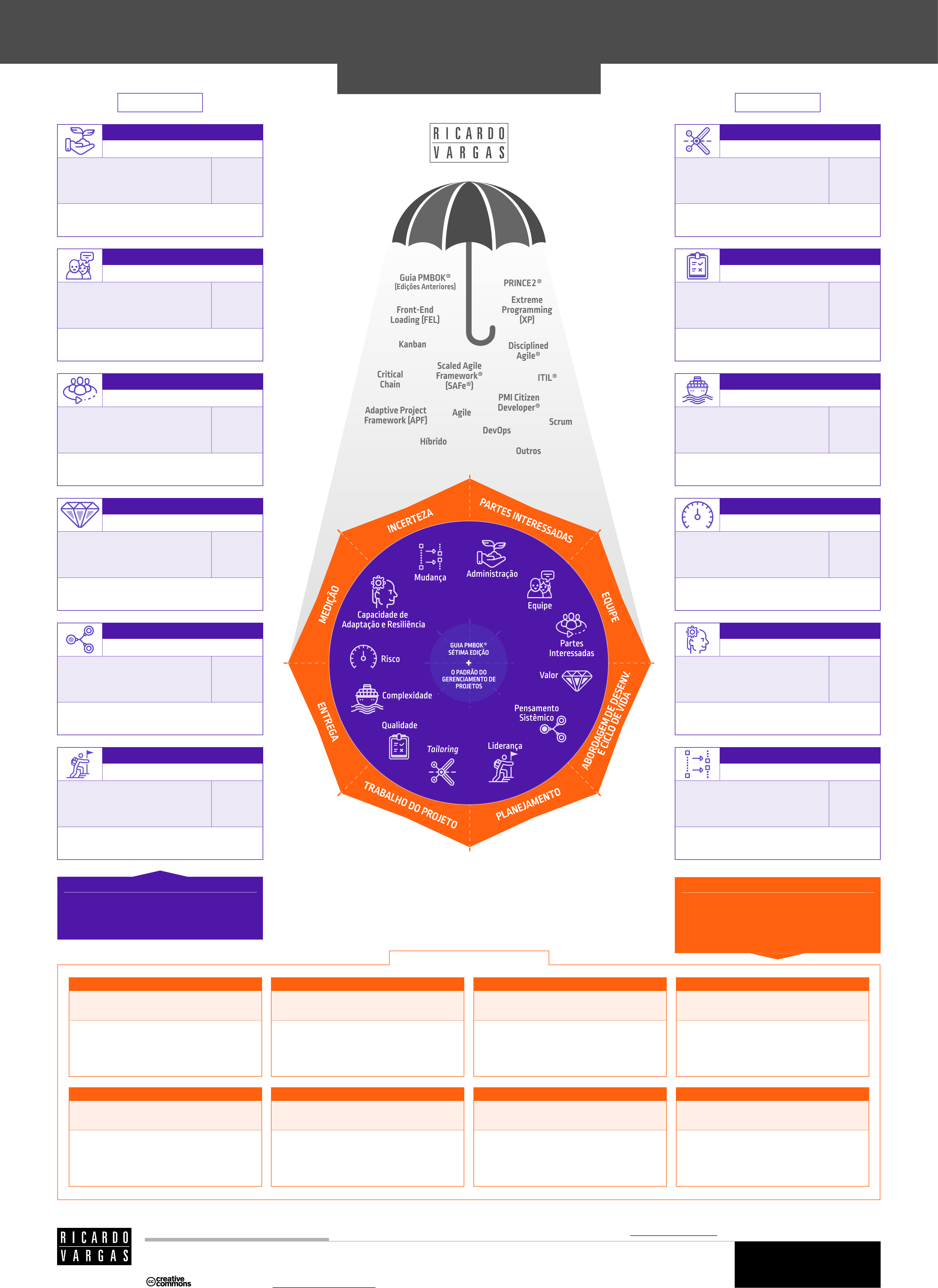 <p>RICARDO VARGAS EXPLICA O</p><p>GUIA PMBOK® 7a EDIÇÃO</p><p>Torne-se um membro do Project Management Institute</p><p>e baixe sua cópia do guia.</p><p>www.pmi.org</p><p>Baseado no Guia do Conhecimento em Gerenciamento de Projetos (Guia PMBOK®) - Sétima Edição e em O Padrão do</p><p>Gerenciamento de Projetos publicados pelo Project Management Institute, Inc. Todos os nomes dos princípios e dos</p><p>domínios de desempenho são ©2021 Project Management Institute, Inc. Todos os direitos reservados.</p><p>O design e o conteúdo personalizado são licenciados sob a licença Atribuição-NãoComercial-</p><p>SemDerivações 4.0 Internacional (creativecommons.org/licenses/by-nc-nd/4.0/)</p><p>Nota explicativa: Este trabalho não substitui a necessidade de ler o Guia PMBOK® e O Padrão do Gerenciamento de</p><p>Projetos. É um material educativo para ajudar os gerentes de projetos e demais profissionais a entender a publicação de</p><p>forma mais fácil e direta.</p><p>Concepção: Ricardo Viana Vargas Revisão: Wagner Maxsen Design Gráfico: Sérgio Alves Lima Jardim</p><p>RICARDO VARGAS EXPLICA O GUIA PMBOK® 7a EDIÇÃO Você pode baixar este documento em https://rvarg.as/pmbok7pt Este infográfico é gratuito e não pode ser vendido.</p><p>DOMÍNIOS DE DESEMPENHO</p><p>PRINCE2®</p><p>Disciplined</p><p>Agile®</p><p>PMI Citizen</p><p>Developer®</p><p>Critical</p><p>Chain</p><p>Front-End</p><p>Loading (FEL)</p><p>Scrum</p><p>Agile</p><p>Híbrido</p><p>DevOps</p><p>Guia PMBOK®</p><p>(Edições Anteriores)</p><p>ITIL®</p><p>Adaptive Project</p><p>Framework (APF)</p><p>Kanban</p><p>Extreme</p><p>Programming</p><p>(XP)</p><p>Outros</p><p>Scaled Agile</p><p>Framework®</p><p>(SAFe®)</p><p>PRINCÍPIOS PRINCÍPIOS</p><p>ADMINISTRAÇÃO</p><p>Seja um administrador diligente, respeitoso e atencioso</p><p>DESCRIÇÃO PALAVRAS-CHAVE</p><p>Você precisa se preocupar com o projeto e se sentir responsável</p><p>e comprometido em entregar valor para o projeto. Você deve</p><p>supervisionar as ações no projeto com o mesmo nível de</p><p>cuidado que usa em sua vida pessoal.</p><p>- Cuidado</p><p>- Honestidade</p><p>- Confi abilidade</p><p>- Conformidade</p><p>COMENTÁRIOS</p><p>» O Código de Ética do PMI está relacionado, mas não é a mesma coisa.</p><p>» Demonstra o seu dever de cuidar e o seu comportamento relativo aos interesses do projeto.</p><p>» É sobre ser transparente, evitar confl itos de interesse, e seguir a lei.</p><p>TAILORING</p><p>Faça a adaptação de acordo com o contexto</p><p>DESCRIÇÃO PALAVRAS-CHAVE</p><p>Sua abordagem não pode ser “engessada”. Deve ser adaptada</p><p>para se adequar ao trabalho, organização e aspectos culturais</p><p>correspondentes, com o objetivo de aumentar os benefícios e</p><p>maximizar o valor.</p><p>- Preditivo (cascata)</p><p>- Iterativo (ágil)</p><p>- Híbrido</p><p>- Canivete Suiço</p><p>COMENTÁRIOS</p><p>» Não existe uma metodologia “melhor”.</p><p>» Existe apenas uma metodologia “certa” para um caso específi co.</p><p>» O método de entrega pode ser uma mistura de diferentes abordagens e métodos.</p><p>EQUIPE</p><p>Crie um ambiente colaborativo para a equipe do projeto</p><p>DESCRIÇÃO PALAVRAS-CHAVE</p><p>É impossível entregar resultados sustentáveis sem uma equipe</p><p>que colabore e trabalhe junto em direção ao mesmo objetivo.</p><p>Os membros da equipe devem usar suas habilidades específi cas</p><p>visando atender às necessidades da equipe e aos objetivos do</p><p>projeto.</p><p>- Colaboração</p><p>- Trabalho em equipe</p><p>- Cultura</p><p>- Papéis &</p><p>Responsabilidades</p><p>COMENTÁRIOS</p><p>» A colaboração em equipe não signifi ca necessariamente amizade.</p><p>» A cultura organizacional afeta a maneira como as equipes trabalham juntas.</p><p>» É mais efi ciente e efi caz trabalhar em equipe do que sozinho.</p><p>QUALIDADE</p><p>Inclua qualidade nos processos e nas entregas</p><p>DESCRIÇÃO PALAVRAS-CHAVE</p><p>Qualidade é a maneira como os resultados se conectam aos</p><p>objetivos e à cadeia de valor. Sua probabilidade de fornecer</p><p>benefícios de negócios é drasticamente reduzida se você não</p><p>puder produzir os resultados do projeto que atendam aos</p><p>requisitos.</p><p>- Satisfazer às</p><p>necessidades</p><p>- Sem defeitos</p><p>- Adequado para o</p><p>propósito</p><p>- Conformidade</p><p>COMENTÁRIOS</p><p>» Qualidade tem tudo a ver com cumprir os requisitos.</p><p>» A qualidade pode ser medida.</p><p>» Concentre-se na detecção e prevenção de erros e falhas.</p><p>PARTES INTERESSADAS</p><p>Envolva-se de fato com as Partes Interessadas</p><p>DESCRIÇÃO PALAVRAS-CHAVE</p><p>As partes interessadas podem infl uenciar direta e indiretamente</p><p>o projeto. Se você não se envolver com eles, poderá criar</p><p>ameaças e perder oportunidades para otimizar os resultados nos</p><p>quais você deve se concentrar para entregar valor.</p><p>- Engajamento</p><p>- Indivíduos</p><p>- Grupos</p><p>- Organizações</p><p>COMENTÁRIOS</p><p>» Elas podem apoiar ou se opor ao projeto, e sua opinião pode mudar com o tempo.</p><p>» As partes interessadas podem ser internas ou externas à organização.</p><p>» Elas podem ir e vir durante o ciclo de vida do projeto.</p><p>COMPLEXIDADE</p><p>Navegue na complexidade</p><p>DESCRIÇÃO PALAVRAS-CHAVE</p><p>Você deve procurar maneiras de aceitar a complexidade do</p><p>ambiente em que está. Volatilidade, Incerteza, Complexidade</p><p>e Ambiguidade *(VUCA)* são partes de qualquer projeto. Mude</p><p>seu foco de evitar a complexidade para avaliar e reagir quando</p><p>necessário.</p><p>- VUCA</p><p>- Ambiguidade</p><p>- Incerteza</p><p>- Volatilidade</p><p>COMENTÁRIOS</p><p>» A complexidade surge de diferentes fatores, e a maioria deles está fora do nosso controle.</p><p>» Pode aumentar ou reduzir em qualquer ponto do projeto.</p><p>» Indicadores e gatilhos são ferramentas críticas para navegar n