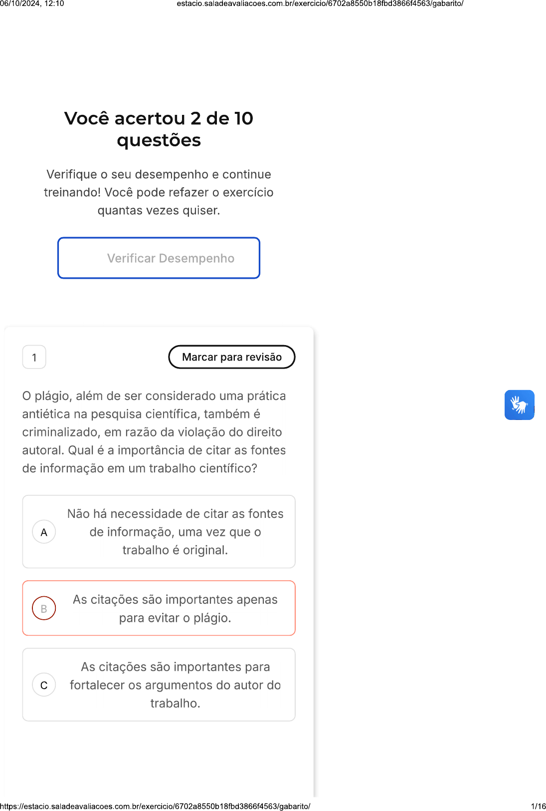 <p>06/10/2024, 12:10 Você acertou 2 de 10 questões Verifique o seu desempenho e continue treinando! Você pode refazer o exercício quantas vezes quiser. Verificar Desempenho 1 Marcar para revisão plágio, além de ser considerado uma prática antiética na pesquisa científica, também é criminalizado, em razão da violação do direito autoral. Qual é a importância de citar as fontes de informação em um trabalho científico? Não há necessidade de citar as fontes A de informação, uma vez que o trabalho é original. As citações são importantes apenas B para evitar o plágio. As citações são importantes para C fortalecer os argumentos do autor do trabalho. 1/16</p><p>06/10/2024, 12:10 As citações são importantes apenas D para dar crédito a trabalhos anteriores. As citações são importantes para apresentar as fontes de informação Planejamento De Exercicio T Sair Pesquisa X Resposta incorreta Opa! A alternativa correta é a letra Questão 2 de 10 E. Confira o gabarito comentado! 1 2 3 4 5 Gabarito Comentado 6 7 8 9 10 As citações são fundamentais em um trabalho científico para identificar e dar Corretas (2) crédito às fontes de informação utilizadas, Incorretas (8) permitindo que o leitor possa verificar e Em branco (0) reproduzir o trabalho. Além disso, as citações também são importantes para fortalecer os argumentos do autor do trabalho e mostrar que ele está familiarizado com a literatura existente sobre o tema. O plágio é uma violação dos direitos autorais e deve ser evitado, mas não é a única razão para citar as fontes de informação. 2 Marcar para revisão Maria Cecília Minayo entende que a teoria representa "conhecimentos que foram construídos cientificamente sobre determinado assunto, por outros estudiosos que o abordaram antes de nós e lançam luz sobre a nossa pesquisa". (MINAYO, Maria Cecília de Sousa (Org.) Pesquisa Social: teoria, método e 2/16</p><p>06/10/2024, 12:10 criatividade. 28. ed. Petrópolis: Vozes, 2009, p. 16.) Qual a função da teoria em uma pesquisa científica, de acordo com ela? Elaborar um discurso floreado, A independente do volume de informações. Desconectar as informações e ideias B já existentes. Evidenciar o objeto de investigação, C delimitar o problema, organizar os dados e conduzir a análise dos dados. Ser a única base para a produção de D novos conhecimentos. Impedir que o pesquisador possa E inovar em sua área de atuação. X Resposta incorreta Opa! A alternativa correta é a letra C. Confira o gabarito comentado! Gabarito Comentado De acordo com Minayo, a teoria em uma pesquisa científica colabora para evidenciar o objeto de investigação, delimitar o problema e suas hipóteses de maneira mais eficaz, possibilita organização dos dados e conduz a análise dos dados. Portanto, a alternativa correta é a letra C. As outras alternativas são 3/16</p><p>06/10/2024, 12:10 incorretas, pois apresentam informações que divergem do texto. 3 Marcar para revisão Um projeto de pesquisa é um documento que contém um planejamento detalhado e estruturado de uma investigação científica. De que forma a elaboração de um projeto de pesquisa pode ser útil para um pesquisador? A elaboração de um projeto de pesquisa é uma tarefa desnecessária A que pode ser substituída pela simples observação do fenômeno que se quer estudar. A elaboração de um projeto de B pesquisa é útil apenas para pesquisas realizadas em cursos de graduação. A elaboração de um projeto de pesquisa pode ser uma etapa de C seleção para ingressar em cursos de pós-graduação. A elaboração de um projeto de D pesquisa é uma obrigação legal para todas as pesquisas realizadas. A elaboração de um projeto de E pesquisa é útil apenas para pesquisadores experientes. X Resposta incorreta 4/16</p><p>06/10/2024, 12:10 Opa! A alternativa correta é a letra C. Confira o gabarito comentado! Gabarito Comentado A elaboração do projeto é, também, uma maneira de transmitir à comunidade científica os seus propósitos e fazer com que eles sejam aceitos e discutidos. Em outras palavras, a concretização do planejamento da pesquisa ocorre por meio da escrita do projeto. A escrita do projeto de pesquisa pode ser requerida nos cursos de graduação, como etapa necessária ao planejamento da pesquisa de conclusão de curso. Para fins de acesso a cursos de pós-graduação, o projeto de pesquisa pode ser, inclusive, uma etapa de seleção, de modo que o aluno ingresse no curso já com a pesquisa em fase de planejamento. Em outros momentos, o projeto pode ser apresentado para buscar financiamento que viabilize a investigação. 4 Marcar para revisão Um trabalho científico deve ser realizado respeitando as normas da ABNT, a Associação Brasileira de Normas Técnicas. Qual é a função das normas técnicas? Determinar o tema a ser abordado na A pesquisa. Formalizar a apresentação dos B elementos constituintes do trabalho. 5/16</p><p>06/10/2024, 12:10 Apontar as falhas do projeto de C pesquisa. Alterar a configuração gráfica do D trabalho. Identificar os resultados obtidos pela E pesquisa. Resposta correta Parabéns, você selecionou a alternativa correta. Confira o gabarito comentado! Gabarito Comentado As normas formalizam a apresentação dos elementos constituintes do seu projeto de pesquisa, monografia, artigo etc. Elas também apresentam quais deverão ser as configurações gráficas da apresentação (tamanho de fonte, espaçamento, margens, entre outras configurações). Esse padrão de apresentação dos trabalhos é adotado por diferentes instituições no Brasil. É importante ter familiaridade com os procedimentos de formatação, adotando o padrão até mesmo em trabalhos menores, pois garante organização e proximidade do autor com procedimentos e normas. 5 Marcar para revisão Sabemos que a pesquisa é elemento essencial na formação acadêmica de qualquer indivíduo. 6/16</p><p>06/10/2024, 12:10 