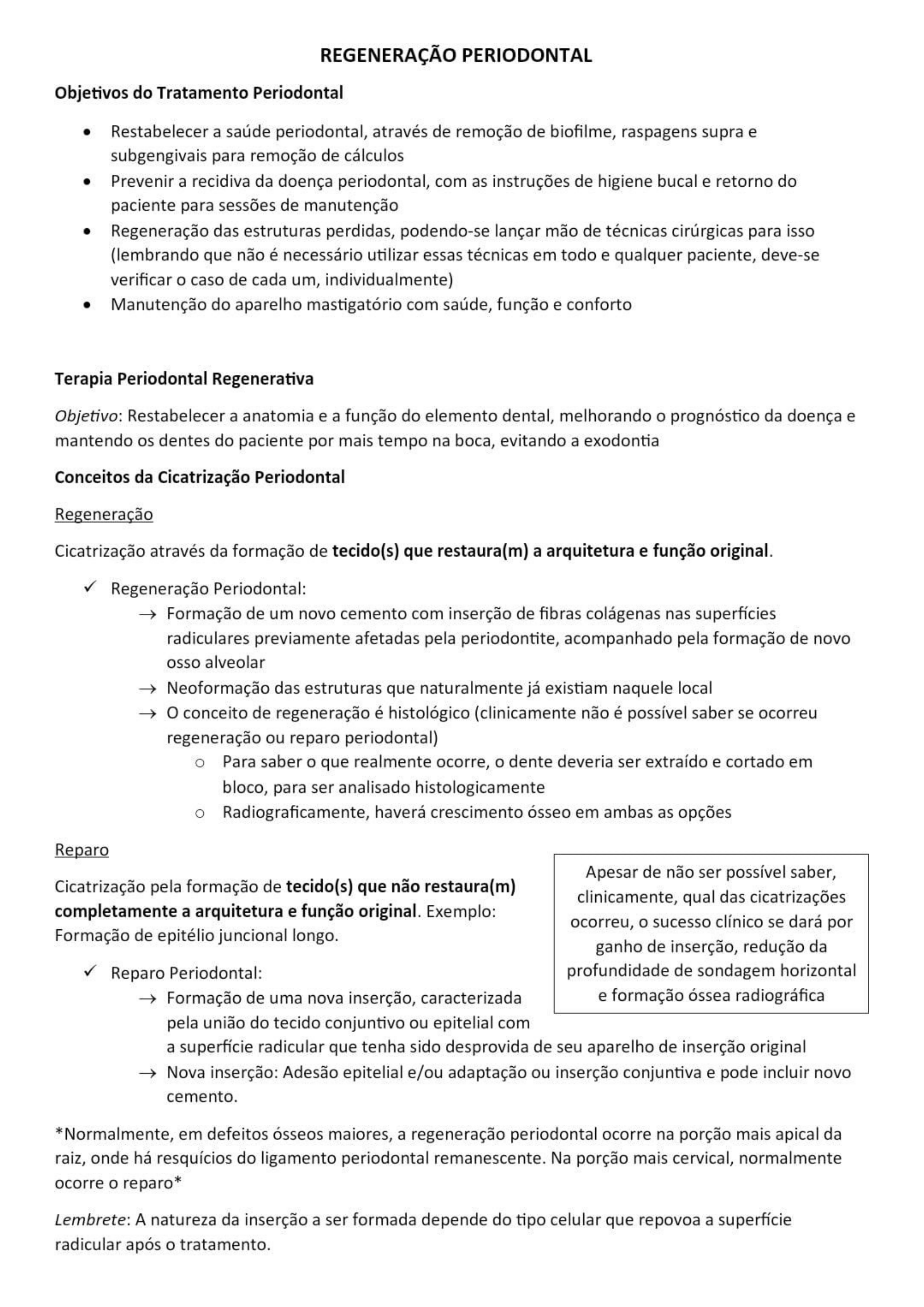 <p>REGENERAÇÃO PERIODONTAL Objetivos do Tratamento Periodontal Restabelecer a saúde periodontal, através de remoção de biofilme, raspagens supra e subgengivais para remoção de cálculos Prevenir a recidiva da doença periodontal, com as instruções de higiene bucal e retorno do paciente para sessões de manutenção Regeneração das estruturas perdidas, podendo-se lançar mão de técnicas cirúrgicas para isso (lembrando que não é necessário utilizar essas técnicas em todo e qualquer paciente, deve-se verificar o caso de cada um, individualmente) Manutenção do aparelho mastigatório com saúde, função e conforto Terapia Periodontal Regenerativa Objetivo: Restabelecer a anatomia e a função do elemento dental, melhorando o prognóstico da doença e mantendo os dentes do paciente por mais tempo na boca, evitando a exodontia Conceitos da Cicatrização Periodontal Regeneração Cicatrização através da formação de tecido(s) que restaura(m) a arquitetura e função original. Regeneração Periodontal: Formação de um novo cemento com inserção de fibras colágenas nas superfícies radiculares previamente afetadas pela periodontite, acompanhado pela formação de novo osso alveolar Neoformação das estruturas que naturalmente já existiam naquele local o conceito de regeneração é histológico (clinicamente não é possível saber se ocorreu regeneração ou reparo periodontal) Para saber o que realmente ocorre, o dente deveria ser extraído e cortado em bloco, para ser analisado histologicamente Radiograficamente, haverá crescimento ósseo em ambas as opções Reparo Apesar de não ser possível saber, Cicatrização pela formação de tecido(s) que não restaura(m) clinicamente, qual das cicatrizações completamente a arquitetura e função original. Exemplo: ocorreu, o sucesso clínico se dará por Formação de epitélio juncional longo. ganho de inserção, redução da Reparo Periodontal: profundidade de sondagem horizontal Formação de uma nova inserção, caracterizada e formação óssea radiográfica pela união do tecido conjuntivo ou epitelial com a superfície radicular que tenha sido desprovida de seu aparelho de inserção original Nova inserção: Adesão epitelial e/ou adaptação ou inserção conjuntiva e pode incluir novo cemento. *Normalmente, em defeitos ósseos maiores, a regeneração periodontal ocorre na porção mais apical da raiz, onde há resquícios do ligamento periodontal remanescente. Na porção mais cervical, normalmente ocorre o reparo* Lembrete: A natureza da inserção a ser formada depende do tipo celular que repovoa a superfície radicular após o tratamento.</p><p>A região periodontal possui um agrupamento das mais variadas células, sendo elas: Células do epitélio gengival Células do tecido conjuntivo gengival Células do osso alveolar Células do ligamento periodontal Após uma lesão, por meio de acúmulo de biofilme e a consequente formação de cálculos e bolsas periodontais, o reparo pode se dar pela formação de qualquer uma dessas células, o que resultará em uma nova inserção periodontal. Porém, cada tipo de célula gera um tipo diferente de reparo. Células do Ligamento Periodontal Formação de cemento com fibras colágenas inseridas Essas células conseguem se diferenciar em cementoblastos, podendo então depositar novo cemento naquela superfície; essas células também conseguem se diferenciar em fibroblastos, podendo depositar fibras colágenas nesse novo cemento Formação de osso alveolar com inserção das fibras Essas células conseguem se diferenciar também em osteoblastos, podendo depositar novo osso na região Ocorrência de regeneração periodontal verdadeira Células do Epitélio Gengival Essas são as células que apresentam uma migração apical rápida, ou seja, possuem uma rápida proliferação Impedem o contato de outras células com a raiz dental Formação de epitélio juncional longo, que é uma superfície epitelial que se aderiu à superfície que foi tratada por meio das raspagens Ausência de regeneração periodontal, pois houve a formação de uma nova inserção Células do Tecido Conjuntivo Gengival Formação de fibras colágenas paralelas ao dente Essas células não possuem a capacidade de se diferenciar em cementoblastos, então não irão depositar novo cemento nessa superfície Pode até gerar a nova formação de fibras, mas como não haverá cemento para elas se fixarem, elas ficarão paralelas ao dente Ocorrência de reabsorção da superfície radicular Ausência de regeneração periodontal Células do Osso Alveolar É a opção mais rara de ocorrer Anquilose e reabsorção Ocorrência de formação óssea sem a presença do ligamento Sem o ligamento, o osso alveolar ficará preso à raiz dentária, gerando a anquilose Ausência de regeneração periodontal *Portanto, somente haverá regeneração verdadeira se a proliferação celular que ocorrer for a de células do ligamento periodontal remanescente* Técnicas Regenerativas Membranas ou Barreiras (RTG) Associação de técnicas Terapia celular</p><p>Enxertos ósseos ou substitutos ósseos bioativas Membranas ou Barreiras (RTG Regeneração Tecidual Guiada) É a adaptação de barreiras físicas (ou "membrana") para recobrir o osso alveolar e o ligamento periodontal e, ao mesmo tempo, excluir epitélio e tecido conjuntivo gengival, favorecendo assim o repovoamento da superfície radicular pelas células do ligamento periodontal. Para isso, o retalho é rebatido, faz-se a instrumentação da superfície radicular, remove-se o tecido de granulação e então a membrana é colocada no local, sendo suturada logo depois. Essa membrana funcionará como uma barreira física, selecionando os tipos celulares promotores da regeneração periodontal. Utilizando-se somente a membrana, é importante que exista um coágulo sanguíneo na região, pois ele favorecerá a migração das células, já que em sua composiçã