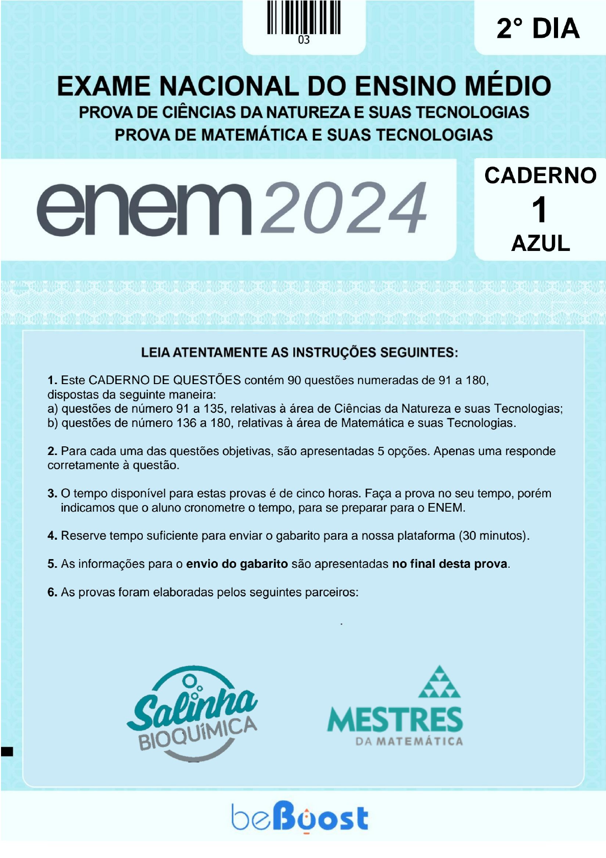 <p>2° DIA 03 EXAME NACIONAL DO ENSINO MÉDIO PROVA DE CIÊNCIAS DA NATUREZA E SUAS TECNOLOGIAS PROVA DE MATEMÁTICA E SUAS TECNOLOGIAS CADERNO enem2024 1 AZUL LEIA ATENTAMENTE AS INSTRUÇÕES SEGUINTES: 1. Este CADERNO DE QUESTÕES contém 90 questões numeradas de 91 a 180, dispostas da seguinte maneira: a) questões de número 91 a 135, relativas à área de Ciências da Natureza e suas Tecnologias; b) questões de número 136 a 180, relativas à área de Matemática e suas Tecnologias. 2. Para cada uma das questões objetivas, são apresentadas 5 opções. Apenas uma responde corretamente à questão. 3. tempo disponível para estas provas é de cinco horas. Faça a prova no seu tempo, porém indicamos que o aluno cronometre o tempo, para se preparar para o ENEM. 4. Reserve tempo suficiente para enviar o gabarito para a nossa plataforma (30 minutos). 5. As informações para o envio do gabarito são apresentadas no final desta prova. 6. As provas foram elaboradas pelos seguintes parceiros: Oo Salinha BIOQUIMICA MESTRES DA MATEMÁTICA beBoost</p><p>CIÊNCIAS DA NATUREZA E SUAS TECNOLOGIAS V Questões de 91 a 135 Ânodo Cátodo QUESTÃO 91 processo de anodização tem sido amplamente usado para proteção contra corrosão do alumínio e suas ligas. As propriedades de resistência à corrosão devem-se primordialmente à formação natural de uma película de Eletrólito óxido de alumínio com alguns nanômetros de espessura que isola o metal do meio. = Metal condutor processo de anodização consiste no espessamento C) desse óxido por meio da aplicação de um potencial. O processo de anodização do alumínio e suas ligas: uma abordagem histórica e eletroquímica. Química Disponível em: V Acesso 14 ago. 2023 (Adaptação). Cátodo Um esquema ilustrativo de uma célula de anodização convencional do alumínio é mostrado em: Eletrólito V = Metal condutor D) V = Metal condutor A) Cátodo V Cátodo Eletrólito = Metal condutor E) Oxido = Metal condutor B) 2° Dia 2 beBoost</p><p>QUESTÃO 92 Atividade Um aluno realizando um experimento com circuitos 99m To A elétricos, em um laboratório, dispõe de duas lâmpadas elétricas incandescentes. cada uma com tensão nominal A/2 de 110V, sendo uma de 40 watts e a outra de 100 watts. Entretanto ele encontra apenas uma bateria de 220 V e, A/4 A/8 baseado nos seus conhecimentos de física, decidiu ligá- 6 12 18 24 30 36 las em série na expectativa de funcionarem corretamente Tempo (horas) consumindo e brilhando de acordo com suas potências 131 indicadas. Ao realizar a ligação e colocar o circuito em A funcionamento concluiu que A/2 A) as lâmpadas funcionaram normalmente por serem A/4 divisoras de tensão ficando com 110 V cada. A/8 8 16 24 32 40 48 B) a lâmpada de 100 watts ficou com brilho excessivo Tempo (dias) e a de 40 watts com brilho fraco. C) a lâmpada de 40 watts ficou com brilho excessivo A e a de 100 watts com brilho fraco. A/2 D) a lâmpada de 100 watts ficou com brilho excessivo A/4 e a de 40 watts com brilho normal. A/8 3 6 9 12 15 18 E) a lâmpada de 40 watts ficou com brilho fraco e a Tempo (dias) de 100 watts com brilho normal. 18F A QUESTÃO 93 A/2 A escolha de um radionuclídeo para o desenvolvimento de A/4 A/8 um radiofármaco depende das suas características físicas, 2 4 6 8 10 12 do tipo de emissão nuclear, tempo de meia-vida e energia Tempo (horas) da radiação eletromagnética emitida. tempo de meia- vida deve ser suficiente para preparar o radiofármaco, 15 A administrar ao paciente e realizar a imagem. Além disso, o tempo de meia-vida deve ser suficientemente curto para minimizar a dose de radiação para o paciente. A seguir A/2 encontramse gráficos que representam as atividades de A/4 A/8 alguns radionuclídeos que podem ser utilizados em um 2 4 6 8 10 12 determinado tratamento: Tempo (minutos) Preparações radiofarmacêuticas e suas aplicações. Revista Brasileira de Ciências Farmacêuticas. em: g=pt. Acesso em: 17 jul. 2023 (Adaptação). 2° Dia 3 beBoost</p><p>Considerando que o período do preparo à realização da QUESTÃO 95 imagem seja de aproximadamente três horas, qual seria o Os cálculos renais, ou "pedras nos rins" são formados radionuclídeo mais indicado para ser utilizado nessa principalmente por sais de oxalato de cálcio que situação? possuem baixa solubilidade e que, normalmente, são A) 99mTc excretados na urina. A dissociação desse sal pode ser representada pelo seguinte equilíbrio químico: B) C) 111In Frutas cítricas e seus sucos naturais são ricos em ácido D) 18F cítrico que, por sua vez, é eliminado através da urina como E) 15° citrato. Este ânion se liga ao cálcio, resultando em um composto solúvel e evitando que o cálcio fique livre no organismo para formar os cálculos renais. QUESTÃO 94 O aumento no consumo de frutas cítricas auxilia na prevenção da formação de cálculos renais porque gráfico abaixo mostra o crescimento de algas em um ecossistema marinho sob diferentes condições. A) o elevado pH dessas frutas provoca a dissolução dos cálculos. A Legenda: 90 A: sem B) o equilíbrio é deslocado no sentido de formação B e sem de mais oxalato de cálcio 60 B: sem e com da 40 C) a água presente no suco dessas frutas promove o C: sem mexilhões e 30 com aumento da solubilidade do sal. 20 D: com ouriços-do-mar 10 e com D) o deslocamento do equilíbrio no sentido de Ago-82 Fev-83 Ago-83 Fev-84 consumo do oxalato de cálcio é favorecido. Eixo tempo em anos (agosto de 82, fevereiro de 83, agosto de 83, fevereiro de 84). Eixo porcentagem da área coberta E) os ânions oxalato são substituídos pelos ânions por algas. Fonte: FUVEST citrato na estrutura cristalina dos cálculos. Analisando o gráfico, é possível inferir que as algas A) são organismos comensais dos QUESTÃO 96 A corrosão por dióxido de carbono (CO2) é atualmente uma das formas mais estudadas de corrosão na indústria B) predam os invertebrados ali presentes. de petróle