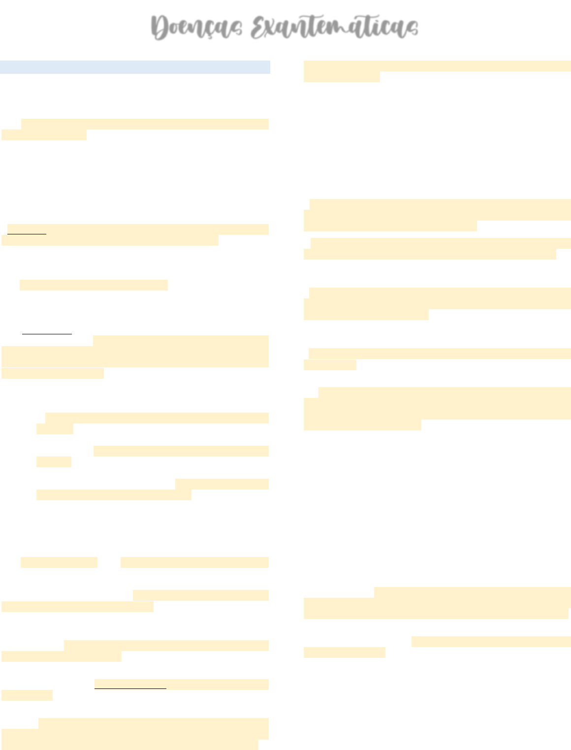 <p>Doenças Exantemáticas</p><p>#Artigo 1</p><p>- As infecções intra-uterinas e as adquiridas durante o parto são</p><p>importantes causas de mortalidade fetal e neonatal e contribuem de</p><p>forma significativa para a morbidade na infância.</p><p>- O rastreamento sorológico realizado durante o pré-natal é de</p><p>extrema importância para gestantes porque existe o risco de</p><p>transmissão vertical</p><p>INTRODUÇÃO</p><p>- A ausência do diagnóstico precoce e a consequente falta de</p><p>tratamento de infecções maternas podem aumentar de forma</p><p>considerável os índices de morbimortalidade perinatal, sendo o</p><p>rastreamento materno no pré-natal de extrema importância</p><p>- TORCHS: taxoplasmose + outras (malária, Chagas, pavoviroses)</p><p>+ rubéola + citomegalovírus + herpes simples + sífilis</p><p>- Hepatite B e C: também são rastradas na gravidez</p><p>- Atualmente, programas de atenção a gestante são executados por</p><p>um acompanhamento multiprofissional, abrangendo ações que</p><p>minimizem os índices de morbimortalidade materna e fetal</p><p>DISCUSSÕES</p><p>- A Lei 7.498/86 que dispõe sobre o Exercício Profissional de</p><p>Enfermagem no Brasil torna o profissional enfermeiro legalmente</p><p>competente para realizar consulta de enfermagem à mulher</p><p>durante a gestação, solicitar exames de rotina e complementares e</p><p>prescrever medicamentos previamente estabelecidos em programas</p><p>de saúde pública</p><p>- Objetivos da assistência ao pré-natal</p><p>- Prevenir, identificar e/ou corrigir as anormalidades</p><p>maternas ou fetais que podem afetar adversamente a</p><p>gravidez, incluindo os fatores socioeconômicos, emocionais</p><p>e obstétricos; Instruir a gestante no que diz respeito à</p><p>gravidez, ao trabalho de parto, ao parto, aos cuidados com</p><p>o recém-nascido e quanto às medidas que podem ser</p><p>utilizadas para melhorar sua saúde e promover um suporte</p><p>psicológico adequado ao companheiro, à família e àqueles</p><p>que estão sob seu cuidado, de forma que a gestante possa</p><p>ser bem-sucedida na sua adaptação à gestação e nos</p><p>desafios que enfrentará ao formar uma família</p><p> Taxoplamose</p><p>- O toxoplasma gondii é o protozoário intracelular obrigatório</p><p>distribuído em quase todas as partes do mundo e capaz de infectar</p><p>diversas células do hospedeiro, além de se apresentar sob diversas</p><p>formas a depender do hospedeiro. Pode ocasionar infecção fetal por</p><p>meio de passagem transplacentária quando a mãe adquire a</p><p>infecção durante a gestação</p><p>- O sucesso da infecção fetal por toxoplasma gondii depende de</p><p>fatores como virulência, desenvolvimento placentário, idade</p><p>gestacional e carga parasitária, entre outros</p><p>- Em 50% dos casos, se ocorrida durante o segundo trimestre, pode</p><p>ocasionar a chamada tétrade de Sabin, em que o feto apresa</p><p>hidrocefalia, com macro ou microcefalia</p><p>- De acordo com o Brasil (2010), além dos agravos citados, podem ser</p><p>descritos restrição de crescimento intrauterino, prematuridade e/ou</p><p>manifestações clínicas e sequelas como microftalmia, lesões</p><p>oculares, pneumonite, hepatoesplenomegalia e erupção cutânea</p><p>- A toxoplasmose é uma infecção de distribuição mundial, com maior</p><p>prevalência em países de clima tropica</p><p>- Segundo a publicação Gestação de Alto Risco da FEBRASGO (2011)</p><p>é fundamental para o diagnóstico de anticorpos imunoglobulinas</p><p>(Ig) para Toxoplasmose o mais precoce possível, no início do</p><p>primeiro trimestre.</p><p>- A conduta vai de acordo com a idade gestacional, onde mulheres</p><p>com IgM positiva, mas sem soroconversão documentada, com</p><p>frequência são cronicamente infectadas</p><p>- Até 62% se trata com falso-positivo, caso a mulher</p><p>apresente IgM positiva, recomenda-se a realização do teste</p><p>de avidez de IgG, pois se a avidez for alta e ter sido colhida</p><p>até 12 a 16 semanas de gestação, indicará que a infecção</p><p>ocorreu muito provavelmente antes da concepção, e o risco</p><p>de infecção congênita é muito baixo.</p><p>- Se colhido após as 16 semanas, não é possível afastar a infecção</p><p>aguda do início da gestação, quanto ao risco de transmissão vai ser</p><p>menor, porém o risco de lesão fetal é maior.</p><p>- Se a avidez for baixa, a infecção aguda muito provavelmente</p><p>aconteceu no início da gestação, com o risco de infecção fetal. No</p><p>entanto, a avidez baixa pode persistir por meses ou até um ano após</p><p>o contato</p><p>- O diagnóstico fetal pode ser feito através da reação em cadeia de</p><p>polimerase (PCR) no líquido amniótico óbito através da</p><p>amniocentese amniocentecese é maior antes de 16 semanas,</p><p>recomenda-se que seja realizada preferencialmente entre 17 e 21</p><p>semanas</p><p>- Segundo Brasil (2010), a toxoplasmose não é doença de notificação</p><p>compulsória. A investigação deve buscar sua associação à</p><p>imunodeficiência</p><p>- A prevenção para Toxoplasmose é orientada no pré-natal quanto</p><p>a não ingestão de produtos, animais crus ou mal cozidos (caprinos</p><p>e bovinos), lavar cuidadosamente frutas e legumes antes de ingeri-</p><p>los, evitar contato com gatos, utilizar luvas ao manusear a caixa de</p><p>areia do gato e colocar em lixo seguro, lavar as mãos após ter contato</p><p>com carnes cruas ou terra contaminada</p><p>- Apesar não haver uma vacina, sua forma de prevenção é</p><p>relativamente simples e a solicitação do exame sorológico e o</p><p>diagnóstico precoce podem auxiliar na prevenção dessas</p><p>complicações. Enquanto profissional da saúde, a enfermagem pode</p><p>atuar</p><p> Rubeola</p><p>- Quando se trata de doenças infectocontagiosas, a importância</p><p>epidemiológica da rubéola está representada pela ocor