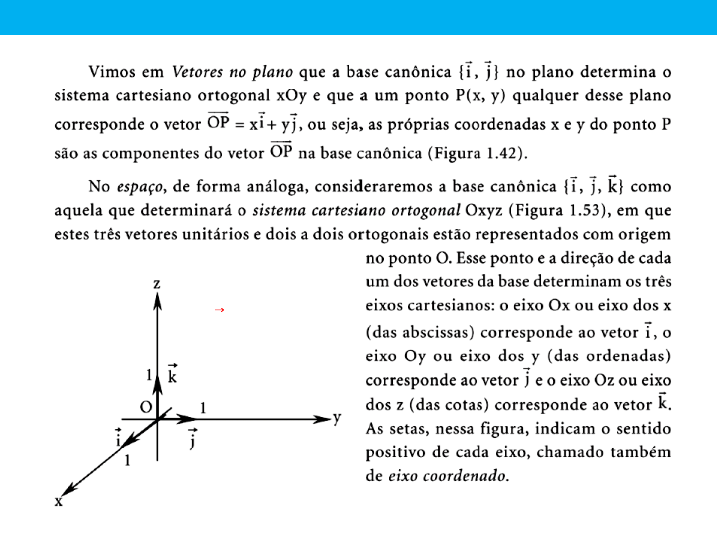 <p>VETORES NO ESPAÇO</p><p>𝑘 = (0,0,1)</p><p>Ԧ𝑗 = (0,1,0)</p><p>Ԧ𝑖 = (1,0,0)</p><p>VETORES NO ESPAÇO</p><p>Ԧ𝑣 = (𝑥, 𝑦, 𝑧)</p><p>VETORES NO ESPAÇO</p><p>1º Exemplo: Represente graficamente o vetor 𝑢 = 1,3, −2 .</p><p>VETORES NO ESPAÇO</p><p>VETORES NO ESPAÇO</p><p>VETORES NO ESPAÇO</p><p>2º Exemplo: Considere o paralelepípedo retângulo OABCDEFP.</p><p>II) Determine os vetores:</p><p>a) 𝐴𝐵</p><p>b) 𝐴𝐶</p><p>c) 𝐴𝐷</p><p>d) 𝐵𝐸</p><p>I) Determine as coordenadas</p><p>dos pontos:</p><p>a) 𝐴</p><p>b) 𝐵</p><p>c) 𝐶</p><p>d) 𝐷</p><p>e) 𝐸</p><p>VETORES NO ESPAÇO</p><p>3º Exemplo: Dado o vetor 𝑢 = 1,2, −2 , determine:</p><p>a) o módulo de 𝑢.</p><p>b) o versor do vetor 𝑢.</p><p>c) um vetor paralelo ao vetor 𝑢, de módulo 5 e sentido oposto.</p><p>VETORES NO ESPAÇO</p><p>4º Exemplo: Sabendo que 3𝑢 − 4 Ԧ𝑣 = 2𝑤, determinar 𝑎, 𝑏 e 𝑐,</p><p>sendo 𝑢 = 2, −1, 𝑐 , Ԧ𝑣 = 𝑎, 𝑏 − 2, 3 e 𝑤 = 4, −1,0 .</p><p>VETORES NO ESPAÇO</p><p>5º Exemplo: Determinar os valores de 𝑛 para que o vetor</p><p>Ԧ𝑣 = 𝑛, −</p><p>1</p><p>2</p><p>,</p><p>3</p><p>5</p><p>seja unitário.</p><p>VETORES NO ESPAÇO</p><p>6º Exemplo: Dados os pontos 𝐴(0,1, −1) e 𝐵(1,2, −1) e os</p><p>vetores 𝑢 = −2, −1,1 , Ԧ𝑣 = 3,0, −1 e 𝑤 = −2,2,2 ,</p><p>verificar se existem os números reais 𝑎, 𝑏 e 𝑐 tais que</p><p>𝒘 = 𝒂 ∙ 𝑨𝑩 + 𝒃 ∙ 𝒖 + 𝒄 ∙ 𝒗 .</p><p>VETORES NO ESPAÇO</p><p>7º Exemplo: Verificar se são colineares os pontos:</p><p>𝐴(−1, −5,0), 𝐵(2,1,3) e 𝐶(−2, −7, −1).</p><p>VETORES NO ESPAÇO</p><p>8º Exemplo: Determinar os valores de 𝑦 para que seja</p><p>equilátero o triângulo de vértices 𝐴(4, 𝑦, 4), 𝐵(10, 𝑦, −2) e</p><p>𝐶(2,0, −4).</p><p>Slide 1</p><p>Slide 2</p><p>Slide 3</p><p>Slide 4</p><p>Slide 5</p><p>Slide 6</p><p>Slide 7</p><p>Slide 8</p><p>Slide 9</p><p>Slide 10</p><p>Slide 11</p><p>Slide 12</p><p>Slide 13</p>