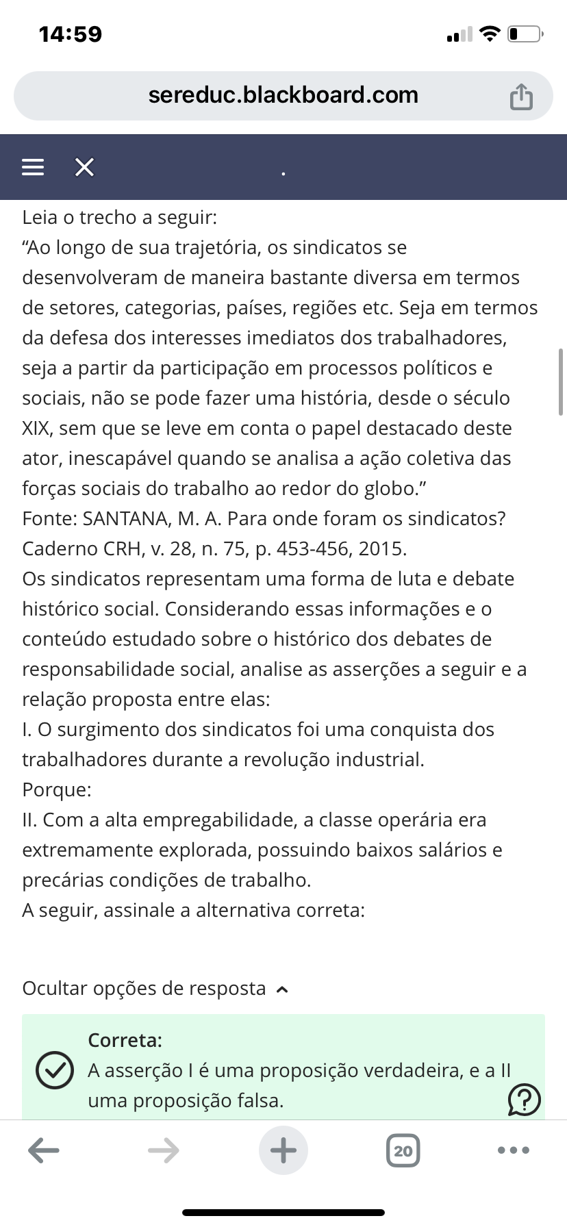 <p>14:59 sereduc.blackboard.com X Leia o trecho a seguir: "Ao longo de sua trajetória, os sindicatos se desenvolveram de maneira bastante diversa em termos de setores, categorias, países, regiões etc. Seja em termos da defesa dos interesses imediatos dos trabalhadores, seja a partir da participação em processos políticos e sociais, não se pode fazer uma história, desde o século XIX, sem que se leve em conta o papel destacado deste ator, inescapável quando se analisa a ação coletiva das forças sociais do trabalho ao redor do globo." Fonte: SANTANA, M. A. Para onde foram os sindicatos? Caderno CRH, V. 28, n. 75, p. 453-456, 2015. Os sindicatos representam uma forma de luta e debate histórico social. Considerando essas informações e o conteúdo estudado sobre o histórico dos debates de responsabilidade social, analise as asserções a seguir e a relação proposta entre elas: I. O surgimento dos sindicatos foi uma conquista dos trabalhadores durante a revolução industrial. Porque: II. Com a alta empregabilidade, a classe operária era extremamente explorada, possuindo baixos salários e precárias condições de trabalho. A seguir, assinale a alternativa correta: Ocultar opções de resposta Correta: A asserção é uma proposição verdadeira, e a uma proposição falsa. ? + 20</p>