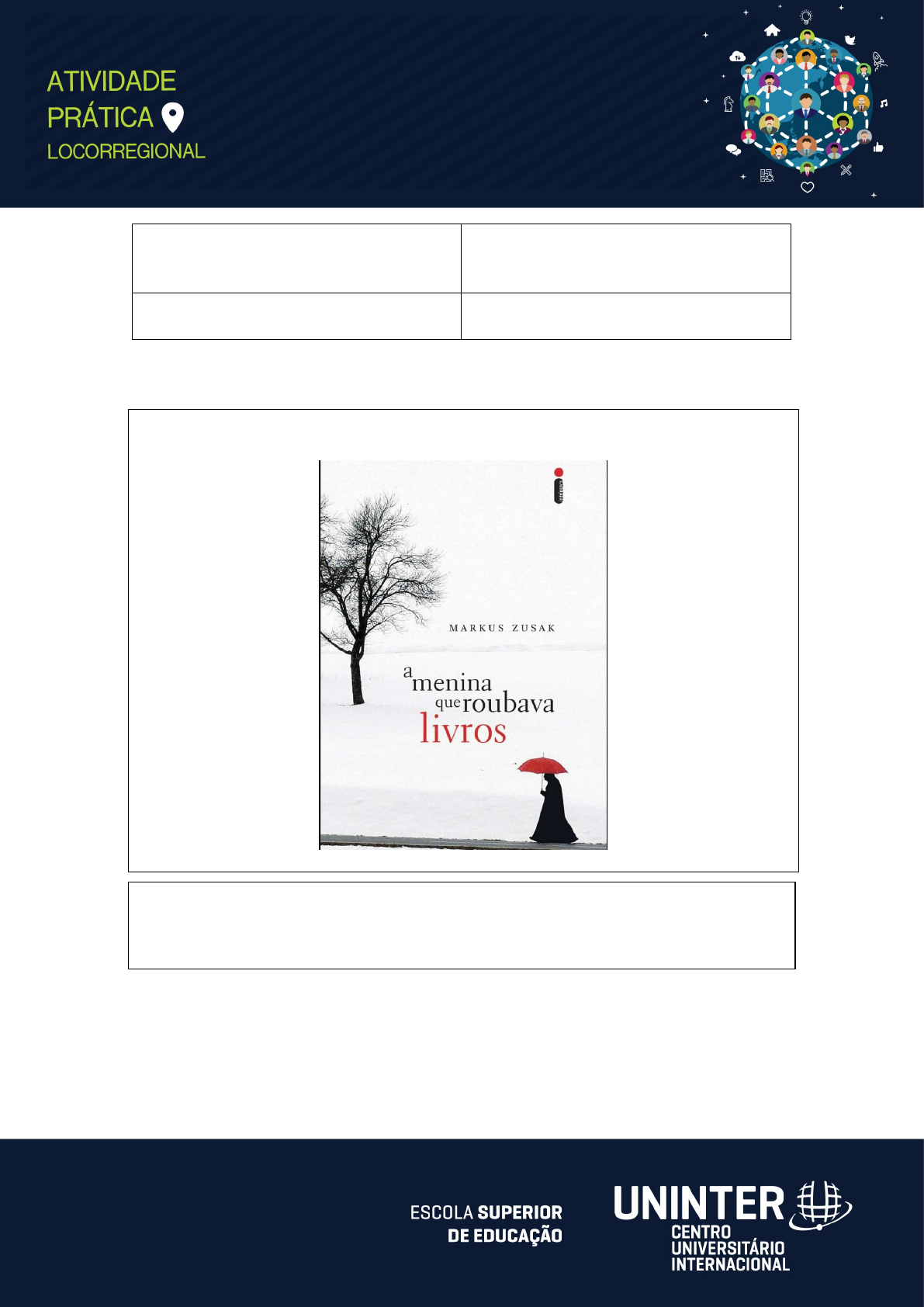 <p>DISCIPLINA: Metodologia do Ensino da Literatura</p><p>POLO: SÃO JOSÉ DOS PINHAIS</p><p>NOME: ADRYA ARNDT PERAZZOLLI</p><p>RU: 3651855</p><p>1. Texto de literatura escolhido</p><p>Título: "A Menina que Roubava Livros"</p><p>Referência do texto escolhido:</p><p>Zusak, Markus. A Menina que Roubava Livros. Tradução de Paulo Geiger. Companhia das Letras, 2007.</p><p>2. Estratégias de Leitura</p><p>Estratégias de leitura propostas para o ano/série: 6º ao 9º ano do Ensino Fundamental II</p><p>Estratégia de Leitura</p><p>Ação/atividade proposta</p><p>1. Cenas Recriadas</p><p>Descrição: Os alunos devem escolher uma cena importante do livro e recriá-la em grupos.</p><p>Ações:</p><p>· Dividir a turma em grupos e dar a eles tempo para escolher uma cena, planejar e encenar.</p><p>· Após as apresentações, promover uma discussão sobre as interpretações diferentes e o que cada grupo percebeu sobre a cena.</p><p>2. Atividade: Diário de Leitura</p><p>Descrição: Criar um diário de leitura onde os alunos registram suas reflexões e sentimentos sobre os trechos lidos.</p><p>Ações:</p><p>· Os alunos devem escrever entradas após cada sessão de leitura, refletindo sobre o que mais os impactou e suas reações emocionais.</p><p>· Estimular a inclusão de desenhos ou colagens que representem suas emoções sobre a história.</p><p>3. Pesquise e apresente aqui dados de leitura sobre a sua cidade/estado/região e comente sobre a importância das estratégias de leitura na formação do leitor.</p><p>Referências bibliográficas pesquisadas no item 3:</p><p>Prefeitura Municipal de São José dos Pinhais. "Caminho da Leitura." Disponível em: https://www.sjp.pr.gov.br. Acesso em 28 set. 2024</p><p>Sistema Nacional de Bibliotecas Públicas. "Dados sobre Bibliotecas no Brasil." Disponível em: http://www.bn.br. Acesso em 28 set. 2024</p><p>Instituto Brasileiro de Geografia e Estatística (IBGE). "Cidades@." São José dos Pinhais. Disponível em: https://cidades.ibge.gov.br. Acesso em 28 set. 2024</p><p>São José dos Pinhais possui várias bibliotecas públicas e projetos de incentivo à leitura, como o "Caminho da Leitura", que promove eventos literários e oficinas. Em 2022, a cidade contava com aproximadamente 20.000 leitores ativos nas bibliotecas municipais.</p><p>As estratégias de leitura são fundamentais na formação do leitor, pois estimulam a análise crítica, a empatia e o prazer pela leitura, contribuindo para o desenvolvimento de habilidades essenciais no aprendizado e na vida cotidiana.</p><p>Fontes:</p><p>· Prefeitura Municipal de São José dos Pinhais</p><p>· Sistema Nacional de Bibliotecas Públicas</p><p>· Projetos culturais locais e relatórios anuais.</p><p>image2.png</p><p>image3.png</p>