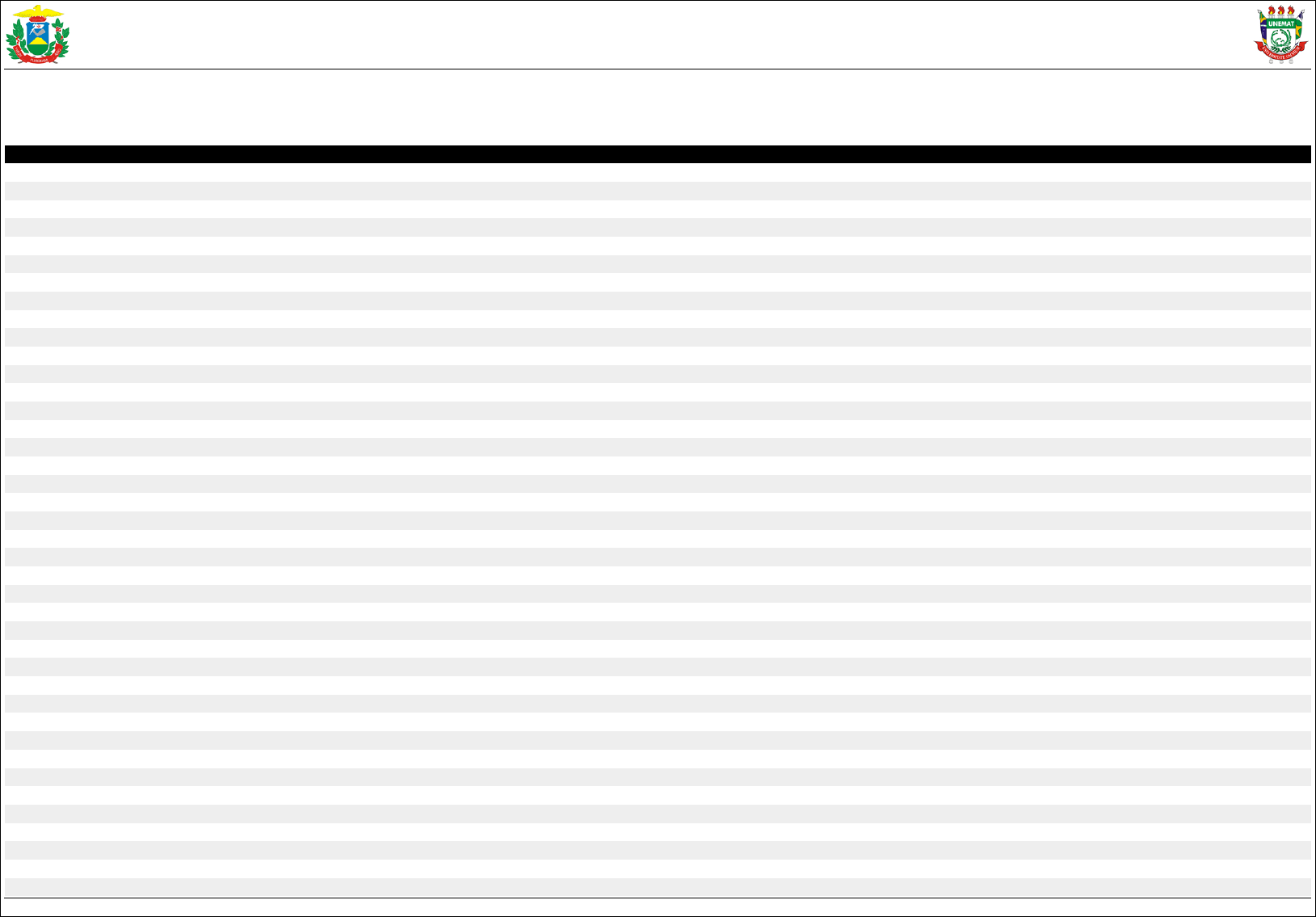 <p>UNIVERSIDADE DO ESTADO DE MATO GROSSO CONCURSO VESTIBULAR 2024/1 - EDITAL DE ABERTURA Nº. 009/2023/UNEMAT/COVEST</p><p>1ª CHAMADA - LISTA DE APROVADOS E CLASSIFICADOS</p><p>Perfil: Campus Universitário de Cáceres - Medicina - Integral - Bacharelado - Cursos Oferecidos na Modalidade Regular/Presencial</p><p>VAGAS CA: 12; CE: 8; CD: 1; CI: 1; CN: 8; NOTAS DE CORTE CA: 142.50; CE: 136.90; CD: 105.50; CI: 89.15; CN: 125.00; APROVADOS CA: 12; CE: 8; CD: 1; CI: 1; CN: 8;</p><p>Legenda: CG Classificação Geral | CAC Classificação Ampla Concorrência | CEP Classificação Demais Estudantes de Escola Pública | CPD Classificação Estudantes Com Deficiência | CPI Classificação Indígenas | CPN Classificação Negros | CA Candidato</p><p>Ampla Concorrência | CE Candidato Demais Escola Pública | CN Candidato Negros | CI Candidato Indígenas | CD Candidato Com Deficiência | DND Data de nascimento em dias | CHT Ciências humanas e suas tecnologias | CNT Ciências da natureza e</p><p>suas tecnologias | MAT Matemática e suas tecnologias | LCT Linguagem, códigos e suas tecnologias | RED Redação | RF Resultado Final | CDD Critério de Desempate | NPE Nota na Prova Específica | I60 Idade igual ou superior a 60 anos | DTN Idade</p><p>CG CAC CEP CPD CPI CPN Modalidade Inscrição Nome DND CHT CNT MAT LCT RED RF CDD Situação</p><p>1 1 - - - - CA 4002450 ANA MARIA COSTA E SILVA 7728 24.00 36.00 16.00 24.00 45.00 145.00 Aprovado</p><p>2 2 - - - - CA 4002177 ANNA GABRIELLE CAVALINI BIZARELLO 6667 24.00 32.00 14.00 27.00 47.50 144.50 Aprovado</p><p>3 3 - - - - CA 4010107 CESAR XAVIER DA SILVA NETO 6515 24.00 36.00 16.00 27.00 41.25 144.25 Aprovado</p><p>4 4 - - - - CA 4004666 WYSER BARROS AUERSWALD 6815 24.00 32.00 16.00 27.00 45.00 144.00 Aprovado</p><p>5 5 - - - - CA 4004044 BRENO AUGUSTO RAMOS DE FRANÇA 9067 24.00 32.00 12.00 27.00 48.75 143.75 Aprovado</p><p>6 6 - - - - CA 4000139 MARIA CAROLINA MARTINS DA CONCEIÇÃO 7551 24.00 28.00 16.00 27.00 48.75 143.75 NPE Aprovado</p><p>7 7 - - - - CA 4001739 THAYLLA ARIANY DE SOUZA OLIVEIRA 8599 24.00 36.00 16.00 24.00 43.75 143.75 RED Aprovado</p><p>8 8 - - - - CA 4008046 HIRAM VIEIRA CHIROLI 6614 24.00 32.00 16.00 24.00 47.50 143.50 Aprovado</p><p>9 9 - - - - CA 4004930 LUANA VELTER RONDON 7770 24.00 32.00 16.00 27.00 44.40 143.40 Aprovado</p><p>10 10 - - - - CA 4006116 JOSÉ RENATO PIRES DA MOTTA E SOUSA 7086 21.00 36.00 16.00 27.00 43.15 143.15 Aprovado</p><p>11 11 - - - - CA 4003774 JOÃO PEDRO COSTA ARAÚJO 6419 24.00 32.00 14.00 27.00 45.65 142.65 Aprovado</p><p>12 12 - - - - CA 4008652 JONATHAN MIRANDA PORTO 8064 24.00 32.00 12.00 27.00 47.50 142.50 Aprovado</p><p>13 13 - - - - CA 4007693 VINÍCIUS AMORIM E SILVA 6869 24.00 36.00 16.00 24.00 41.90 141.90 Classificado</p><p>14 14 - - - - CA 4002249 ARTHUR SANTANA AMORIM SILVA 8526 24.00 36.00 16.00 27.00 38.75 141.75 Classificado</p><p>15 15 - - - - CA 4001000 VIVIANE MASHIMA 6540 21.00 36.00 16.00 21.00 47.50 141.50 Classificado</p><p>16 16 - - - - CA 4000688 RENAN MORETTI COELHO 9946 24.00 36.00 16.00 24.00 41.25 141.25 Classificado</p><p>17 17 - - - - CA 4007066 ISABELLA CAROLINA BESSA ROCHA 8692 24.00 36.00 12.00 24.00 45.00 141.00 Classificado</p><p>18 18 - - - - CA 4001516 ANA CLARA ALVES GOUVEIA NUNES 7256 24.00 36.00 16.00 18.00 46.90 140.90 Classificado</p><p>19 - 1 - - - CE 4000751 MARIANA MATOS PEREIRA 7097 24.00 32.00 14.00 24.00 46.90 140.90 NPE Aprovado</p><p>20 - 2 - - - CE 4006311 ANNA LAURA DE PAULA REGO 8210 21.00 36.00 14.00 21.00 48.75 140.75 Aprovado</p><p>21 19 - - - - CA 4001067 ANA TERRA DOS REIS BENTO 7065 21.00 36.00 16.00 24.00 43.75 140.75 RED Classificado</p><p>22 - 3 - - - CE 4006614 KEYTIANE KASSIA DE ARAúJO FERREIRA 11718 24.00 32.00 16.00 21.00 47.50 140.50 Aprovado</p><p>23 20 - - - - CA 4005438 ARISTÓTELES ASSUNÇÃO CADIDÉ JúNIOR 6954 24.00 32.00 14.00 24.00 46.25 140.25 Classificado</p><p>24 21 - - - - CA 4004747 JOÃO PEDRO DEBESA TORRES 10450 24.00 32.00 16.00 24.00 43.75 139.75 Classificado</p><p>25 22 - - - - CA 4001062 MELL HELLEN DOURADO MACIEL SILVA 7019 24.00 32.00 16.00 24.00 43.15 139.15 Classificado</p><p>26 - 4 - - - CE 4000739 GUILHERME FERRAZ CAMPOS 6782 24.00 32.00 16.00 24.00 43.15 139.15 DTN Aprovado</p><p>27 23 - - - - CA 4001559 RODRIGO FONSECA FREIBERGER 6799 24.00 32.00 16.00 27.00 40.00 139.00 Classificado</p><p>28 - 5 - - - CE 4003496 JADLEY EMÍDIO PEREIRA 11934 18.00 32.00 12.00 30.00 46.90 138.90 Aprovado</p><p>29 - 6 - - - CE 4004081 GUILHERME ALEXANDRE SOARES CARGNIN 7229 21.00 36.00 16.00 21.00 44.40 138.40 Aprovado</p><p>30 24 - - - - CA 4005532 ANNA JÚLIA LANNES DE CARVALHO SANTOS 8535 21.00 36.00 14.00 27.00 39.40 137.40 Classificado</p><p>31 25 - - - - CA 4007335 GUILHERME DE LIMA MEIRELES 7033 24.00 36.00 16.00 27.00 34.40 137.40 RED Classificado</p><p>32 - 7 - - - CE 4001154 LAURA VITÓRIA DE MELO NIESCIUR 7358 18.00 32.00 14.00 27.00 46.25 137.25 Aprovado</p><p>33 - 8 - - - CE 4003847 LETÍCIA CARVALHO ZEN 7083 21.00 28.00 14.00 27.00 46.90 136.90 Aprovado</p><p>34 26 - - - - CA 4003277 OLAVO FRANCO DO PRADO 6102 21.00 36.00 16.00 27.00 36.90 136.90 RED Classificado</p><p>35 27 - - - - CA 4002363 ADMILSON MARTINS LAPA JUNIOR 6968 24.00 32.00 16.00 24.00 40.65 136.65 Classificado</p><p>36 28 - - - - CA 4003100 RODRIGO ASCARI DIAS 7936 24.00 36.00 16.00 21.00 39.40 136.40 Classificado</p><p>37 - 9 - - - CE 4005733 ANIELLE FERNANDES BERNARDES 10412 24.00 32.00 10.00 24.00 46.25 136.25 Classificado</p><p>38 29 - - - - CA 4007268 DARIO IKEDA CASTRILLON FERNANDEZ 7588 21.00 36.00 14.00 24.00 41.25 136.25 RED Classificado</p><p>39 - 10 - - - CE 4000608 AMANDA BURANELLO RIGOTTI 7303 18.00 32.00 14.00 27.00 45.00 136.00 Classificado</p><p>40 30 - - - - CA 4004425 MIGUEL MEDEIROS BARROSO RIOS 8306 21.00 36.00 16.00 21.00 41.90 135.90 Classificado</p><p>Publicado em 31/01/2024 - 12:55:24h - Página 1 de 3</p><p>UNIVERSIDADE DO ESTADO DE MATO GROSSO CONCURSO VESTIBULAR 2024/1 - EDITAL DE ABERTURA Nº. 009/2023/UNEMAT/COV