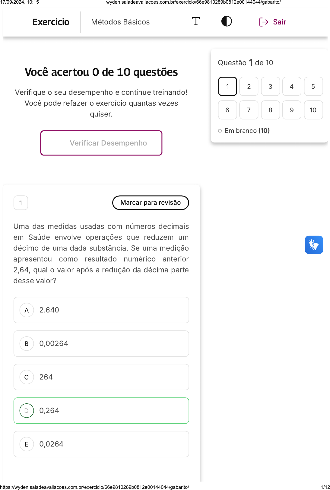<p>Você acertou 0 de 10 questões</p><p>Verifique o seu desempenho e continue treinando!</p><p>Você pode refazer o exercício quantas vezes</p><p>quiser.</p><p>Verificar Desempenho</p><p>A</p><p>B</p><p>C</p><p>D</p><p>E</p><p>1 Marcar para revisão</p><p>Uma das medidas usadas com números decimais</p><p>em Saúde envolve operações que reduzem um</p><p>décimo de uma dada substância. Se uma medição</p><p>apresentou como resultado numérico anterior</p><p>2,64, qual o valor após a redução da décima parte</p><p>desse valor?</p><p>2.640</p><p>0,00264</p><p>264</p><p>0,264</p><p>0,0264</p><p>Questão 1 de 10</p><p>Em branco �10�</p><p>1 2 3 4 5</p><p>6 7 8 9 10</p><p>Exercicio Métodos Básicos Sair</p><p>17/09/2024, 10:15 wyden.saladeavaliacoes.com.br/exercicio/66e9810289b0812e00144044/gabarito/</p><p>https://wyden.saladeavaliacoes.com.br/exercicio/66e9810289b0812e00144044/gabarito/ 1/12</p><p>A</p><p>B</p><p>C</p><p>Questão não respondida</p><p>Opa! A alternativa correta é a letra D.</p><p>Confira o gabarito comentado!</p><p>Gabarito Comentado</p><p>Para encontrar o valor após a redução de um</p><p>décimo da substância, é necessário dividir o</p><p>valor inicial por 10. No caso, temos 2,64 como</p><p>valor inicial. Ao dividir 2,64 por 10, obtemos</p><p>0,264. Isso ocorre porque ao dividir um</p><p>número decimal por 10, a vírgula é deslocada</p><p>uma casa para a esquerda. Portanto, a</p><p>resposta correta é 0,264, que é a opção D.</p><p>2 Marcar para revisão</p><p>Dois profissionais estavam conversando sobre</p><p>aumento salarial e um mencionou ao outro que o</p><p>seu chefe multiplicou o seu salário por um fator</p><p>para dizer qual era o seu aumento. Ele pede ao seu</p><p>amigo para que lhe esclareça qual o percentual de</p><p>aumento que correspondia ao fator. Assinale a</p><p>opção correta que representa o percentual de</p><p>aumento.</p><p>Fator = 0,015</p><p>150%</p><p>0,15%</p><p>0,015%</p><p>17/09/2024, 10:15 wyden.saladeavaliacoes.com.br/exercicio/66e9810289b0812e00144044/gabarito/</p><p>https://wyden.saladeavaliacoes.com.br/exercicio/66e9810289b0812e00144044/gabarito/ 2/12</p><p>D</p><p>E</p><p>A</p><p>B</p><p>C</p><p>1,5%</p><p>15%</p><p>Questão não respondida</p><p>Opa! A alternativa correta é a letra D.</p><p>Confira o gabarito comentado!</p><p>Gabarito Comentado</p><p>Para calcular a porcentagem de aumento, é</p><p>necessário multiplicar o fator pelo valor de</p><p>100%. Nesse caso, o fator é 0,015. Portanto,</p><p>ao realizar a multiplicação de 0,015 por 100%,</p><p>obtemos 1,5%. Isso significa que o aumento</p><p>salarial correspondente ao fator mencionado é</p><p>de 1,5%. Assim, a alternativa correta é a letra</p><p>D.</p><p>3 Marcar para revisão</p><p>Uma medida apresentou como resultado 0,0389.</p><p>Uma outra medida deu um resultado de 0,0001 a</p><p>mais do que esse valor. Qual seria o valor dessa</p><p>medida?</p><p>0,0390</p><p>0,03891</p><p>0,390</p><p>17/09/2024, 10:15 wyden.saladeavaliacoes.com.br/exercicio/66e9810289b0812e00144044/gabarito/</p><p>https://wyden.saladeavaliacoes.com.br/exercicio/66e9810289b0812e00144044/gabarito/ 3/12</p><p>D</p><p>E</p><p>A</p><p>B</p><p>0,0399</p><p>0,000390</p><p>Questão não respondida</p><p>Opa! A alternativa correta é a letra A.</p><p>Confira o gabarito comentado!</p><p>Gabarito Comentado</p><p>Para encontrar o valor da segunda medida,</p><p>precisamos somar o valor da primeira medida</p><p>�0,0389) com o valor adicional mencionado</p><p>�0,0001�. A soma desses dois valores resulta</p><p>em 0,0390, que é a resposta correta. Veja o</p><p>cálculo abaixo:</p><p>0,0389</p><p>+ 0,0001</p><p>__________</p><p>0,0390</p><p>4 Marcar para revisão</p><p>Um número pequeno como a corrente elétrica</p><p>selecionada em um aparelho tem seu valor de</p><p>0,0012 ampere. Marque a opção que apresenta o</p><p>valor correto dessa corrente elétrica em notação</p><p>científica.</p><p>0,12∙10�2</p><p>0,012∙10�1</p><p>17/09/2024, 10:15 wyden.saladeavaliacoes.com.br/exercicio/66e9810289b0812e00144044/gabarito/</p><p>https://wyden.saladeavaliacoes.com.br/exercicio/66e9810289b0812e00144044/gabarito/ 4/12</p><p>C</p><p>D</p><p>E</p><p>12∙10�2</p><p>1,2</p><p>1,2∙10�3</p><p>Questão não respondida</p><p>Opa! A alternativa correta é a letra E.</p><p>Confira o gabarito comentado!</p><p>Gabarito Comentado</p><p>A notação científica é uma forma de expressar</p><p>números que são muito grandes ou muito</p><p>pequenos para serem convenientemente</p><p>escritos em forma decimal. No caso do valor</p><p>0,0012, para convertê-lo em notação</p><p>científica, movemos a vírgula decimal três</p><p>posições para a direita, resultando em 1,2. No</p><p>entanto, para manter o valor original do</p><p>número, precisamos compensar esse</p><p>movimento multiplicando por uma potência de</p><p>10 com um expoente negativo igual ao número</p><p>de posições que movemos a vírgula. Nesse</p><p>caso, o expoente é �3. Portanto, a</p><p>representação correta de 0,0012 em notação</p><p>científica é:</p><p>1,2∙10�3</p><p>5 Marcar para revisão</p><p>Um profissional da saúde verificou que 34% dos</p><p>50 equipamentos da clínica vão precisar de</p><p>manutenção. Marque a opção que apresenta a</p><p>17/09/2024, 10:15 wyden.saladeavaliacoes.com.br/exercicio/66e9810289b0812e00144044/gabarito/</p><p>https://wyden.saladeavaliacoes.com.br/exercicio/66e9810289b0812e00144044/gabarito/ 5/12</p><p>A</p><p>B</p><p>C</p><p>D</p><p>E</p><p>resposta correta para o total de equipamentos que</p><p>sofrerão manutenção.</p><p>20</p><p>18</p><p>34</p><p>16</p><p>17</p><p>Questão não respondida</p><p>Opa! A alternativa correta é a letra E.</p><p>Confira o gabarito comentado!</p><p>Gabarito Comentado</p><p>O cálculo para encontrar a quantidade de</p><p>equipamentos que precisarão de manutenção</p><p>é feito aplicando a porcentagem de 34%</p><p>sobre o total de 50 equipam