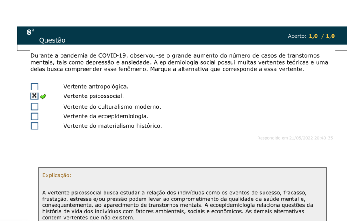 <p>Acerto: 1,0 / 1,0 Questão Durante a pandemia de COVID-19, observou-se o grande aumento do número de casos de transtornos mentais, tais como depressão e ansiedade. A epidemiologia social possui muitas vertentes teóricas e uma delas busca compreender esse fenômeno. Marque a alternativa que corresponde a essa vertente. Vertente antropológica. Vertente psicossocial. Vertente do culturalismo moderno. Vertente da ecoepidemiologia. Vertente do materialismo histórico. Respondido em 21/05/2022 20:40:35 Explicação: A vertente psicossocial busca a relação dos indivíduos como os eventos de sucesso, fracasso, frustação, estresse e/ou pressão podem levar ao comprometimento da qualidade da saúde mental e, ao aparecimento de transtornos mentais. A ecoepidemiologia relaciona questões da história de vida dos indivíduos com fatores ambientais, sociais e econômicos. As demais alternativas contem vertentes que não existem.</p>