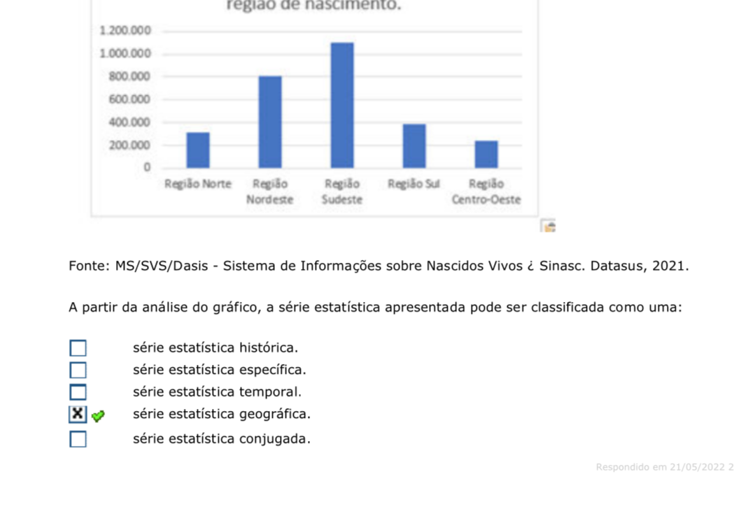 <p>de nascimento. 1.000.000 800.000 600.000 200.000 0 Região Norte Região Região Região Sul Região Nordeste Sudeste Centro-Oeste Fonte: MS/SVS/Dasis - Sistema de Informações sobre Nascidos Vivos Sinasc. Datasus, 2021. A partir da análise do gráfico, a série estatística apresentada pode ser classificada como uma: série estatística histórica. série estatística específica. série estatística temporal. série estatística geográfica. série estatística conjugada. Respondido em</p>