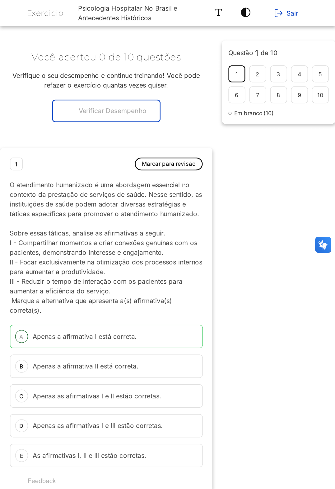 <p>Você acertou 0 de 10 questões</p><p>Verifique o seu desempenho e continue treinando! Você pode</p><p>refazer o exercício quantas vezes quiser.</p><p>Verificar Desempenho</p><p>A</p><p>B</p><p>C</p><p>D</p><p>E</p><p>1 Marcar para revisão</p><p>O atendimento humanizado é uma abordagem essencial no</p><p>contexto da prestação de serviços de saúde. Nesse sentido, as</p><p>instituições de saúde podem adotar diversas estratégias e</p><p>táticas específicas para promover o atendimento humanizado.</p><p>Sobre essas táticas, analise as afirmativas a seguir.</p><p>I � Compartilhar momentos e criar conexões genuínas com os</p><p>pacientes, demonstrando interesse e engajamento.</p><p>II � Focar exclusivamente na otimização dos processos internos</p><p>para aumentar a produtividade.</p><p>III � Reduzir o tempo de interação com os pacientes para</p><p>aumentar a eficiência do serviço.</p><p>Marque a alternativa que apresenta a(s) afirmativa(s)</p><p>correta(s).</p><p>Apenas a afirmativa I está correta.</p><p>Apenas a afirmativa II está correta.</p><p>Apenas as afirmativas I e II estão corretas.</p><p>Apenas as afirmativas I e III estão corretas.</p><p>As afirmativas I, II e III estão corretas.</p><p>Questão 1 de 10</p><p>Em branco �10�</p><p>1 2 3 4 5</p><p>6 7 8 9 10</p><p>Feedback</p><p>Exercicio</p><p>Psicologia Hospitalar No Brasil e</p><p>Antecedentes Históricos</p><p>Sair</p><p>A</p><p>B</p><p>C</p><p>D</p><p>E</p><p>Questão não respondida</p><p>Opa! A alternativa correta é a letra A. Confira o</p><p>gabarito comentado!</p><p>Gabarito Comentado</p><p>A afirmativa II está incorreta, pois a focar exclusivamente</p><p>na otimização dos processos pode negligenciar essa</p><p>dimensão crucial do cuidado.</p><p>A afirmativa III está incorreta, pois reduzir o tempo de</p><p>interação com os pacientes não é uma abordagem que</p><p>promove o atendimento humanizado. Pelo contrário, uma</p><p>interação mais prolongada e significativa permite que os</p><p>profissionais de saúde entendam melhor as necessidades</p><p>e preocupações dos pacientes.</p><p>2 Marcar para revisão</p><p>Considerando a estrutura do Sistema Único de Saúde �SUS) no</p><p>Brasil, que visa proporcionar acesso universal aos serviços de</p><p>saúde, é fundamental compreender os diferentes níveis de</p><p>atenção oferecidos à população.</p><p>Dentre esses níveis, qual corresponde ao contato inicial com o</p><p>SUS e é reconhecido como a "porta de entrada" para os</p><p>serviços de saúde no país?</p><p>Nível secundário.</p><p>Nível terciário.</p><p>Nível primário.</p><p>Nível quaternário.</p><p>Nível quinário.</p><p>A</p><p>B</p><p>C</p><p>D</p><p>E</p><p>Questão não respondida</p><p>Opa! A alternativa correta é a letra C. Confira o</p><p>gabarito comentado!</p><p>Gabarito Comentado</p><p>O nível primário de atenção à saúde é o contato inicial</p><p>com o SUS, caracterizando-se como a "porta de entrada"</p><p>para os serviços de saúde no Brasil. Este nível é</p><p>fundamental para a oferta de cuidados básicos e a</p><p>promoção da saúde da população. O nível secundário</p><p>refere-se a uma atenção de média complexidade,</p><p>enquanto o terciário envolve cuidados de alta</p><p>complexidade. Já os níveis quaternário e quinário são</p><p>conceitos menos comuns e não fazem parte da estrutura</p><p>padrão de atenção à saúde no contexto do SUS.</p><p>3 Marcar para revisão</p><p>A Psicologia Hospitalar tem sido reconhecida como uma peça-</p><p>chave no cuidado de saúde, não apenas no Brasil, mas em</p><p>todo o mundo.</p><p>Qual é a principal atribuição do psicólogo hospitalar em</p><p>relação aos pacientes em situações de terminalidade?</p><p>Administrar tratamentos medicamentosos para aliviar</p><p>a dor.</p><p>Auxiliar os pacientes na resolução de problemas</p><p>financeiros.</p><p>Fornecer suporte emocional e psicológico durante o</p><p>processo.</p><p>Realizar procedimentos cirúrgicos para prolongar a</p><p>vida.</p><p>Prescrever medicamentos para ajudar na aceitação</p><p>da morte.</p><p>A</p><p>B</p><p>Questão não respondida</p><p>Opa! A alternativa correta é a letra C. Confira o</p><p>gabarito comentado!</p><p>Gabarito Comentado</p><p>Embora seja importante considerar o alívio da dor,</p><p>administrar tratamentos medicamentosos não é uma</p><p>atribuição dos psicólogos hospitalares. Embora questões</p><p>financeiras possam ser relevantes para pacientes em</p><p>situações terminais, não são uma preocupação direta da</p><p>Psicologia Hospitalar. Uma das funções específicas dos</p><p>psicólogos hospitalares é fornecer suporte emocional e</p><p>psicológico aos pacientes nesses momentos delicados,</p><p>auxiliando-os a lidar com suas emoções e preocupações.</p><p>É importante destacar que os psicólogos hospitalares não</p><p>realizam procedimentos cirúrgicos, especialmente com o</p><p>objetivo de prolongar a vida dos pacientes em situações</p><p>terminais. Além disso, prescrever medicamentos para</p><p>aceitação da morte não está dentro das práticas éticas ou</p><p>recomendadas pela Psicologia Hospitalar.</p><p>4 Marcar para revisão</p><p>Nos dias de hoje, entendemos a saúde como um conceito</p><p>abrangente. Esse entendimento contrasta com o paradigma</p><p>antigo da unicausalidade.</p><p>Qual é a abordagem atual em relação à saúde, e como ela</p><p>difere do paradigma antigo da unicausalidade?</p><p>A abordagem atual considera a saúde como um</p><p>conceito multidimensional, envolvendo aspectos</p><p>físicos, mentais e sociais, enquanto o paradigma</p><p>antigo da unicausalidade se limitava a um único</p><p>aspecto da saúde.</p><p>A abordagem atual enfatiza a prevenção de doenças</p><p>e a promoção do bem-estar em todas as dimensões</p><p>da saúde, ao passo que o paradigma antigo da</p><p>unicausalidade se concentrava apenas no tratamento<