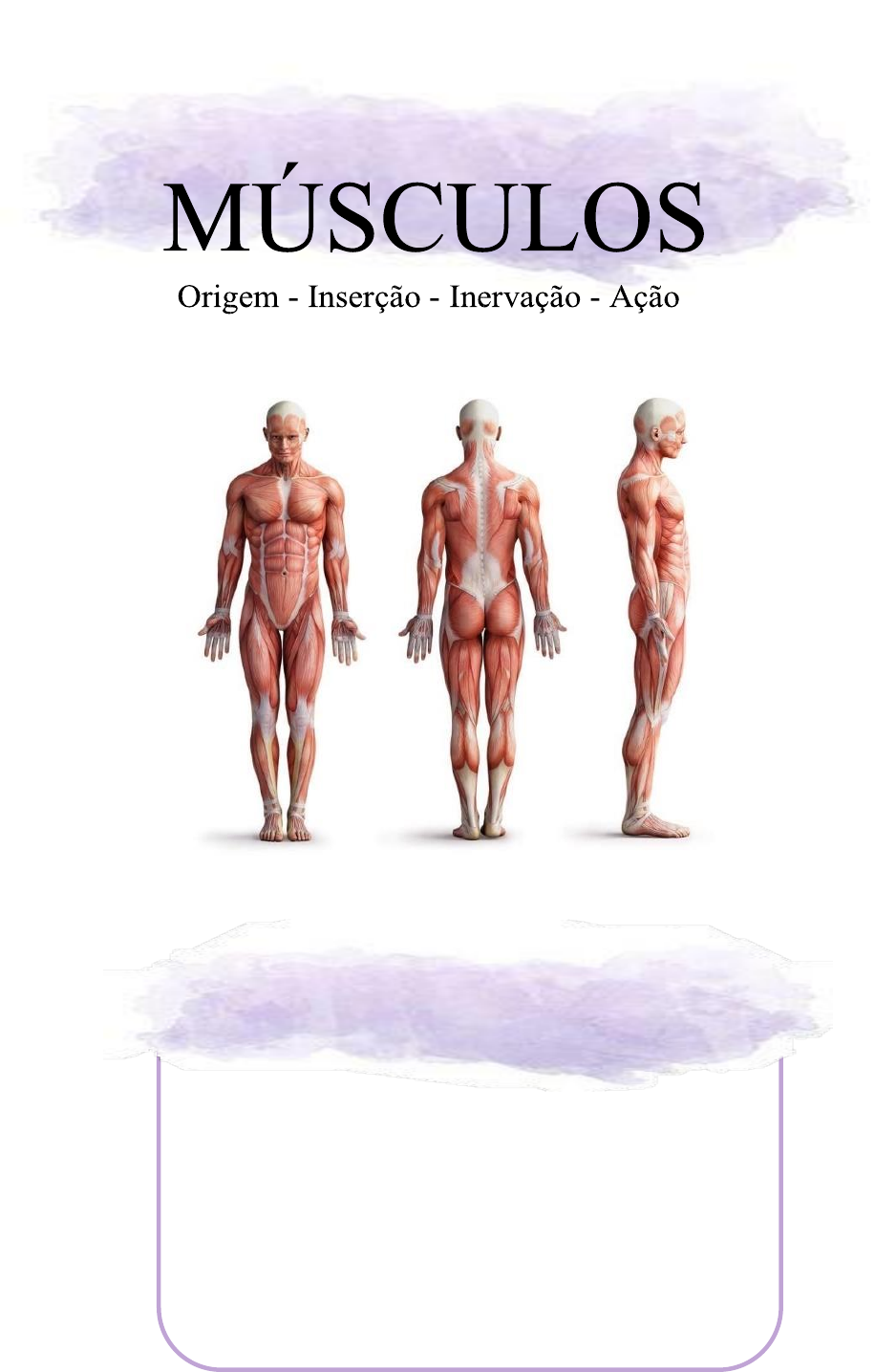 <p>lOMoARcPSD|45177662</p><p>Sumário</p><p>1. Músculos do PESCOÇO</p><p>2. Músculos do OMBRO</p><p>3. Músculos do DORSO</p><p>4. Músculos do TÓRAX</p><p>5. Músculos dos MEMBROS SUPERIORES</p><p>6. Músculos dos MEMBROS INFERIORES</p><p>lOMoARcPSD|45177662</p><p>MÚSCULOS - PESCOÇO</p><p>Músculo Origem Inserção Inervação</p><p>Ação</p><p>Imagem</p><p>PLATISMA</p><p>Base da</p><p>mandíbula</p><p>Pele por baixo</p><p>da</p><p>clavícula e</p><p>fáscia peitoral</p><p>Nervo facial</p><p>Traciona o lábio</p><p>inferior e o ângulo</p><p>bucal</p><p>ESTERNOCLEIIDO</p><p>MASTOIDEO</p><p>Clavícula e</p><p>manúbrio</p><p>Processo</p><p>mastoide -</p><p>linha nucal</p><p>superior do</p><p>osso occipital</p><p>Nervo</p><p>acessório e</p><p>nervo</p><p>cervical C2 e</p><p>C3</p><p>Inclinação para o</p><p>mesmo lado e</p><p>rotação</p><p>contralateral</p><p>ESCALENO</p><p>ANTERIOR</p><p>Vértebras C3 a</p><p>C6</p><p>Superfície</p><p>superior da</p><p>primeira</p><p>costela</p><p>Nervos</p><p>cervicais</p><p>Inclinação do</p><p>pescoço e auxílio</p><p>na respiração</p><p>ESCALENO</p><p>MÉDIO</p><p>Vértebras C2 a</p><p>C7</p><p>Superfície</p><p>superior da</p><p>primeira</p><p>costela</p><p>Nervos</p><p>cervicais</p><p>Inclinação do</p><p>pescoço e auxílio</p><p>na respiração</p><p>ESCALENO</p><p>POSTERIOR</p><p>Vértebras C4 a</p><p>C6</p><p>Superfície</p><p>externa da</p><p>primeira</p><p>costela</p><p>Nervos</p><p>cervicais</p><p>Inclinação do</p><p>pescoço e auxílio</p><p>na respiração</p><p>lOMoARcPSD|45177662</p><p>MÚSCULOS - OMBRO</p><p>Músculo Origem Inserção Inervação Ação Imagem</p><p>SUBESCAPULAR</p><p>Fossa</p><p>subescapular</p><p>Tubérculo</p><p>menor do</p><p>úmero</p><p>(manguito</p><p>rotador)</p><p>Nervo</p><p>subescapular</p><p>Rotação medial e</p><p>adução do ombro</p><p>SUPRA -</p><p>ESPINHOSO</p><p>Fossa supra</p><p>espinhal da</p><p>escápula</p><p>Tubérculo maior</p><p>do úmero</p><p>(manguito</p><p>rotador)</p><p>Nervo supra</p><p>escapular</p><p>Abdução do ombro</p><p>INFRA - ESPINHAL</p><p>Superfície</p><p>posterior da</p><p>escápula</p><p>Tubérculo maior</p><p>do úmero</p><p>(manguito</p><p>rotador)</p><p>Nervo supra</p><p>escapular</p><p>Rotação lateral e</p><p>adução do ombro</p><p>REDONDO MENOR</p><p>Escápula</p><p>posterior, borda</p><p>lateral</p><p>Tubérculo maior</p><p>do úmero</p><p>(manguito</p><p>rotador)</p><p>Nervo axilar</p><p>Rotação lateral e</p><p>adução do ombro</p><p>REDONDO MAIOR</p><p>Face posterior</p><p>do ângulo</p><p>inferior da</p><p>escápula</p><p>Lábio medial do</p><p>sulco</p><p>intertubercular</p><p>do úmero</p><p>Nervo</p><p>subescapular</p><p>Extensão, rotação</p><p>medial</p><p>e adução do ombro</p><p>DELTÓIDE</p><p>Terço final da</p><p>clavícula,</p><p>acrômio e</p><p>espinha da</p><p>escápula</p><p>Tuberosidade</p><p>deltoidea do</p><p>úmero</p><p>Nervo axilar</p><p>Abdução, extensão</p><p>e flexão</p><p>lOMoARcPSD|45177662</p><p>MÚSCULOS - DORSO</p><p>Músculo Origem Inserção Inervação Ação Imagem</p><p>TRAPÉZIO</p><p>Linha nucal</p><p>superior,</p><p>ligamento nucal e</p><p>processos</p><p>espinhosos da C7</p><p>á T12</p><p>Borda</p><p>posterior da</p><p>clavícula,</p><p>acrômio e</p><p>espinha da</p><p>escápula</p><p>Nervo</p><p>acessório</p><p>Elevação e</p><p>depressão do</p><p>ombro, adução e</p><p>rotação</p><p>superior das</p><p>escápulas</p><p>LATÍSSIMO DO</p><p>DORSO</p><p>Processos</p><p>espinhosos</p><p>das vértebras</p><p>torácicas e</p><p>lombares</p><p>Face proximal</p><p>e</p><p>distal do</p><p>úmero</p><p>Nervo</p><p>toracodorsal</p><p>Adução, extensão</p><p>e</p><p>rotação medial do</p><p>braço e</p><p>depressão do</p><p>ombro</p><p>ROMBOIDES</p><p>Processos</p><p>espinhosos de</p><p>C7 à T5</p><p>Borda medial</p><p>da escápula</p><p>Nervo dorsal</p><p>da escápula</p><p>Adução e rotação</p><p>inferior das</p><p>escápulas e</p><p>elevação do</p><p>ombro</p><p>LEVANTADOR</p><p>DA ESCÁPULA</p><p>Processo</p><p>transverso do</p><p>atlas até à C4</p><p>Ângulo</p><p>superior da</p><p>escápula</p><p>Nervo dorsal</p><p>da escápula</p><p>Elevação e adução</p><p>da escápula</p><p>SERRÁTIL</p><p>POSTERIOR</p><p>SUPERIOR</p><p>Processos</p><p>espinhosos da</p><p>C7 á T3</p><p>Borda superior</p><p>e face externa</p><p>da 2º a 5º</p><p>costelas</p><p>Nervos</p><p>intercostais</p><p>Elevação das</p><p>primeiras</p><p>costelas (ação</p><p>inspiratória)</p><p>SERRÁTIL</p><p>POSTERIOR</p><p>INFERIOR</p><p>Processos</p><p>espinhosos da</p><p>T11 à L3</p><p>Borda inferior</p><p>e face</p><p>externa das 4</p><p>últimas</p><p>costelas</p><p>Nervos</p><p>intercostais</p><p>Depressão das</p><p>últimas costelas</p><p>(ação expiratória)</p><p>ROTADORES</p><p>Processo</p><p>transversos</p><p>das vértebras</p><p>cervicais,</p><p>torácicas e</p><p>lombares</p><p>Lâmina e</p><p>processos</p><p>transversos</p><p>da vértebra</p><p>acima</p><p>Nervos</p><p>espinhais</p><p>Rotação e flexão</p><p>lateral da coluna</p><p>lOMoARcPSD|45177662</p><p>Músculo Origem Inserção Inervação Ação Imagem</p><p>ESPLÊNIO DA</p><p>CABEÇA</p><p>Processos</p><p>espinhosos da</p><p>C7 à T4</p><p>1/3 lateral da</p><p>linha nucal</p><p>superior e</p><p>processo</p><p>mastoide do osso</p><p>temporal</p><p>Nervos</p><p>espinhais</p><p>Extensão,</p><p>inclinação e</p><p>rotação</p><p>homolateral da</p><p>cabeça</p><p>ESPLÊNIO DO</p><p>PESCOÇO</p><p>Processo</p><p>espinhoso da</p><p>T3 à T6</p><p>Processo</p><p>transverso das</p><p>3 primeiras</p><p>vértebras</p><p>cervicais</p><p>Nervos</p><p>espinhais</p><p>Extensão,</p><p>inclinação e</p><p>rotação</p><p>homolateral da</p><p>cabeça</p><p>SEMIESPINHAL</p><p>DA CABEÇA</p><p>Processo</p><p>transverso de</p><p>C7 Á T7</p><p>Processo</p><p>articular de</p><p>C4 à C6 e</p><p>processo</p><p>espinhoso de</p><p>C7</p><p>Nervos</p><p>esp