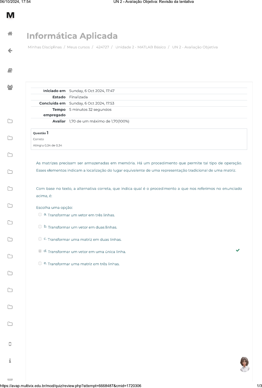 <p>06/10/2024, 17:54 UN 2 - Avaliação Objetiva: Revisão da tentativa M Informática Aplicada Minhas Disciplinas / Meus cursos / 424727 / Unidade 2 MATLAB Básico / UN 2 Avaliação Objetiva Iniciado em Sunday, 6 Oct 2024, 17:47 Estado Finalizada Concluída em Sunday, 6 Oct 2024, 17:53 Tempo 5 minutos 32 segundos empregado Avaliar 1,70 de um máximo de 1,70(100%) Questão 1 Correto Atingiu 0,34 de 0,34 As matrizes precisam ser armazenadas em Há um procedimento que permite tal tipo de operação. Esses elementos indicam a localização do lugar equivalente de uma representação tradicional de uma matriz. Com base no texto, a alternativa correta, que indica qual é o procedimento a que nos referimos no enunciado acima, é: Escolha uma opção: a. Transformar um vetor em três linhas. b. Transformar um vetor em duas linhas. C. Transformar uma matriz em duas linhas. d. Transformar um vetor em uma única linha. e. Transformar uma matriz em três linhas. i 1/3</p><p>06/10/2024, 17:54 UN 2 - Avaliação Objetiva: Revisão da tentativa Questão 2 M Correto Atingiu 0,34 de 0,34 A escrita de um código requer o raciocínio sobre a lógica de cada passo do algoritmo. Essa é a parte que requer maior atenção e cuidado, além de ser uma prática muito comum. Assim, não digitamos linhas de código, mas sim uma estrutura de código que serve para todo tipo de linguagem. Com base no texto, a alternativa que indica qual é nome que damos ao tipo de código a que nos referimos no enunciado acima é: Escolha uma opção: A. Linguagem. B. Código. C. Pseudocódigo. D. Prompt. E. Algoritmo. Questão 3 Correto Atingiu 0,34 de 0,34 Temos operadores relacionais e operacionais. Eles servem para realizar comparações entre números ou entre valores lógicos. resultado pode ser true ou false. Com base no texto, a alternativa correta, que indica um exemplo de operador relacional da "operação igual a", é: Escolha uma opção: a. == b. d. ~= e. >= 2/3</p><p>06/10/2024, 17:54 UN 2 - Avaliação Objetiva: Revisão da tentativa Questão 4 M Correto Atingiu 0,34 de 0,34 MATLAB possui diversas funções, como é o caso das funções predefinidas. Elas possuem essa configuração, pois estão integradas ao software, e são muito utilizadas. São funções que possuem objetivos essenciais para a escrita de qualquer processo de otimização. Com base no texto, a alternativa correta, com um exemplo de função integrada que gera uma matriz X n de uns, é: Escolha uma opção: a. ons (n) b. eyes (n) C. eye (n) d. ones (n) e. eyes (m, n) Questão 5 Correto Atingiu 0,34 de 0,34 Linhas de códigos são uma forma de escrever as operações que desejamos que sejam executadas em um programa de projeto. Nele, cada linha representa uma ação. Desejamos executar uma parte ou, ainda, repetidamente. Nesse caso, é preciso um tipo de projeto. Com base no texto, a alternativa correta, que indica qual é projeto a que nos referimos no enunciado acima, é: Escolha uma opção: a. Up-drain. b. Line-down. C. Top-drain. d. Top-down. e. Up-down. Conteúdo Online Seguir para... Conteúdo Online i 3/3</p>