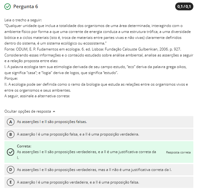 <p>Pergunta 6 0,1/0,1 Leia trecho a seguir: "Qualquer unidade que inclua a totalidade dos organismos de uma determinada, interagindo com ambiente físico por forma a que uma corrente de energia conduza a uma estrutura trófica, a uma diversidade biótica e a ciclos materiais (isto é, troca de materiais entre partes vivas e não vivas) claramente definidos dentro do sistema, é um sistema ecológico ou ecossistema." Fonte: ODUM, E. P. Fudamentos em ecologia. 6. ed. Lisboa: Fundação Calouste Gulbenkian, 2006. p. 927. Considerando essas informações e conteúdo estudado sobre análise ambiental, analise as asserções a seguir e a relação proposta entre elas: I. A palavra ecologia tem sua etimologia derivada de seu campo estudo, "eco" deriva da palavra grega oikos, que significa "casa"; e "logia" deriva de logos, que significa "estudo". Porque: II. A ecologia pode ser definida como O ramo da biologia que estuda as relações entre os organismos vivos e entre os organismos e seus ambientes. A seguir, assinale a alternativa correta: Ocultar opções de resposta A As asserções I e II são proposições falsas. B A asserção I é uma proposição falsa, e a é uma proposição verdadeira. Correta: As asserções I e II são proposições verdadeiras, e a II é uma justificativa correta da Resposta correta I. D As asserções e II são proposições verdadeiras, mas a II não é uma justificativa correta da I. E A asserção I é uma proposição verdadeira, e a II é uma proposição falsa.</p>