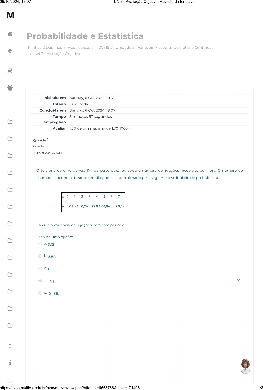 <p>06/10/2024, 19:07 UN 3 - Avaliação Objetiva: Revisão da tentativa M Probabilidade e Estatística Minhas Disciplinas / Meus cursos / 420819 / Unidade 3 - Variáveis Aleatórias Discretas e Continuas / UN 3 - Avaliação Objetiva Iniciado em Sunday, 6 Oct 2024, 19:01 Estado Finalizada Concluída em Sunday, 6 Oct 2024, 19:07 Tempo 5 minutos 57 segundos empregado Avaliar 1,70 de um máximo de 1,70(100%) Questão 1 Correto Atingiu 0,34 de 0,34 telefone de emergência 1X1, de certo país, registrou número de ligações recebidas por hora. número de chamadas por hora durante um dia pode ser aproximado pela seguinte distribuição de probabilidade. x 0 1 2 3 4 5 6 7 px 0,01 0,10 0,26 0,33 0,18 0,06 0,03 0,03 Calcule a variância de ligações para este período. Escolha uma opção: a. 9,12. b. 5,52. C. d. 1,91. e. 121,88. i 1/3</p><p>06/10/2024, 19:07 UN 3 Avaliação Objetiva: Revisão da tentativa Questão 2 M Correto Atingiu 0,34 de 0,34 X é uma variável aleatória contínua que representa eficiência de uma linha de produção durante período da manhã com fdp dada por fx abaixo. Calcule valor esperado. se x 1 se C.C. Escolha uma opção: b. E(X) = 2/3 C. 1/2. d. 4. e. 1. Questão 3 Correto Atingiu 0,34 de 0,34 telefone de emergência 1X1, de certo país, registrou número de ligações recebidas por hora. número de chamadas por hora durante um dia pode ser aproximado pela seguinte distribuição de probabilidade. x 0 1 2 3 4 5 6 7 px 0,01 0, 0,260,33 0,18 0,06 0,03 0,03 Calcule valor esperado de ligações para este período. Escolha uma opção: a. 2,03 b. 3,02 C. 0,43 d. 7 i 2/3</p><p>06/10/2024, 19:07 UN 3 - Avaliação Objetiva: Revisão da tentativa Questão 4 M Correto Atingiu 0,34 de 0,34 Considere caso da corrida de táxi, em que o valor cobrado pelo taxista referente a uma corrida de X km rodados + 2. Suponha X uma variável aleatória de fdp -0,15X para X e f(x)=0 para x</p>