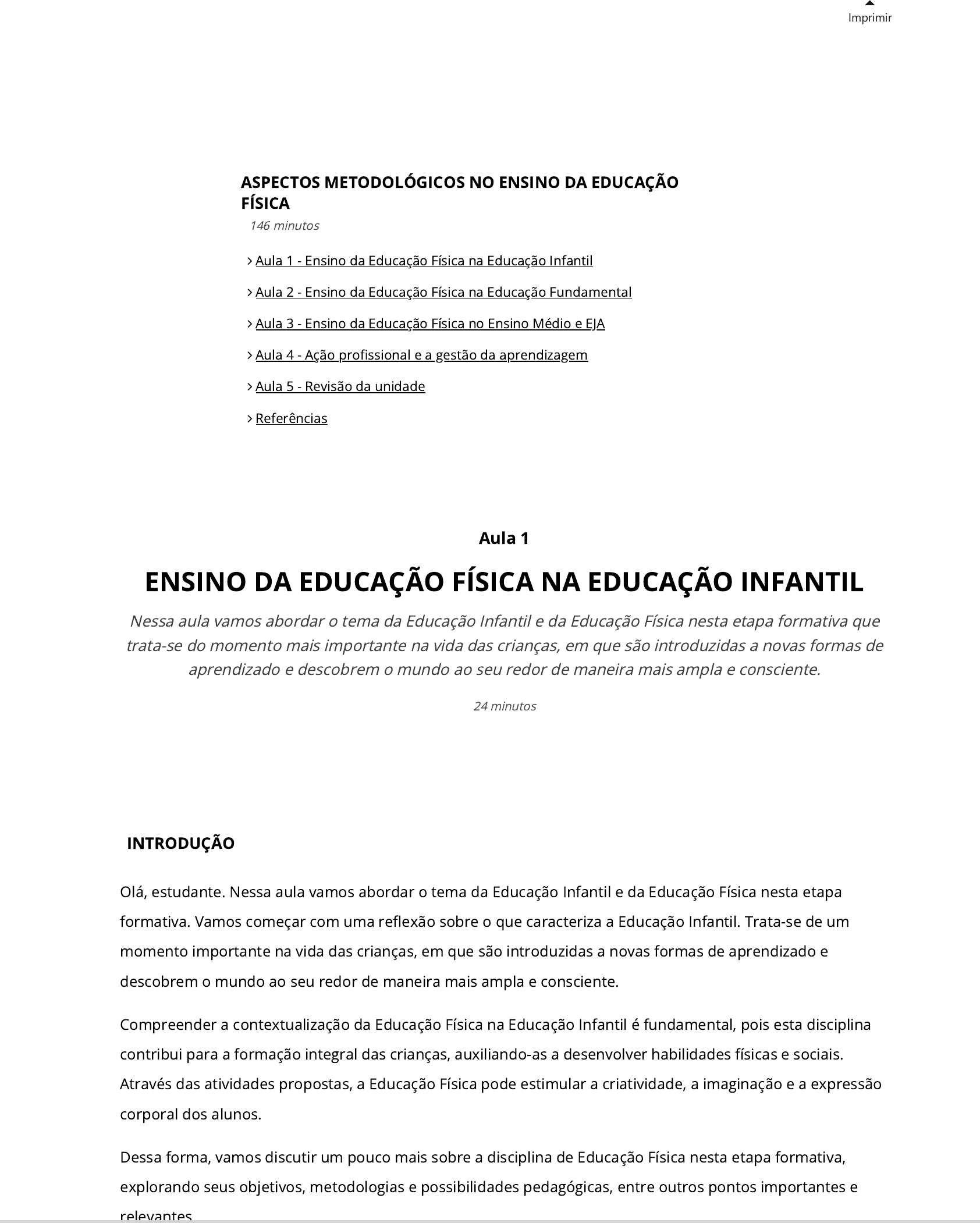 <p>06/05/2024, 16:48 wlldd_232_u4_met_ens_edu_fis</p><p>https://www.colaboraread.com.br/integracaoAlgetec/index?usuarioEmail=jorgedeath1902%40gmail.com&usuarioNome=JORGE+VINÍCIUS+MAIA+SILVA&disciplinaDescricao=&atividadeId=3928619&atividadeDesc… 1/29</p><p>Imprimir</p><p>INTRODUÇÃO</p><p>Olá, estudante. Nessa aula vamos abordar o tema da Educação Infantil e da Educação Física nesta etapa</p><p>formativa. Vamos começar com uma re�exão sobre o que caracteriza a Educação Infantil. Trata-se de um</p><p>momento importante na vida das crianças, em que são introduzidas a novas formas de aprendizado e</p><p>descobrem o mundo ao seu redor de maneira mais ampla e consciente.</p><p>Compreender a contextualização da Educação Física na Educação Infantil é fundamental, pois esta disciplina</p><p>contribui para a formação integral das crianças, auxiliando-as a desenvolver habilidades físicas e sociais.</p><p>Através das atividades propostas, a Educação Física pode estimular a criatividade, a imaginação e a expressão</p><p>corporal dos alunos.</p><p>Dessa forma, vamos discutir um pouco mais sobre a disciplina de Educação Física nesta etapa formativa,</p><p>explorando seus objetivos, metodologias e possibilidades pedagógicas, entre outros pontos importantes e</p><p>relevantes.</p><p>Aula 1</p><p>ENSINO DA EDUCAÇÃO FÍSICA NA EDUCAÇÃO INFANTIL</p><p>Nessa aula vamos abordar o tema da Educação Infantil e da Educação Física nesta etapa formativa que</p><p>trata-se do momento mais importante na vida das crianças, em que são introduzidas a novas formas de</p><p>aprendizado e descobrem o mundo ao seu redor de maneira mais ampla e consciente.</p><p>24 minutos</p><p>ASPECTOS METODOLÓGICOS NO ENSINO DA EDUCAÇÃO</p><p>FÍSICA</p><p> Aula 1 - Ensino da Educação Física na Educação Infantil</p><p> Aula 2 - Ensino da Educação Física na Educação Fundamental</p><p> Aula 3 - Ensino da Educação Física no Ensino Médio e EJA</p><p> Aula 4 - Ação pro�ssional e a gestão da aprendizagem</p><p> Aula 5 - Revisão da unidade</p><p> Referências</p><p>146 minutos</p><p>06/05/2024, 16:48 wlldd_232_u4_met_ens_edu_fis</p><p>https://www.colaboraread.com.br/integracaoAlgetec/index?usuarioEmail=jorgedeath1902%40gmail.com&usuarioNome=JORGE+VINÍCIUS+MAIA+SILVA&disciplinaDescricao=&atividadeId=3928619&atividadeDesc… 2/29</p><p>Vamos começar?</p><p>06/05/2024, 16:48 wlldd_232_u4_met_ens_edu_fis</p><p>https://www.colaboraread.com.br/integracaoAlgetec/index?usuarioEmail=jorgedeath1902%40gmail.com&usuarioNome=JORGE+VINÍCIUS+MAIA+SILVA&disciplinaDescricao=&atividadeId=3928619&atividadeDesc… 3/29</p><p>EDUCAÇÃO FÍSICA NA EDUCAÇÃO INFANTIL</p><p>A Educação Infantil é uma etapa da educação básica que tem como objetivo principal proporcionar às crianças</p><p>experiências de aprendizagem que favoreçam seu desenvolvimento integral. De acordo com a Lei de</p><p>Diretrizes e Bases da Educação Nacional (LDB), a Educação Infantil deve ser oferecida em creches para</p><p>crianças de 0 a 3 anos e em pré-escolas para crianças de 4 e 5 anos.</p><p>Essa etapa da educação tem como princípio a valorização da criança como sujeito de direitos, reconhecendo</p><p>suas especi�cidades, potencialidades e limitações. A Educação Infantil deve promover um ambiente acolhedor</p><p>e seguro, em que as crianças possam se expressar livremente e explorar o mundo à sua volta.</p><p>Devemos destacar também a importância da afetividade no ambiente educacional da Educação Infantil.</p><p>Segundo Silva (2021), a afetividade deve ser considerada como uma dimensão essencial no processo</p><p>educativo, pois proporciona segurança emocional e afetiva às crianças. Além disso, é fundamental que a</p><p>afetividade esteja presente nas relações entre professores, crianças e famílias, possibilitando um ambiente</p><p>acolhedor e afetivamente seguro.</p><p>A Educação Física na Educação Infantil tem como objetivo principal contribuir para o desenvolvimento motor e</p><p>cognitivo das crianças, por meio de atividades que promovam o movimento e a exploração do corpo em</p><p>diferentes situações e contextos. Nessa etapa formativa, as atividades de Educação Física devem ser lúdicas,</p><p>prazerosas e desa�adoras, permitindo que as crianças experimentem diferentes movimentos, habilidades e</p><p>desa�os.</p><p>De acordo com Buss-Simão (2013), a Educação Física na Educação Infantil deve priorizar o desenvolvimento da</p><p>coordenação motora ampla e �na, do equilíbrio, da lateralidade, da noção de espaço e tempo, da percepção</p><p>corporal e da consciência corporal. Além disso, é importante que as atividades de Educação Física sejam</p><p>integradas com as demais áreas do conhecimento, como a linguagem, a matemática, a ciência e a arte.</p><p>A disciplina de Educação Física na Educação Infantil possui características próprias, que a diferenciam das</p><p>demais etapas da Educação Básica. Nessa etapa formativa, as atividades de Educação Física devem ser</p><p>desenvolvidas de forma integrada com as demais áreas do conhecimento, favorecendo o desenvolvimento</p><p>global das crianças.</p><p>De acordo com a Base Nacional Comum Curricular (BNCC), a Educação Física na Educação Infantil deve</p><p>contemplar quatro eixos: corpo, gestos e movimentos; vivências e práticas de jogo; esporte e atividades</p><p>rítmicas e expressivas. Esses eixos devem ser trabalhados de forma lúdica, respeitando as necessidades e</p><p>interesses das crianças.</p><p>Em suma, a caracterização da Educação Infantil como uma etapa formativa que engloba as dimensões</p><p>cognitiva, afetiva, social e física das crianças é fundamental para que se compreenda a complexidade e a</p><p>importância desse período na formação dos indivíduos. A contextualização e caracterização da Educação</p><p>Física na Educação 