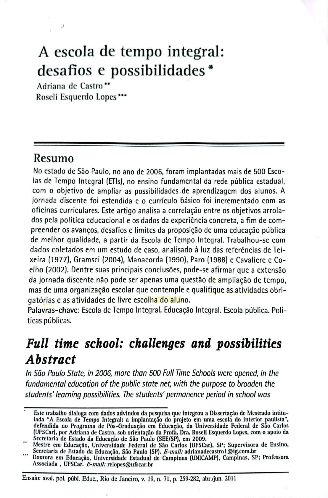 <p>A escola de tempo integral: desafios e possibilidades * Adriana de Castro** Roseli Esquerdo Lopes* Resumo No estado de São Paulo, no ano de 2006, foram implantadas mais de 500 Esco- las de Tempo Integral (ETIs), no ensino fundamental da rede pública estadual, com o objetivo de ampliar as possibilidades de aprendizagem dos alunos. A jornada discente foi estendida e currículo básico foi incrementado com as oficinas curriculares. Este artigo analisa a correlação entre os objetivos arrola- dos pela política educacional e os dados da experiência concreta, a fim de com- preender os avanços, desafios e limites da proposição de uma educação pública de melhor qualidade, a partir da Escola de Tempo Integral. Trabalhou-se com dados coletados em um estudo de caso, analisado à luz das referências de Tei- xeira (1977), Gramsci (2004), Manacorda (1990), Paro (1988) e Cavaliere e Co- elho (2002). Dentre suas principais conclusões, pode-se afirmar que a extensão da jornada discente não pode ser apenas uma questão de ampliação de tempo, mas de uma organização escolar que contemple e qualifique as atividades obri- gatórias e as atividades de livre escolha do aluno. Palavras-chave: Escola de Tempo Integral. Educação Integral. Escola pública. Polí- ticas públicas. Full time school: challenges and possibilities Abstract In São Paulo State, in 2006, more than 500 Full Time Schools were opened, in the fundamental education of the public state net, with the purpose to broaden the students' learning possibilities. The students' permanence period in school was Este trabalho dialoga com dados advindos da pesquisa que integrou a Dissertação de Mestrado intitu- lada "A Escola de Tempo Integral: a implantação do projeto em uma escola do interior paulista", defendida no Programa de Pós-Graduação em Educação, da Universidade Federal de São Carlos (UFSCar), por Adriana de Castro, sob orientação da Profa. Dra. Roseli Esquerdo Lopes, com apoio da Secretaria de Estado da Educação de São Paulo (SEE/SP), em 2009. Mestre em Educação, Universidade Federal de São Carlos (UFSCar), SP; Supervisora de Ensino, Secretaria de Estado da Educação, São Paulo (SP). E-mail: adrianadecastro1@ig.com.b Doutora em Educação, Universidade Estadual de Campinas (UNICAMP), Campinas, SP; Professora Associada UFSCar. E-mail: relopes@ufscar.br Ensaio: aval. pol. públ. Educ., Rio de Janeiro, V. 19, n. 71, p. 259-282, abr./jun. 2011</p><p>260 Adriana de Castro e Roseli Esquerdo Lopes extended and the basic curriculum was enhanced with curriculum workshops. article analyses the relationship between the objectives proposed by the educational This policies and the specific experience data, and its goal is to understand the advances, challenges and limits of this initiative, which is meant to achieve a better quality public A case study data was analyzed according to Teixeira's (1977), Gramsci's (2004), Manacorda's (1990), Paro's (1988) and Cavaliere's and Coelho's (2002) references. Among the main conclusions, we can state that the students' period length cannot be only a time enlargement, but a period to qualify the compulsory activities and the students' free choice activities. Keywords: Integral Time School. Integral Education. Public school. Public policies. Escuelas de tiempo integral: desafios y posibilidades Resumen En la provincia de San Pablo, en el 2006, se implantaron más de 500 Escuelas de Tiempo Integral (ETIs) en la Escuela Primaria de la red pública provincial, con el objetivo de ampliar las posibilidades de aprendizaje de los alumnos. La jornada discente se extendió con los talleres curriculares. Este artículo analiza la correlación entre los objetivos propuestos por la política educacional y los datos de un estudio de caso, a la luz de las obras de Teixeira, Gramsci, Manacorda, Paro y Cavaliere, con la finalidad de comprender los avances, los retos y los límites de la proposición de una educación pública de mejor calidad, a partir de la implantación de Escuelas de Tiempo Integral. Entre sus principales conclusiones, se puede afirmar que la extensión de la jornada discente no puede ser sólo una cuestión de ampliación del tiempo de permanencia, sino una organización escolar que contemple y califique las actividades obligatorias y las de libre elección del alumno. Palabras claves: Escuelas de Tiempo Integral. Educación Integral. Escuela Pública. Políticas Públicas. Introdução No estado de São Paulo, durante a gestão de Geraldo Alckimin (2003-2006), do Partido da Social Democracia Brasileira (PSDB), 0 Secretário de Estado da Educação de São Paulo, à época, Gabriel Benedito Isaac Chalita, com a Resolução SE 89 (SÃO PAULO, 2005), instituiu 0 projeto Escola de Tempo Integral em algumas esco- las da rede pública estadual de ensino fundamental. Este projeto teve 0 objetivo de prolongar tempo diário de permanência diário dos alunos (de 5 para 9 horas), com vistas a ampliar suas possibilidades de aprendizagem, com as oficinas curricu- lares compostas por: Orientação para Estudo e Pesquisa, Atividades de Linguagem e de Matemática, Atividades Artísticas, Esportivas/Motoras e de Participação Social. De acordo com as "Diretrizes das Escolas de Tempo Integral: tempo e qualida- de", cuja elaboração ficou sob responsabilidade da Coordenadoria de Estudos e Ensaio: aval. pol. públ. Educ., Rio de Janeiro, V. 19, n. 71, p. 259-282, abr./jun. 2011</p><p>A escola de tempo integral: desafios e possibilidades 261 Normas Pedagógicas (CENP), órgão da Secretaria de Estado da Educação, a função social da escola é vista como a "alavança de um processo que visa à formação de pessoas aptas a exercerem sua plena cidadania" (SÃO PAULO, 2006b, p. 14). Para alcançar esse objetivo, as diretrizes prevêem a "ampliação do tempo físico com a intensidade das ações educacionais" (SÃO PAULO, 2006b, p. 5), com uma nova organização curricular que propõe a man