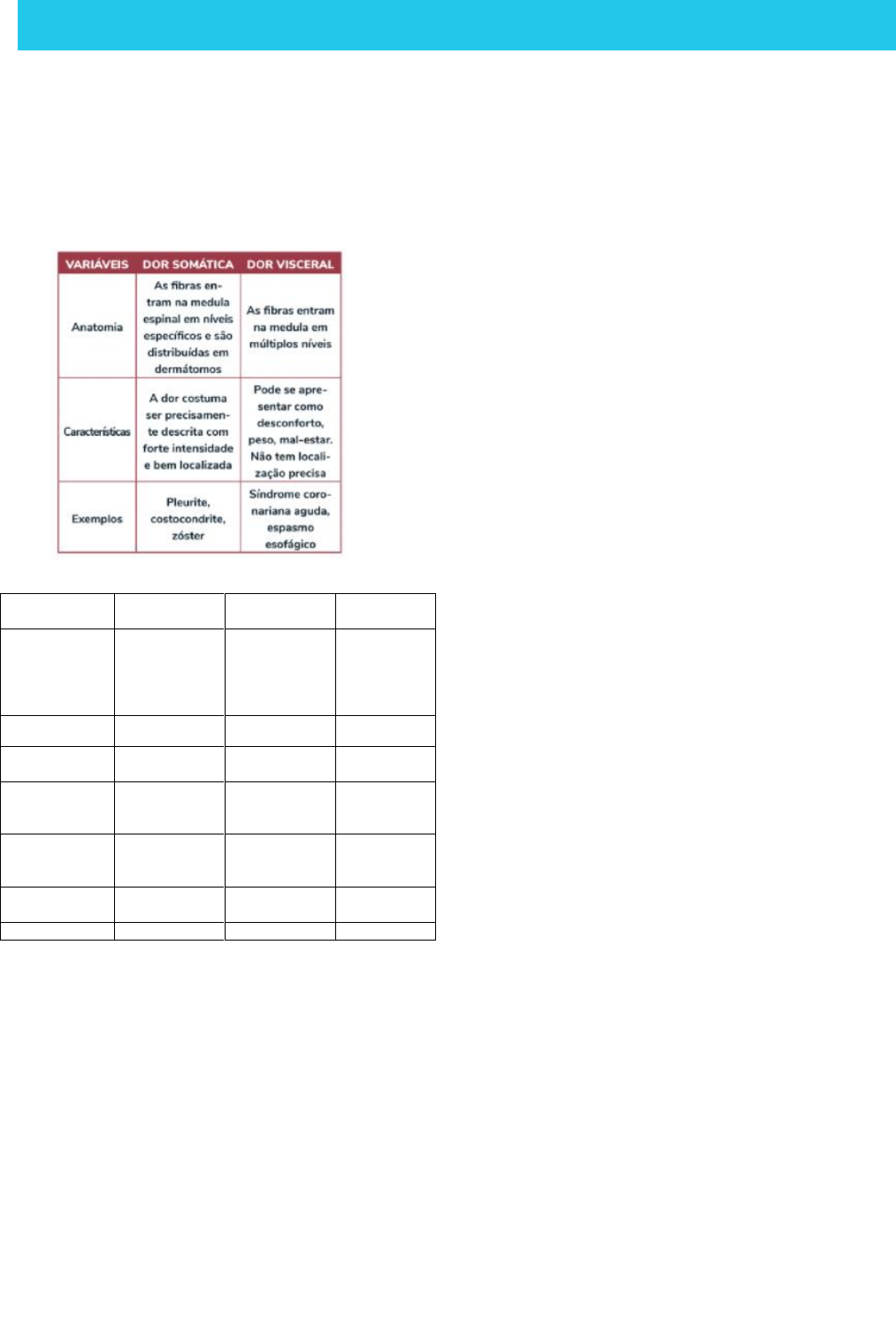 <p>DOR TORÁCICA</p><p>A dor torácica pode ter diversas origens e</p><p>mecanismos diferentes. Uma das formas de</p><p>diferenciação da origem da dor é a diferença</p><p>entre a estimulação nervosa somática ou</p><p>visceral durante a investigação clínica</p><p>Cardiovascular Respiratória Gastrointestinal Músculo-</p><p>esquelético</p><p>Isquemia(angina</p><p>ou IAM)</p><p>Embolia</p><p>pulmonar</p><p>Colecistite Síndrome da</p><p>parede</p><p>torácica</p><p>(inflamação</p><p>da parede)</p><p>Pericardite Pneumotórax Pancreatite Costocondrite</p><p>Dissecção da</p><p>aorta torácica</p><p>Pneumonia Hérnia de hiato Herpes Zoster</p><p>Pleurite</p><p>(irritação</p><p>pleural)</p><p>Doença</p><p>esofágica</p><p>Trauma da</p><p>parede</p><p>torácia</p><p>Hiperventilação</p><p>(ansiedade)</p><p>Úlcera péptica Tumor da</p><p>parede</p><p>torácica</p><p>Tumor Dispepsia</p><p>(indigestão)</p><p>Doenças da</p><p>mama</p><p>Fibromialgia</p><p>História do paciente</p><p>• Idade</p><p>• Episódios anteriores</p><p>• IVAS - pois pode gerar pericardite,</p><p>pleurite, miocardite, já a endocardite</p><p>pode ser causada por tratamento</p><p>dentários, colocação de piercing na língua</p><p>• Febre</p><p>• Trauma</p><p>• Estresse</p><p>• Alterações emocionais</p><p>• Doença cardíaca prévia (angina, IAM, HAS)</p><p>• Flebite</p><p>Causas de dor torácicas</p><p>• Cardiovascular: isquêmica (angina ou</p><p>IAM), pericardite, dissecção da aorta</p><p>torácica, embolia pulmonar, hipertensão</p><p>pulmonar.</p><p>• Respiratórias: pneumotórax, pneumonia</p><p>por irritação pleural, pleurite não</p><p>infecciosa, tuberculose pleural</p><p>• Gastrointestinal: Colecistite. doença</p><p>esofágica, refluxo gastroesofágico/</p><p>espasmos, úlcera péptica</p><p>• Músculo-esquelético: síndrome da parede</p><p>torácica, costocondrite, herpes zoster,</p><p>trauma da parede torácica, tumor da</p><p>parede torácica, doenças da mama,</p><p>fibromialgia.</p><p>O que deve ser explorado na anamnese</p><p>• Início da dor (súbito, gradual)</p><p>• Duração da dor (minutos, horas, variável)</p><p>Características da dor</p><p>• pleurítica (dor aguda à inspiração)</p><p>• espasmódica (espasmos)</p><p>• em aperto ou em peso</p><p>• aguda ou localizada</p><p>• visceral (difícil de apontar); em queimação</p><p>• como se rasgasse; insuportável</p><p>• posição antálgica</p><p>Localização da dor</p><p>• depende da situação; ansiedade</p><p>• subesternal</p><p>• central ou em todo o tórax</p><p>• na parte lateral do tórax</p><p>• localizado no local envolvido (ex. se for</p><p>um trauma)</p><p>• irradia para a mandíbula, pescoço, costas</p><p>ou braço</p><p>• Se é uma dor vaga</p><p>Antecedentes</p><p>• Fatores de alívio</p><p>• Fatores de agravamento</p><p>• Sintomas associados</p><p>Sinais e sintomas</p><p>• Dispnéia</p><p>• Diaforese (transpiracao interna)</p><p>• Náusea e vômito</p><p>• Fraqueza, tontura, síncope</p><p>• Alteração neurológica</p><p>• Hipo ou hipertensão ou PA desigual</p><p>• Sons respiratórios anormais ou diminuído</p><p>• Cianose</p><p>• Hemoptise</p><p>• Massa abdominal pulsátil</p><p>• Dor abdominal</p><p>• Dor vesicular à palpação</p><p>• Rash ou lesões</p><p>ANGINA</p><p>• (não tem alteração de enzimas cardíacas)</p><p>• A dor tem um início súbito com duração</p><p>de 20 minutos ou mais</p><p>• Característica espasmódica, em aperto ou</p><p>peso e em queimação</p><p>• Localização: subesternal, irradia para</p><p>mandíbula, pescoço, costas ou braços</p><p>• Sintomas associados: dispneia, diaforese,</p><p>hipo ou hipertensão</p><p>• História: idade (acomete mais idosos),</p><p>episódios prévios, doença cardíaca (HAS,</p><p>angina, IAM)</p><p>• Fatores de piora: estresse, exercício, após</p><p>alimentação, deitado, situacional,</p><p>ansiedade</p><p>• Fatores de alívio: repouso ou diminuição</p><p>do movimento, posição,</p><p>nitroglicerina/nitrato</p><p>Sinal de Levine: Sinal da mão fechada</p><p>colocada de maneira imprecisa sobre a região</p><p>esternal, sugestivo de dor torácica de origem</p><p>cardíaca.</p><p>**Sinal típico de dor no peito com etiologia</p><p>cardíaca</p><p>• Estável – dor anginosa há mais de 48h,</p><p>desencadeada por mesma intensidade de</p><p>esforço</p><p>• Instável – dor anginosa recente, ou ao</p><p>repouso ou a esforços cada vez menores</p><p>(o infarto agudo do miocárdio tem</p><p>características semelhantes).</p><p>* O ecg na angina pode ou não estar alterado,</p><p>mais não tem supradesnivelamento de ST</p><p>A carga do trabalho cardíaco e a resultante</p><p>demanda de oxigênio pelo miocárdico</p><p>superam a capacidade das artérias coronárias</p><p>de suprir uma quantidade adequada de</p><p>sangue oxigenado. Esse desequilíbrio entre a</p><p>oferta e a demanda pode ocorrer quando as</p><p>artérias estão estenosadas. Normalmente, a</p><p>obstrução resulta de aterosclerose arterial</p><p>coronariana, mas pode resultar de espasmo</p><p>da artéria coronária ou, raramente, de</p><p>embolia arterial coronariana. Trombose</p><p>coronariana aguda pode provocar angina se a</p><p>obstrução é parcial ou transitória, mas</p><p>geralmente causa infarto agudo do miocárdio</p><p>(IAM).Além do esforço, a carga de trabalho</p><p>cardíaca pode aumentar por doenças como</p><p>hipertensão ,regurgitação aórtica ,estenose</p><p>aórtica ou miocardiopatia hipertrófica .</p><p>Nesses casos, pode haver angina com ou sem</p><p>aterosclerose. Essas enfermidades também</p><p>podem diminuir a perfusão miocárdica</p><p>relativa pelo aumento da massa miocárdica</p><p>(causando diminuição do fluxo diastólico)</p><p>INFARTO AGUDO DO MIOCÁRDIO</p><p>• Início súbito, duração de minutos a horas</p><p>• Em aper