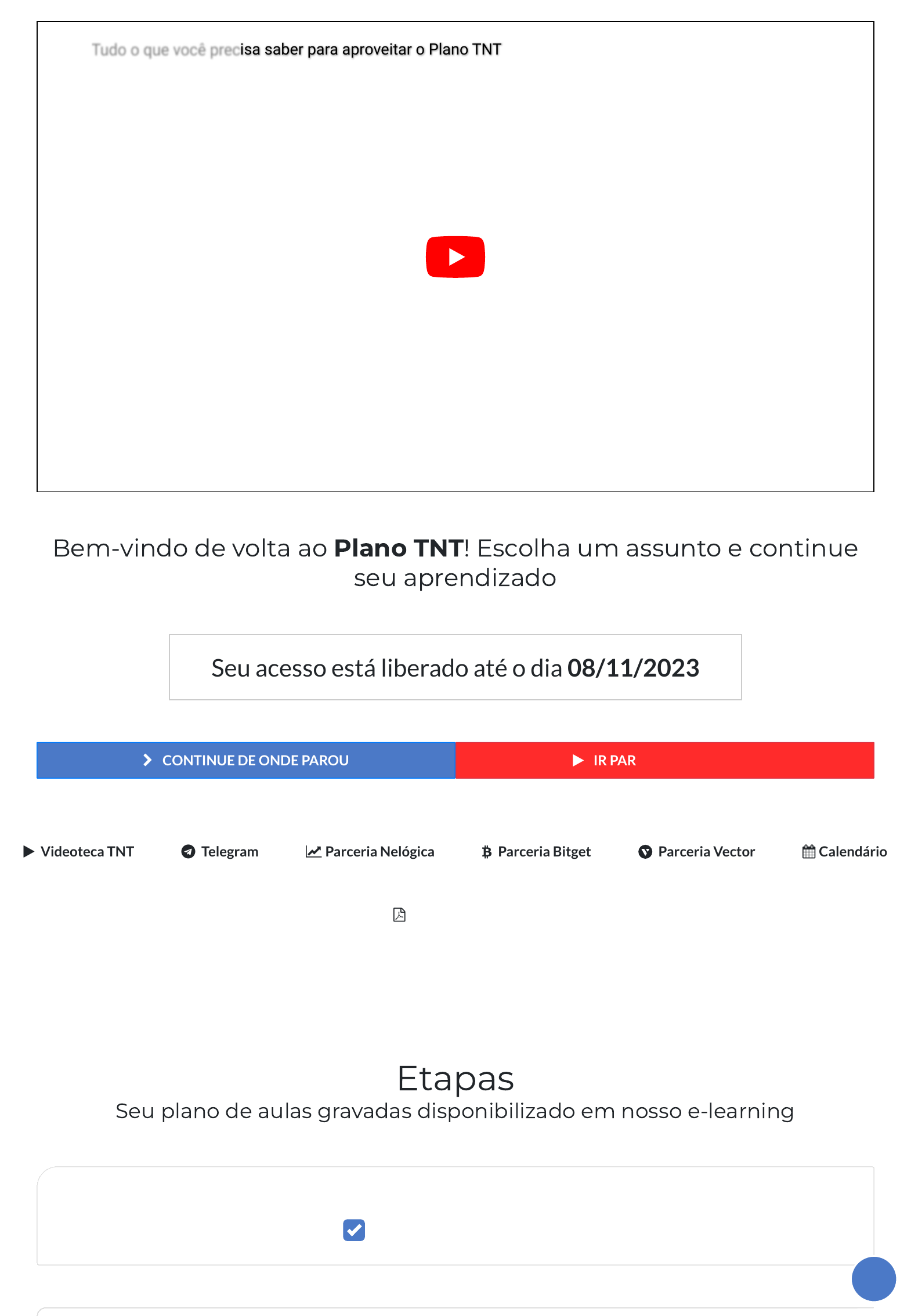 <p>27/05/2023, 19:10 Plano TNT: Home - Formação de Traders Completa do Portal</p><p>https://portaldotrader.com.br/plano-tnt 1/13</p><p>Bem-vindo de volta ao Plano TNT! Escolha um assunto e continue</p><p>seu aprendizado</p><p>Seu acesso está liberado até o dia 08/11/2023</p><p> CONTINUE DE ONDE PAROU IR PARA A SALA AO VIVO</p><p>Etapas</p><p>Seu plano de aulas gravadas disponibilizado em nosso e-learning</p><p>Tudo o que você precisa saber para aproveitar o Plano TNTTudo o que você precisa saber para aproveitar o Plano TNT</p><p> Videoteca TNT Telegram Parceria Nelógica Parceria Bitget Parceria Vector Calendário</p><p> Manual do Aluno</p><p>Você já tem uma base e quer ocultar as primeiras etapas?</p><p>Ocultar Etapas de Nivelamento</p><p></p><p>https://portaldotrader.com.br/plano-tnt/go-to-last-lecture</p><p>https://portaldotrader.com.br/plano-tnt/aovivo</p><p>https://www.youtube.com/watch?v=fk1vz3xAV5Y</p><p>https://portaldotrader.com.br/videoteca-tnt</p><p>https://t.me/+PS4JCoP8dJI0NmJh</p><p>https://partner.bitget.com/bg/portaldotrader</p><p>https://www.vectorcrypto.com.br/pt/promo/portaldotrader</p><p>https://portaldotrader.com.br/manual-do-aluno-plano-tnt.pdf</p><p>27/05/2023, 19:10 Plano TNT: Home - Formação de Traders Completa do Portal</p><p>https://portaldotrader.com.br/plano-tnt 2/13</p><p>Vamos te ajudar a desvendar os padrões</p><p>grá�cos, os principais indicadores e as</p><p>ferramentas para operar analisando o preço e o</p><p>volume dos ativos. Você vai aprender a</p><p>metodologia de trading mais utilizada no mundo.</p><p> 4,8 (16.104)</p><p> INICIAR ETAPA 4</p><p>Aprenda como operar através dos grá�cos</p><p> Fundamentos</p><p>0 / 5 Aulas Concluídas</p><p> Conceitos básicos</p><p>0 / 5 Aulas Concluídas</p><p> Operando com indicadores</p><p>0 / 12 Aulas Concluídas</p><p> Introdução aos investimentos quantitativos</p><p>0 / 3 Aulas Concluídas</p><p>Etapa 1 - Começando do zero</p><p>0 / 38 AULAS CONCLUÍDAS</p><p>Etapa 2 - Trader Pro�ssional</p><p>0 / 40 AULAS CONCLUÍDAS</p><p>Etapa 3 - Estrutura do Mercado</p><p>0 / 30 AULAS CONCLUÍDAS</p><p>Etapa 4 - Análise Técnica</p><p>0 / 25 AULAS CONCLUÍDAS</p><p></p><p>https://portaldotrader.com.br/plano-tnt/analise-tecnica</p><p>https://portaldotrader.com.br/plano-tnt/analise-tecnica/fundamentos</p><p>https://portaldotrader.com.br/plano-tnt/analise-tecnica/conceitos-basicos</p><p>https://portaldotrader.com.br/plano-tnt/analise-tecnica/operando-com-indicadores</p><p>https://portaldotrader.com.br/plano-tnt/analise-tecnica/introducao-aos-investimentos-quantitativos</p><p>27/05/2023, 19:10 Plano TNT: Home - Formação de Traders Completa do Portal</p><p>https://portaldotrader.com.br/plano-tnt 3/13</p><p>Chegou a hora de executar na prática os</p><p>melhores setups de Análise Técnica e Price</p><p>Action. Você vai aprender a identi�car as</p><p>oportunidades, escolher o ativo certo e</p><p>encontrar os momentos ideais para entrar e sair</p><p>da operação.</p><p> 4,8 (14.503)</p><p> INICIAR ETAPA 5</p><p>Execute diversos setups do começo ao �m</p><p> Setups de Price Action</p><p>0 / 8 Aulas Concluídas</p><p> Setups com indicadores simples</p><p>0 / 8 Aulas Concluídas</p><p> Setups com indicadores combinados</p><p>0 / 7 Aulas Concluídas</p><p> Especialização em Análise Técnica</p><p>0 / 6 Aulas Concluídas</p><p> Operações Automatizadas</p><p>0 / 4 Aulas Concluídas</p><p>Etapa 5 - Análise Técnica na prática</p><p>0 / 33 AULAS CONCLUÍDAS</p><p>Etapa 6 - Análise Fundamentalista</p><p>0 / 35 AULAS CONCLUÍDAS</p><p></p><p>https://portaldotrader.com.br/plano-tnt/analise-tecnica-na-pratica</p><p>https://portaldotrader.com.br/plano-tnt/analise-tecnica-na-pratica/setups-de-price-action</p><p>https://portaldotrader.com.br/plano-tnt/analise-tecnica-na-pratica/setups-com-indicadores-simples</p><p>https://portaldotrader.com.br/plano-tnt/analise-tecnica-na-pratica/setups-com-indicadores-combinados</p><p>https://portaldotrader.com.br/plano-tnt/analise-tecnica-na-pratica/especializacao-em-analise-tecnica</p><p>https://portaldotrader.com.br/plano-tnt/analise-tecnica-na-pratica/operacoes-automatizadas</p><p>27/05/2023, 19:10 Plano TNT: Home - Formação de Traders Completa do Portal</p><p>https://portaldotrader.com.br/plano-tnt 4/13</p><p>Entenda o mundo por trás do preço dos ativos.</p><p>Os fundamentos que explicam parte da</p><p>valorização de uma ação podem estar na sua</p><p>balança patrimonial, no demonstrativo de</p><p>resultados ou na perspectiva de crescimento da</p><p>empresa. Dessa forma, aprenda a montar uma</p><p>carteira sem micos!</p><p> 4,8 (6.367)</p><p> INICIAR ETAPA 6</p><p>Aprenda como os fundamentos de uma</p><p>empresa podem impactar no preço de suas</p><p>ações</p><p> Ações! O que são?</p><p>0 / 4 Aulas Concluídas</p><p> Introdução à Analise Fundamentalista</p><p>0 / 8 Aulas Concluídas</p><p> Introdução à Analise de Múltiplos</p><p>0 / 10 Aulas Concluídas</p><p> Análise Fundamentalista na Prática</p><p>0 / 4 Aulas Concluídas</p><p> Fundos Imobiliários</p><p>0 / 9 Aulas Concluídas</p><p>Etapa 7 - Tape Reading</p><p>0 / 26 AULAS CONCLUÍDAS</p><p></p><p>https://portaldotrader.com.br/plano-tnt/analise-fundamentalista</p><p>https://portaldotrader.com.br/plano-tnt/analise-fundamentalista/acoes-o-que-sao</p><p>https://portaldotrader.com.br/plano-tnt/analise-fundamentalista/introducao-a-analise-fundamentalista</p><p>https://portaldotrader.com.br/plano-tnt/analise-fundamentalista/introducao-a-analise-de-multiplos</p><p>https://portaldotrader.com.br/plano-tnt/analise-fundamentalista/analise-fundamentalista-na-pratica</p><p>https://portaldotrader.com.br/plano-tnt/analise-fundamentalista/fundos-imobiliarios</p><p>27/05/2023, 19:10 Plano TNT: Home - Formação de Traders Completa do Portal</p><p>https://portaldotrader.com.br/plano-tnt 5/13</p><p>Você vai identi�car as forças de compra e venda</p><p>através das negociações registradas no Times</p><