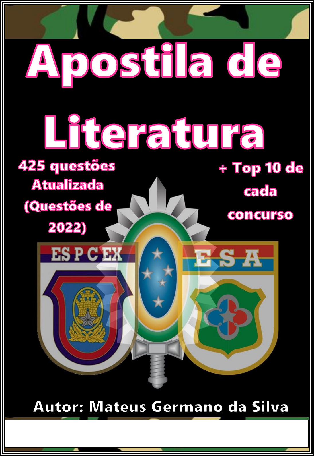 <p>Aluno:</p><p>.</p><p>Autor: Mateus Germano da Silva</p><p>Instagram: @mateus.germano.2001</p><p>Concursos Militares abordados: EsSA e EsPCEx</p><p>Sumário</p><p>• Conteúdo Programático de cada concurso ------------------------------------------------- 4</p><p>• Relação de questões por concurso em cada assunto -------------------------------------- 5</p><p>• Top 10 de Literatura de cada Concurso ---------------------------------------------------- 5</p><p>• Gêneros Literários ------------------------------------------------------------------------------- 6</p><p>➢ Gabarito --------------------------------------------------------------------------------------- 11</p><p>• Trovadorismo ----------------------------------------------------------------------------------- 12</p><p>➢ Gabarito --------------------------------------------------------------------------------------- 16</p><p>• Humanismo -------------------------------------------------------------------------------------- 17</p><p>➢ Gabarito --------------------------------------------------------------------------------------- 20</p><p>• Classicismo -------------------------------------------------------------------------------------- 21</p><p>➢ Gabarito --------------------------------------------------------------------------------------- 23</p><p>• Quinhentismo ----------------------------------------------------------------------------------- 24</p><p>➢ Gabarito --------------------------------------------------------------------------------------- 26</p><p>• Barroco ------------------------------------------------------------------------------------------- 27</p><p>➢ Gabarito --------------------------------------------------------------------------------------- 33</p><p>• Arcadismo --------------------------------------------------------------------------------------- 34</p><p>➢ Gabarito --------------------------------------------------------------------------------------- 39</p><p>• Romantismo – Prosa e Poesia ---------------------------------------------------------------- 40</p><p>➢ Gabarito -------------------------------------------------------------------------------------- 46</p><p>• Realismo e Naturalismo ----------------------------------------------------------------------- 47</p><p>➢ Gabarito --------------------------------------------------------------------------------------- 54</p><p>• Parnasianismo ---------------------------------------------------------------------------------- 55</p><p>➢ Gabarito --------------------------------------------------------------------------------------- 58</p><p>• Simbolismo -------------------------------------------------------------------------------------- 59</p><p>➢ Gabarito --------------------------------------------------------------------------------------- 63</p><p>• Pré-Modernismo -------------------------------------------------------------------------------- 64</p><p>➢ Gabarito --------------------------------------------------------------------------------------- 68</p><p>• Modernismo – Prosa e Poesia ---------------------------------------------------------------- 69</p><p>➢ 1ª Geração – “Geração de 22” ------------------------------------------------------------- 69</p><p>➢ 2ª Geração – “Geração de 30” ------------------------------------------------------------- 72</p><p>➢ 3ª Geração – “Geração de 45” ------------------------------------------------------------- 75</p><p>➢ Gabarito --------------------------------------------------------------------------------------- 79</p><p>• Tendências da Literatura Brasileira Contemporânea ---------------------------------- 80</p><p>➢ Gabarito --------------------------------------------------------------------------------------- 84</p><p>• Identificar Qual é a Escola Literária ------------------------------------------------------- 85</p><p>➢ Gabarito --------------------------------------------------------------------------------------- 96</p><p>Conteúdo Programático cada assunto</p><p>EsSA</p><p>• Contexto histórico, características, principais autores e obras do Quinhentismo, Barroco, Arcadismo, Romantismo, Realismo,</p><p>Naturalismo, Impressionismo, Parnasianismo, Simbolismo, Prémodernismo e Modernismo.</p><p>EsPCEx</p><p>• Literatura e história da literatura;</p><p>• Gêneros literários;</p><p>• Linguagem poética;</p><p>• Elementos da narrativa;</p><p>• Trovadorismo;</p><p>• Humanismo;</p><p>• Classicismo;</p><p>• Quinhentismo;</p><p>• Barroco;</p><p>• Arcadismo;</p><p>• Romantismo - prosa e poesia;</p><p>• Realismo/Naturalismo;</p><p>• Parnasianismo;</p><p>• Simbolismo;</p><p>• Pré-Modernismo;</p><p>• Movimentos de vanguarda europeia no Brasil;</p><p>• Modernismo Brasileiro - prosa e poesia (1ª, 2ª e 3ª gerações); e</p><p>• Tendências da literatura brasileira contemporânea.</p><p>4</p><p>Relação de questões por provas em cada assunto</p><p>Assuntos EsSA EsPCEx Diversos Total</p><p>Gêneros Literários 3 4 23 30</p><p>Trovadorismo ⚫ 1 24 25</p><p>Humanismo ⚫ 0 15 15</p><p>Classicismo ⚫ 3 7 11</p><p>Quinhentismo 2 1 12 15</p><p>Barroco 3 1 26 30</p><p>Arcadismo 1 4 20 25</p><p>Romantismo — prosa e poesia 2 3 25 30</p><p>Realismo e Naturalismo 3 3 35 41</p><p>Parnasianismo 1 2 22 25</p><p>Simbolismo 0 2 23 25</p><p>Pré-modernismo 0 2 23 25</p><p>Modernismo Brasileiro — prosa e</p><p>poesia</p><p>1 14 37 52</p><p>Tendências da Literatura Brasileira</p><p>Contemporânea</p><p>⚫ 0 20 20</p><p>Identificar qual é a Escola Literária 5 17 33 56</p><p>Total de questões por concurso 21 59 345 425</p><p>Número de provas analisadas 12 12 ??? 24</p><p>⚫ = Não está no edital do concurso → baseado nos editais lançados no ano de 2022</p><p>Obs: Os exercícios “diversos” são questões de vestibulares e até mesmo de concursos