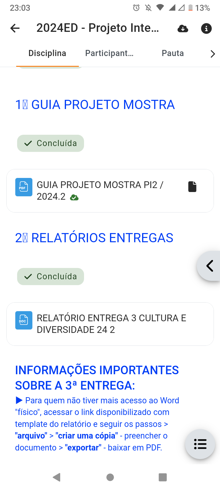 <p>23:03 2024ED - Projeto Inte i Disciplina Participant... Pauta 1 IX GUIA PROJETO MOSTRA Concluída GUIA PROJETO MOSTRA PI2 / PDF 2024.2 2X RELATÓRIOS ENTREGAS Concluída RELATÓRIO ENTREGA 3 CULTURA E DOC DIVERSIDADE 24 2 INFORMAÇÕES IMPORTANTES SOBRE A ENTREGA: Para quem não tiver mais acesso ao Word "físico", acessar o link disponibilizado com template do relatório e seguir os passos > "arquivo" > "criar uma cópia" - preencher o documento > "exportar" - baixar em PDF.</p>