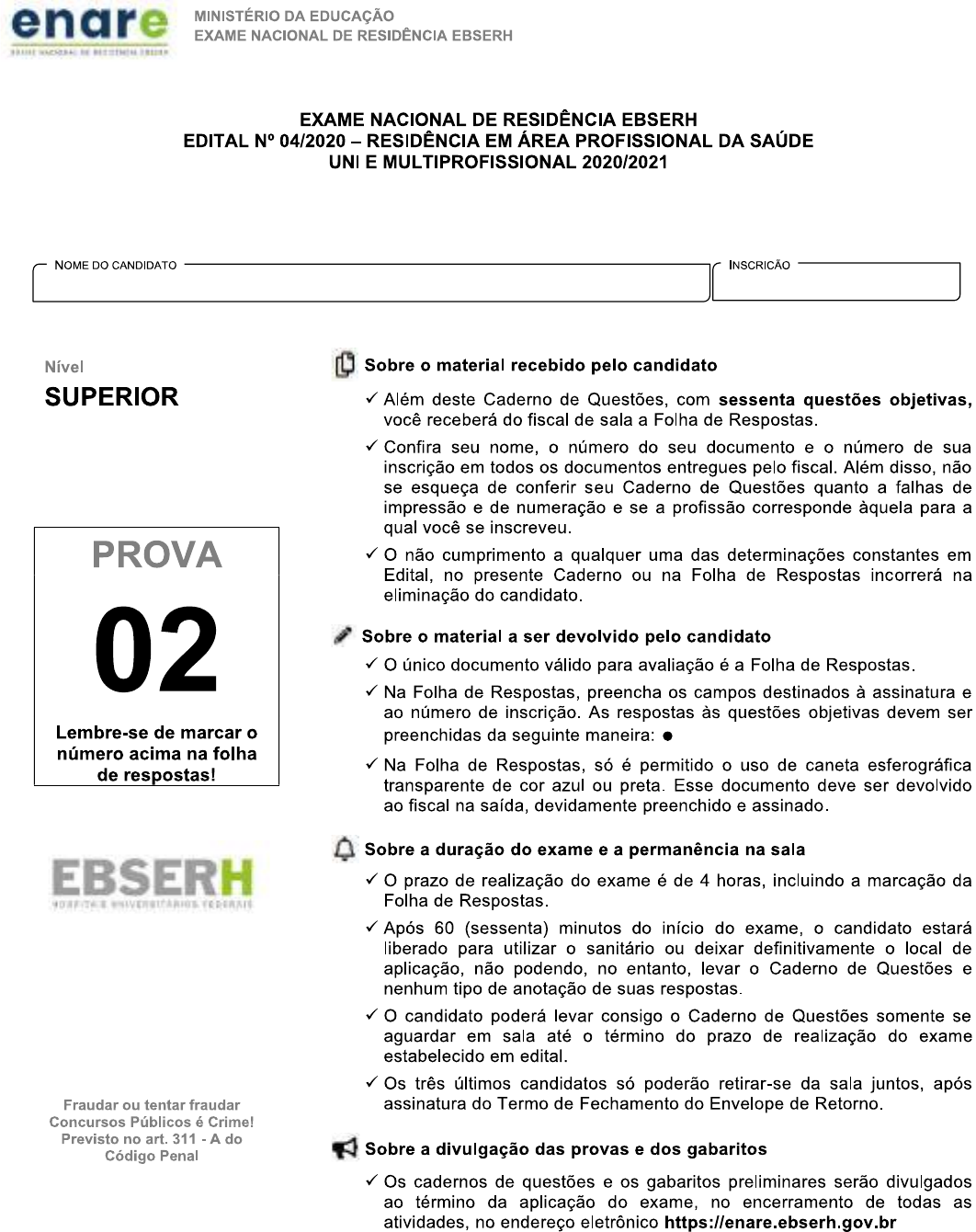 <p>ODONTOLOGIA</p><p>Licenciado para - José M</p><p>artí Luna P</p><p>alhano - 01708242252 - P</p><p>rotegido por E</p><p>duzz.com</p><p>Licenciado para - José M</p><p>artí Luna P</p><p>alhano - 01708242252 - P</p><p>rotegido por E</p><p>duzz.com</p><p>Licenciado para - José M</p><p>artí Luna P</p><p>alhano - 01708242252 - P</p><p>rotegido por E</p><p>duzz.com</p><p>Licenciado para - José M</p><p>artí Luna P</p><p>alhano - 01708242252 - P</p><p>rotegido por E</p><p>duzz.com</p><p>Licenciado para - José M</p><p>artí Luna P</p><p>alhano - 01708242252 - P</p><p>rotegido por E</p><p>duzz.com</p><p>Licenciado para - José M</p><p>artí Luna P</p><p>alhano - 01708242252 - P</p><p>rotegido por E</p><p>duzz.com</p><p>Licenciado para - José M</p><p>artí Luna P</p><p>alhano - 01708242252 - P</p><p>rotegido por E</p><p>duzz.com</p><p>Licenciado para - José M</p><p>artí Luna P</p><p>alhano - 01708242252 - P</p><p>rotegido por E</p><p>duzz.com</p><p>Exame Nacional de Residência INSTITUTO AOCP</p><p>23</p><p>Paciente de 56 anos de idade, sexo masculino,</p><p>apresenta-se para tratamento odontológico.</p><p>Durante a anamnese, ele relata fazer uso de</p><p>varfarina devido a ter sido diagnosticado com</p><p>cardiopatia isquêmica. Caso seja necessária a</p><p>prescrição de um antibiótico para esse</p><p>paciente, qual seria a melhor opção?</p><p>(A) Amoxicilina.</p><p>(B) Azitromicina.</p><p>(C) Eritromicina.</p><p>(D) Ciprofloxacina.</p><p>(E) Tetraciclina.</p><p>24 Paciente masculino, 6 anos de idade, 20</p><p>quilos, é levado por sua mãe para tratamento</p><p>odontológico. Quando bebê, foi diagnosticado</p><p>com cardiopatia congênita, corrigida quando</p><p>ele tinha 19 meses de idade, mas ficou com</p><p>defeito residual no local do reparo. A mãe não</p><p>sabe relatar ao certo qual era o defeito. O</p><p>comportamento da criança é classificado</p><p>como definitivamente positivo pela escala de</p><p>Frankl (1962). Ao realizar o exame clínico,</p><p>percebe-se que a atividade de cárie é aguda,</p><p>com lesões cariosas de profundidade rasa em</p><p>todos os segundos molares decíduos e de</p><p>média profundidade nos primeiros molares</p><p>decíduos inferiores. Os elementos 71 e 81</p><p>estão em estágio avançado de rizótise. Além</p><p>do tratamento educativo, o plano de</p><p>tratamento contempla a realização de</p><p>profilaxia, aplicação tópica de flúor fosfato</p><p>acidulado, aplicação de cariostático nos</p><p>segundos molares decíduos eART nos</p><p>primeiros molares decíduos inferiores. Os</p><p>procedimentos serão realizados sob</p><p>isolamento relativo. Nessa situação, qual</p><p>esquema de profilaxia antibiótica estaria</p><p>indicado?</p><p>(A) 10 ml de Amoxicilina (suspensão, 500 mg /</p><p>5ml) 30 minutos antes dos procedimentos.</p><p>(B) 10 ml de Amoxicilina (suspensão, 250 mg/</p><p>5ml) 30 minutos antes dos procedimentos.</p><p>(C) 5 ml de Amoxicilina (suspensão, 250 mg /</p><p>5ml) 30 minutos antes dos procedimentos.</p><p>(D) 2 g de Amoxicilina uma hora antes dos</p><p>procedimentos.</p><p>(E) Nesse caso, não há indicação para a</p><p>realização de profilaxia antibiótica.</p><p>26 Paciente de 17 anos de idade apresenta-</p><p>se para atendimento odontológico com a</p><p>queixa de "língua presa". Apesar de</p><p>temeroso com a cirurgia, relata que está</p><p>tendo problemas sociais em decorrência</p><p>disso. Seu medo é que, durante a cirurgia,</p><p>possa ocorrer a lesão de alguma estrutura</p><p>importante. De fato, essa é uma</p><p>possibilidade. É preciso ter muito cuidado</p><p>para não lesar carúncula a sublingual, que</p><p>é onde se abre o ducto da glândula</p><p>25</p><p>Paciente de 14 anos de idade é encaminhado</p><p>para atendimento odontológico devido à</p><p>hipótese diagnóstica de queratocisto</p><p>odontogênico. Dentre as seguintes, são</p><p>características dessa lesão, EXCETO</p><p>(A) parótica.</p><p>(B) sublingual.</p><p>(C) submandibular.</p><p>(D) lingual anterior.</p><p>(E) labial inferior</p><p>(A) grande potencial de crescimento</p><p>comparado à maioria dos cistos</p><p>odontogênicos.</p><p>(B) baixo índice de recidiva.</p><p>(C) possível associação com a síndrome do</p><p>carcinoma nevoide basocelular.</p><p>(D) marcante tendência para o envolvimento</p><p>do corpo posterior e do ramo da mandíbula.</p><p>(E) queratocistos que tendem a crescer</p><p>dentro da cavidade medular do osso, sem</p><p>causar expansão óssea.</p><p>Prova 02 – Página 8</p><p>Licenciado para - José M</p><p>artí Luna P</p><p>alhano - 01708242252 - P</p><p>rotegido por E</p><p>duzz.com</p><p>Exame Nacional de Residência INSTITUTO AOCP</p><p>27</p><p>A tomografia computadorizada oferece</p><p>imagens tridimensionais e está indicada</p><p>quando há suspeita de contato do terceiro</p><p>molar inferior com o canal da mandíbula, pois</p><p>acrescenta informações detalhadas sobre a</p><p>relação vestibulo-lingual dessas estruturas.</p><p>possibilitando melhor visualização das raízes</p><p>do dente, além da posição e do trajeto do</p><p>canal da mandíbula. Atualmente, há vários</p><p>modelos de equipamentos de Tomografia</p><p>Computadorizada de Feixe Cônico disponíveis</p><p>(TCFC). Dentre os parâmetros de aquisição de</p><p>imagem, qual se refere à menor parte</p><p>distinguível da imagem tridimensional?</p><p>(A) Unidade Hounsfield.</p><p>(B) FOV.</p><p>(C) Voxel.</p><p>(D) DICOM.</p><p>(E) Imagem-base</p><p>30</p><p>Embora a maioria dos distúrbios bucais</p><p>seja decorrente da ação direta do biofilme,</p><p>os tecidos bucais podem estar sujeitos a</p><p>alterações ou danos como consequência de</p><p>doenças que afetam predominantemente</p><p>outros sistemas do corpo. Dentre as</p><p>manifestações bucais do lúpus eritematoso</p><p>sistêmico juvenil, qual é a mais comum?</p><p>29</p><p>A pandemia da COVID-19 trouxe a necessidade</p><p>de adequa