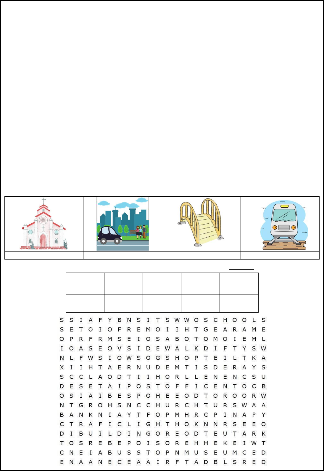 <p>ATIVIDDAE DE LÍNGUA INGLESA- 27/08/2024</p><p>NOME:________________________________ PROFª.: VERÔNICA TURMA: 6º _____</p><p>1. ASSOCIE AS PALAVRAS AOS SEUS SIGNIFICADOS.</p><p>( 1 ) EDIFÍCIO ( ) POST OFFICE</p><p>( 2 ) POSTO DO CORPO DE BOMBEIROS ( ) BUS</p><p>( 3 ) APARTAMENTO ( ) AMBULANCE</p><p>( 4 ) LOJA ( ) SKYSCRAPER</p><p>( 5 ) CALÇADA ( ) BUILDING</p><p>( 6 ) PARADA DE ÔNIBUS ( ) FIRE STATION</p><p>( 7 ) ESCOLA ( ) APARTMENT</p><p>( 8 ) IGREJA ( ) SHOP</p><p>( 9 ) ÔNIBUS ( ) SIDEWALK</p><p>( 10 ) CORREIO ( ) STREET</p><p>( 11 ) ARRANHA-CÉU ( ) BANK</p><p>( 12 ) AMBULÂNCIA ( ) SUBWAY</p><p>( 13 ) RUA ( ) TRUCK</p><p>( 14 ) HOSPITAL ( ) MOTORCYCLE</p><p>( 15 ) DELEGACIA DE POLÍCIA ( ) MUSEUM</p><p>( 16 ) CARRO ( ) BRIDGE</p><p>( 17 ) SINAL DE TRÂNSITO ( ) PUBLIC PHONE</p><p>( 18 ) SEMÁFORO ( ) CORNER</p><p>( 19 ) TÁXI ( ) CAB / TAXI</p><p>( 20 ) ESQUINA ( ) POLICE STATION</p><p>( 21 ) PONTE ( ) HOSPITAL</p><p>( 22 ) MUSEU ( ) CAR</p><p>( 23 ) BANCO ( ) CHURCH</p><p>( 24 ) METRÔ ( ) SCHOOL</p><p>( 25 ) TELEFONE PÚBLICO ( ) BUS STOP</p><p>( 26 ) MOTO ( ) TRAFIC SIGN</p><p>( 27 ) CAMINHÃO ( ) TRAFIC LIGHT</p><p>2. A PARTIR DAS IMAGENS, ESCREVA EM INGLÊS SEUS SIGNIFICADOS.</p><p>3. BUSQUE NO DIAGRAMA AS SEGUINTES PALAVRAS SOBRE O TEMA CIDADE.</p><p>BANK CHURCH MUSEUM SHOP SUBWAY</p><p>BUILDING CORNER</p><p>POLICE</p><p>STATION</p><p>SIDEWALK TRAFIC LIGHT</p><p>BUS STOP FIRE STATION POST OFFICE SKYSCRAPER TRAFIC SIGN</p><p>BRIDGE MOTOCYCLE SCHOOL STREET TRUCK</p><p>4. OBSERVE O TRECHO DA CANÇÃO DE MILEY CYRUS (PARTY IN THE U.S.A.).</p><p>“Jumped in the cab, here I am for the first time. Look to my right, and I see the Hollywood sign”</p><p>Sobre o vocabulário de Meios de Transporte na Cidade em inglês, qual está sendo mencionado?</p><p>a) Metrô</p><p>b) Ambulância</p><p>c) Táxi</p><p>d) Ônibus</p><p>5. NA CANÇÃO DE DEMI LOVATO “SKYSCRAPER” HÁ A SEGUINTE PASSAGEM:</p><p>"Go on and try to tear me down, I will be rising from the ground like a skyscraper".</p><p>Ignorando a metáfora contida nesse trecho e considerando o tema em estudo “Locais da Cidade em</p><p>Inglês”, marque a alternativa que apresenta um local que é mencionado na passagem dessa canção.</p><p>a) Igreja.</p><p>b) Arranha-céu.</p><p>c) Loja. d)Correio.</p><p>6. Ao caminhar por uma cidade, podemos nos deparar com vários tipos de estabelecimentos. Você como</p><p>pedestre, precisa sempre andar pela calçada, que em inglês chamamos de SIDEWALK. Considerando o</p><p>vocabulário em inglês sobre Cidade, como chamamos o encontro de duas ruas?</p><p>a) Shop.</p><p>b) Bridge.</p><p>c) Church.</p><p>d) Corner.</p><p>7. RELACIONE OS SEGUINTES VERBOS DE AÇÕES COM SEUS RESPECTIVOS SIGNIFICADOS.</p><p>( 1 ) To walk ( ) Atravessar a rua</p><p>( 2 ) To stop ( ) Avançar / Ir / Prosseguir</p><p>( 3 ) To Go ( ) Caminhar</p><p>( 4 ) To Drive ( ) Dirigir</p><p>( 5 ) To cross the street ( ) Dobrar a esquina</p><p>( 6 ) To turn the corner ( ) Parar</p><p>8. A PARTIR DAS IMAGENS, ESCREVA EM INGLÊS O VERBO DE AÇÃO.</p><p>9. Samanta foi a Ottawa pela primeira vez e resolveu</p><p>passear na cidade. Ao caminhar, avistou um lindo</p><p>vestido na vitrine de uma loja do outro lado da rua.</p><p>Para que Samanta chegue a essa loja o que ela deve</p><p>fazer?</p><p>a) To cross the street.</p><p>b) To turn the corner.</p><p>c) To turn the left.</p><p>d) To stop.</p><p>10. MARQUE A ALTERNATIVA ONDE HÁ</p><p>SOMENTE VERBOS DE AÇÃO.</p><p>a) To stop / Sidewalk / Bridge</p><p>b) Motorcycle / To turn the corner / Building</p><p>c) To drive / To turn the corner / To stop</p><p>d) To drive / Church / Shop</p>