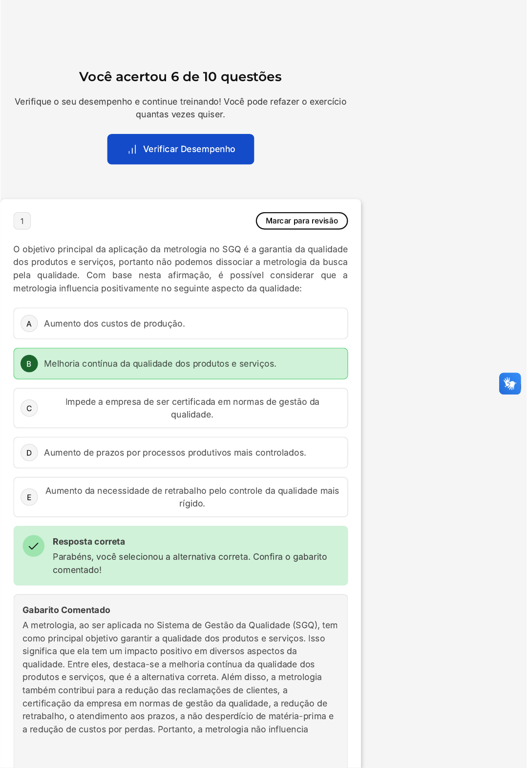 <p>Você acertou 6 de 10 questões</p><p>Verifique o seu desempenho e continue treinando! Você pode refazer o exercício</p><p>quantas vezes quiser.</p><p>Verificar Desempenho</p><p>A</p><p>B</p><p>C</p><p>D</p><p>E</p><p>1 Marcar para revisão</p><p>O objetivo principal da aplicação da metrologia no SGQ é a garantia da qualidade</p><p>dos produtos e serviços, portanto não podemos dissociar a metrologia da busca</p><p>pela qualidade. Com base nesta afirmação, é possível considerar que a</p><p>metrologia influencia positivamente no seguinte aspecto da qualidade:</p><p>Aumento dos custos de produção.</p><p>Melhoria contínua da qualidade dos produtos e serviços.</p><p>Impede a empresa de ser certificada em normas de gestão da</p><p>qualidade.</p><p>Aumento de prazos por processos produtivos mais controlados.</p><p>Aumento da necessidade de retrabalho pelo controle da qualidade mais</p><p>rígido.</p><p>Resposta correta</p><p>Parabéns, você selecionou a alternativa correta. Confira o gabarito</p><p>comentado!</p><p>Gabarito Comentado</p><p>A metrologia, ao ser aplicada no Sistema de Gestão da Qualidade �SGQ�, tem</p><p>como principal objetivo garantir a qualidade dos produtos e serviços. Isso</p><p>significa que ela tem um impacto positivo em diversos aspectos da</p><p>qualidade. Entre eles, destaca-se a melhoria contínua da qualidade dos</p><p>produtos e serviços, que é a alternativa correta. Além disso, a metrologia</p><p>também contribui para a redução das reclamações de clientes, a</p><p>certificação da empresa em normas de gestão da qualidade, a redução de</p><p>retrabalho, o atendimento aos prazos, a não desperdício de matéria-prima e</p><p>a redução de custos por perdas. Portanto, a metrologia não influencia</p><p>A</p><p>B</p><p>C</p><p>D</p><p>E</p><p>A</p><p>B</p><p>negativamente em nenhum aspecto da qualidade, mas sim, contribui para a</p><p>melhoria contínua da qualidade.</p><p>2 Marcar para revisão</p><p>Toda medição executada contem uma incerteza e um erro associados. A</p><p>calibração a atividade mais aplicada para determinação destas características.</p><p>Segundo o VIM 2012, podemos conceituar erro de medição como:</p><p>A diferença entre o valor medido de uma grandeza e um valor de</p><p>referência.</p><p>A diferença entre o valor de referência e o valor medido de uma</p><p>grandeza.</p><p>Uma característica que pode sempre ser ajustada após a calibração.</p><p>A diferença entre o valor verdadeiro de um padrão de referência e a</p><p>correção.</p><p>Uma característica sistemática ou aleatória que pode ser sempre</p><p>ajustada após a manutenção.</p><p>Resposta incorreta</p><p>Opa! A alternativa correta é a letra A. Confira o gabarito comentado!</p><p>Gabarito Comentado</p><p>Segundo o item 2.16 do VIM 2012, o conceito de erro é a "diferença entre o</p><p>valor medido de uma grandeza e um valor de referência". Nem todo erro</p><p>pode gerar uma correção, pois há erros sistemáticos e erros aleatórios.</p><p>3 Marcar para revisão</p><p>A escolha do fornecedor adequado é de grande relevância para a garantia de</p><p>uma calibração válida. No mercado há grande oferta de serviços de calibração e</p><p>ensaios. A respeito dos fornecedores de calibração é correto afirmar que:</p><p>São os laboratórios de calibração em geral.</p><p>O Inmetro fornece todos os serviços de calibração aos laboratórios</p><p>acreditados que integram o BIPM.</p><p>C</p><p>D</p><p>E</p><p>A</p><p>B</p><p>C</p><p>D</p><p>E</p><p>Os laboratórios pertencentes à RBC fornecem calibrações aos</p><p>laboratórios de chão de fábrica ou até mesmo para outros laboratórios</p><p>acreditados, apenas quando seus padrões de referência são calibrados</p><p>no BIPM.</p><p>Os laboratórios de calibração da RBLE oferecem calibrações rastreadas</p><p>ou acreditadas, quando realizadas dentro do escopo de acreditação.</p><p>A RBC, Rede Brasileira de Ensaios e Calibração, é formada por um</p><p>conjunto de laboratórios que possuem rastreabilidade direta aos</p><p>padrões internacionais de maior hierarquia.</p><p>Resposta incorreta</p><p>Opa! A alternativa correta é a letra A. Confira o gabarito comentado!</p><p>Gabarito Comentado</p><p>Os laboratórios de calibração em geral são considerados fornecedores de</p><p>calibração. Contudo, RBC, Rede Brasileira de Calibração, e a RBLE, Rede</p><p>Brasileira de Laboratórios de Ensaios, é formada por um conjunto de</p><p>laboratórios que possuem acreditação concedida pela Cgcre.</p><p>4 Marcar para revisão</p><p>A ABNT NBR ISO/IEC 17025 teve sua versão vigente publicada em 2017. Desde</p><p>sua primeira publicação, muitas alterações foram feitas para melhorar a harmonia</p><p>entre os requisitos da norma em relação a outras normas de gestão da qualidade.</p><p>A primeira versão da ABNT NBR ISO/IEC 17025 foi publicada no Brasil em:</p><p>1990.</p><p>2001.</p><p>1999.</p><p>2015.</p><p>2017.</p><p>Resposta incorreta</p><p>Opa! A alternativa correta é a letra B. Confira o gabarito comentado!</p><p>Gabarito Comentado</p><p>A</p><p>B</p><p>C</p><p>D</p><p>E</p><p>A norma ABNT NBR ISO/IEC 17025, que estabelece os requisitos gerais para</p><p>a competência de laboratórios de ensaio e calibração, teve sua primeira</p><p>versão publicada no Brasil no ano de 2001. Embora a norma tenha sido</p><p>originalmente criada em 1999, sua implementação no Brasil ocorreu dois</p><p>anos depois. Portanto, a alternativa correta é a letra B, que indica o ano de</p><p>2001.</p><p>5 Marcar para revisão</p><p>O conceito de hierarquia de calibração é apresentado pelo item 2.40 do VIM</p><p>2012. Trata-se da ¿sequência de calibrações desde uma referência até ao</p><p>sistema de medição final, em que o resultado de cada calibração depende do</p><p>resultado da calibração precedente¿. Considerando este conceito, podemos</p><p>afirmar que o padr