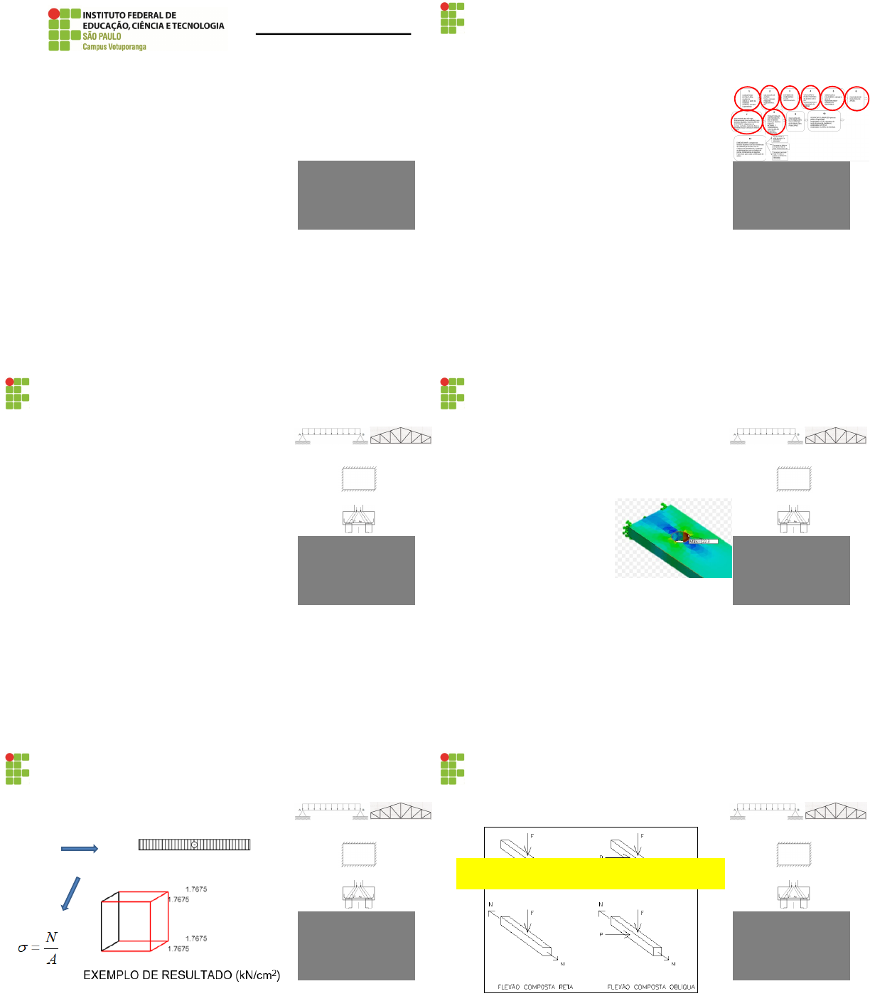 <p>ESTABILIDADES DAS CONSTRUÇÕES 1:</p><p>CÁLCULO DAS TENSÕES NORMAL E</p><p>DE CISALHAMENTO</p><p>Prof. Gustavo Cabrelli Nirschl</p><p>ENGENHARIA CIVIL EMENTA 2</p><p>1. INTRODUÇÃO</p><p>2. AÇÕES, COMBINAÇÕES E CARREGAMENTOS</p><p>3. AÇÃO DO VENTO EM EDIFICAÇÕES</p><p>4. CONDIÇÕES DE CONTORNO E CLASSIFICAÇÃO DAS ESTRUTURAS</p><p>QUANTO AOS GRAUS DE LIBERDADE</p><p>5. ELEMENTOS ESTRUTURAIS BÁSICOS E SEUS ESFORÇOS</p><p>6. CÁLCULO DAS TENSÕES NORMAL E DE CISALHAMENTO</p><p>7. CÁLCULO DAS DEFORMAÇÕES</p><p>8. ESTADOS DE TENSÕES E CRITÉRIOS DE RESISTÊNCIA</p><p>9. ESTADOS DE DEFORMAÇÕES</p><p>10. ELEMENTO DE BARRA SOBRE BASE ELÁSTICA</p><p>11. INTRODUÇÃO AO PRINCÍPIO DOS TRABALHOS</p><p>VIRTUAIS (PTV)</p><p>12. MÉTODO DAS FORÇAS</p><p>13. MÉTODO DOS DESLOCAMENTOS</p><p>14. PROCESSO DE CROSS</p><p>ELEMENTOS LINEARES 3</p><p>Esforços (diagramas):</p><p>normal, cortante,</p><p>momento fletor e momento torçor</p><p>ELEMENTOS LINEARES</p><p>ELEMENTOS DE SUPERFÍCIE</p><p>ELEMENTOS TRIDIMENSIONAISTransformá-los em tensão comparar</p><p>com as tensões de resistência do material</p><p>(critérios de resistência) dimensionar o</p><p>elemento</p><p>TENSÕES MÉDIAS 4</p><p>ELEMENTOS LINEARES</p><p>ELEMENTOS DE SUPERFÍCIE</p><p>ELEMENTOS TRIDIMENSIONAIS</p><p>Tensões médias nas seções transversais</p><p>(Princípio de Saint-Venant: nas seções</p><p>suficientemente longes do ponto de</p><p>aplicação das ações, longes dos</p><p>apoios e longes de descontinuidades</p><p>como furos e variações</p><p>bruscas de seção, casos</p><p>onde há concentração de</p><p>tensões (tensões</p><p>maiores que as médias)).</p><p>- válidas até o limite de proporcionalidade</p><p>(elásticas).</p><p>Fonte:</p><p>https://ensus.com.br/elementos-finitos-</p><p>singularidade-de-tensao-o-que-fazer/</p><p>- materiais homogêneos (um só material)</p><p>TENSÃO NORMAL 5</p><p>TENSÃO NORMAL POR ESFORÇO</p><p>NORMAL: treliça, escora, cabo e tirante</p><p>ELEMENTOS LINEARES</p><p>ELEMENTOS DE SUPERFÍCIE</p><p>ELEMENTOS TRIDIMENSIONAIS</p><p>ações</p><p>Diagrama de esforço normal N</p><p>6</p><p>ELEMENTOS LINEARES</p><p>ELEMENTOS DE SUPERFÍCIE</p><p>ELEMENTOS TRIDIMENSIONAIS</p><p>TENSÃO NORMAL POR ESFORÇO DE</p><p>FLEXÃO: vigas, pórticos, grelhas</p><p>TENSÃO NORMAL</p><p>A Flexão composta pode ser chamada de FLEXO-</p><p>COMPRESSÃO ou FLEXO-TRAÇÃO</p><p>7</p><p>ELEMENTOS LINEARES</p><p>ELEMENTOS DE SUPERFÍCIE</p><p>ELEMENTOS TRIDIMENSIONAIS</p><p>TENSÃO NORMAL POR ESFORÇO DE</p><p>FLEXÃO: vigas, pórticos, grelhas</p><p>ações diagrama Mx</p><p>TENSÃO NORMAL 8</p><p>ELEMENTOS LINEARES</p><p>ELEMENTOS DE SUPERFÍCIE</p><p>ELEMENTOS TRIDIMENSIONAIS</p><p>TENSÃO NORMAL POR ESFORÇO DE</p><p>FLEXÃO: vigas, pórticos, grelhas</p><p>diagrama Mx e Myações</p><p>TENSÃO NORMAL</p><p>9</p><p>ELEMENTOS LINEARES</p><p>ELEMENTOS DE SUPERFÍCIE</p><p>ELEMENTOS TRIDIMENSIONAIS</p><p>TENSÃO NORMAL POR ESFORÇO DE</p><p>FLEXÃO: vigas, pórticos, grelhas</p><p>diagrama Mx e N</p><p>TENSÃO NORMAL</p><p>ações</p><p>10</p><p>ELEMENTOS LINEARES</p><p>ELEMENTOS DE SUPERFÍCIE</p><p>ELEMENTOS TRIDIMENSIONAIS</p><p>TENSÃO NORMAL POR ESFORÇO DE</p><p>FLEXÃO: vigas, pórticos, grelhas</p><p>diagrama Mx, My e N</p><p>TENSÃO NORMAL</p><p>ações</p><p>11</p><p>ELEMENTOS LINEARES</p><p>ELEMENTOS DE SUPERFÍCIE</p><p>ELEMENTOS TRIDIMENSIONAIS</p><p>SITE NEV:</p><p>http://vtp.ifsp.edu.br/nev/</p><p>TENSÃO NORMAL</p><p>MOSTRAR TESTE NO SITE</p><p>12</p><p>ELEMENTOS LINEARES</p><p>ELEMENTOS DE SUPERFÍCIE</p><p>ELEMENTOS TRIDIMENSIONAIS</p><p>TENSÃO NORMAL POR ESFORÇO DE</p><p>FLEXÃO: vigas, pórticos, grelhas</p><p>TENSÃO NORMAL</p><p>FLEXÃO COMPOSTA POR AÇÃO</p><p>EXCÊNTRICA:</p><p>13</p><p>ELEMENTOS LINEARES</p><p>ELEMENTOS DE SUPERFÍCIE</p><p>ELEMENTOS TRIDIMENSIONAIS</p><p>TENSÃO NORMAL POR ESFORÇO DE</p><p>FLEXÃO: vigas, pórticos, grelhas</p><p>TENSÃO NORMAL</p><p>OU</p><p>14</p><p>ELEMENTOS LINEARES</p><p>ELEMENTOS DE SUPERFÍCIE</p><p>ELEMENTOS TRIDIMENSIONAIS</p><p>TENSÃO NORMAL CRÍTICA DE</p><p>FLAMBAGEM (quando há compressão)</p><p>TENSÃO NORMAL</p><p>15</p><p>ELEMENTOS LINEARES</p><p>ELEMENTOS DE SUPERFÍCIE</p><p>ELEMENTOS TRIDIMENSIONAIS</p><p>TENSÃO NORMAL</p><p>TENSÃO NORMAL CRÍTICA DE</p><p>FLAMBAGEM (quando há compressão)</p><p>16</p><p>ELEMENTOS LINEARES</p><p>ELEMENTOS DE SUPERFÍCIE</p><p>ELEMENTOS TRIDIMENSIONAIS</p><p>TENSÃO NORMAL</p><p>TENSÃO NORMAL DEVIDO À</p><p>VARIAÇÃO TÉRMICA</p><p>OU SEJA, E e T DETERMINAM SE O MATERIAL</p><p>FISSURA OU NAQUELA VARIAÇÃO DE T. EX: NOS T</p><p>BRASIL, NORMALMENTE O CONCRETO FISSURA </p><p>JUNTAS (CALCULADAS COM A FÓRMULA DE , A</p><p>ESTUDAR)</p><p>17</p><p>ELEMENTOS LINEARES</p><p>ELEMENTOS DE SUPERFÍCIE</p><p>ELEMENTOS TRIDIMENSIONAIS</p><p>TENSÃO TANGENCIAL (OU DE CISALHAMENTO)</p><p>TENSÃO TANGENCIAL DEVIDO A</p><p>CORTE PURO</p><p>18</p><p>ELEMENTOS LINEARES</p><p>ELEMENTOS DE SUPERFÍCIE</p><p>ELEMENTOS TRIDIMENSIONAIS</p><p>TENSÃO TANGENCIAL (OU DE CISALHAMENTO)</p><p>TENSÃO TANGENCIAL DEVIDO A</p><p>AÇÕES TRANSVERSAIS (FLEXÃO)</p><p>ações Diagrama de CORTANTE V</p><p>19</p><p>ELEMENTOS LINEARES</p><p>ELEMENTOS DE SUPERFÍCIE</p><p>ELEMENTOS TRIDIMENSIONAIS</p><p>TENSÃO TANGENCIAL (OU DE CISALHAMENTO)</p><p>TENSÃO TANGENCIAL DEVIDO A</p><p>AÇÕES TRANSVERSAIS (FLEXÃO)</p><p>20</p><p>ELEMENTOS LINEARES</p><p>ELEMENTOS DE SUPERFÍCIE</p><p>ELEMENTOS TRIDIMENSIONAIS</p><p>TENSÃO TANGENCIAL (OU DE CISALHAMENTO)</p><p>TENSÃO TANGENCIAL DEVIDO A</p><p>AÇÕES TRANSVERSAIS (FLEXÃO)</p><p>21</p><p>ELEMENTOS LINEARES</p><p>ELEMENTOS DE SUPERFÍCIE</p><p>ELEMENTOS TRIDIMENSIONAIS</p><p>TENSÃO TANGENCIAL (OU DE CISALHAMENTO)</p><p>TENSÃO TANGENCIAL DEVIDO A</p><p>AÇÕES TRANSVERSAIS (FLEXÃO)</p><p>22</p><p>ELEMENTOS LINEARES</p><p>ELEMENTOS DE SUPERFÍCIE</p><p>ELEMENTOS TRIDIMENSIONAIS</p><p>TENSÃO TANGENCIAL (OU DE CISALHAMENTO)</p><p>TENSÃO TANGENC