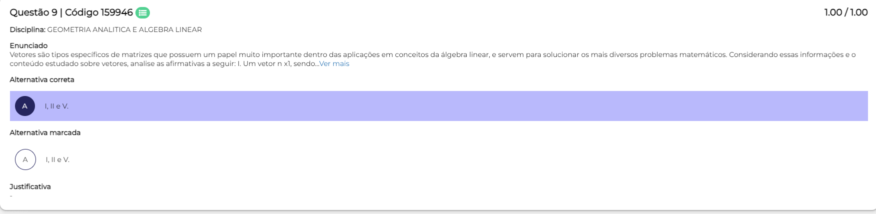 <p>Questão 9 Código 159946 1.00/1.00 Disciplina: GEOMETRIA ANALITICA E ALGEBRA LINEAR Enunciado Vetores são tipos específicos de matrizes que possuem um papel muito importante dentro das aplicações em conceitos da linear, e servem para solucionar os mais diversos problemas Considerando essas informações e conteúdo estudado sobre vetores, analise as afirmativas a seguir: I. Um vetor x1, sendo...Ver mais Alternativa correta A Alternativa marcada A I, e V. Justificativa</p>