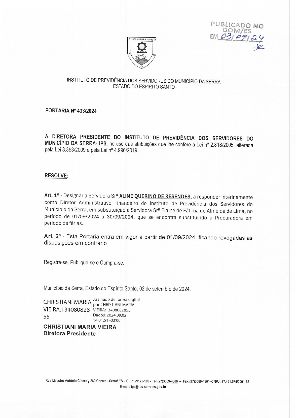 <p>PUBLICADO NO DOM/ES 1556 SERRA EM 03/09/24 INSTITUTO DE PREVIDÊNCIA DOS SERVIDORES DO MUNICÍPIO DA SERRA ESTADO DO ESPÍRITO SANTO PORTARIA 433/2024 A DIRETORA PRESIDENTE DO INSTITUTO DE PREVIDÊNCIA DOS SERVIDORES DO MUNICÍPIO DA SERRA- IPS, no uso das atribuições que lhe confere a Lei 2.818/2005, alterada pela Lei 3.353/2009 e pela Lei n° 4.996/2019. RESOLVE: Art. 1° Designar a Servidora ALINE QUERINO DE RESENDES, a responder interinamente como Diretor Administrativo Financeiro do Instituto de Previdência dos Servidores do Município da Serra, em substituição a Servidora Elaine de Fátima de Almeida de Lima, no período de 01/09/2024 à 30/09/2024, que se encontra substituindo a Procuradora em período de férias Art. 2° - Esta Portaria entra em vigor a partir de 01/09/2024, ficando revogadas as disposições em contrário. Registre-se, Publique-se e Cumpra-se. Município da Serra, Estado do Espírito Santo, 02 de setembro de 2024. CHRISTIANI MARIA Assinado de forma digital por CHRISTIANI MARIA VIEIRA: 134080828 VIEIRA: :13408082855 55 Dados 2024.09.02 14:01:51 -03'00 CHRISTIANI MARIA VIEIRA Diretora Presidente Rua Maestro Antônio Cicero, 269,Centro -Serra/ ES CEP: 29176-100 Tel:(27)3089-4800 - Fax:(27)3089-4801-CNPJ: 27.451.574/0001-32 E-mail: ips@ips-serra.es.gov.br</p>