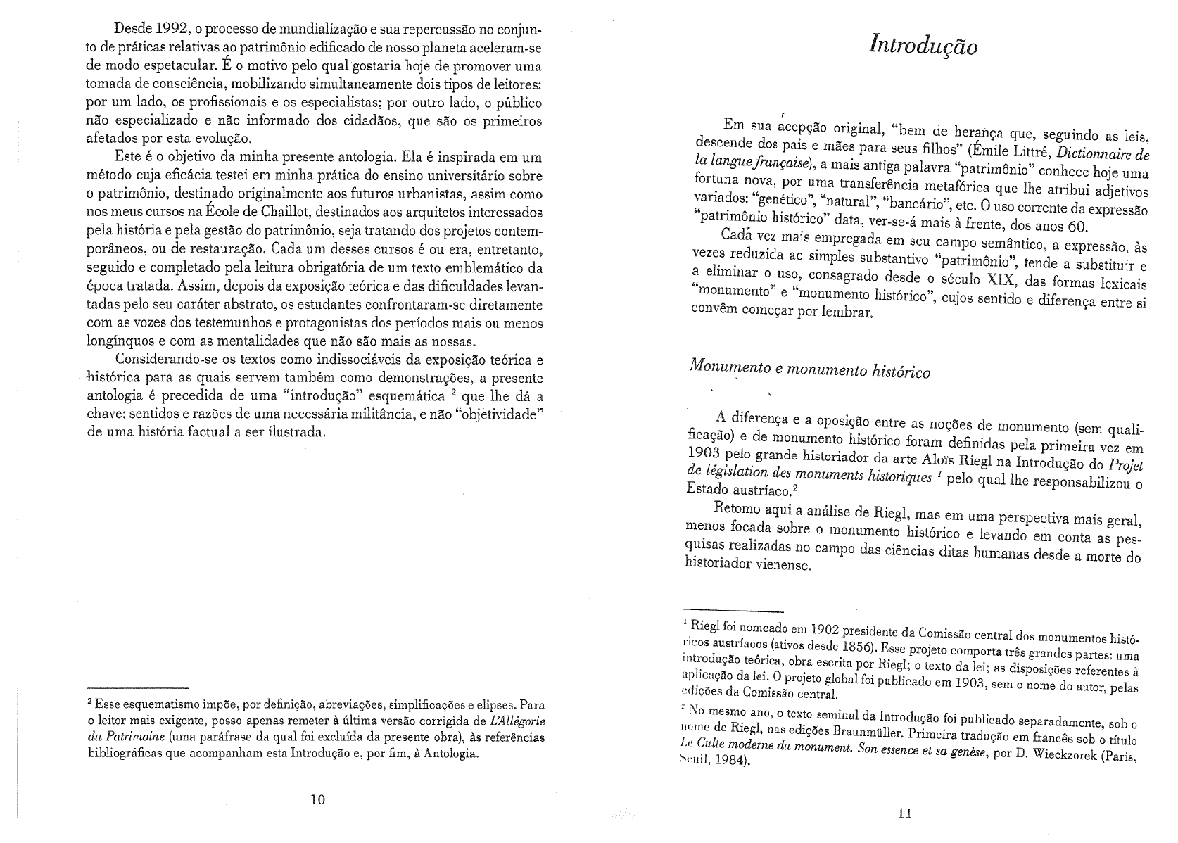 <p>Desde 1992, o processo de mundialização e sua repercussão no conjun- to de práticas relativas ao patrimônio edificado de nosso planeta aceleram-se Introdução de modo espetacular. É o motivo pelo qual gostaria hoje de promover uma tomada de consciência, mobilizando simultaneamente dois tipos de leitores: por um lado, os profissionais e os especialistas; por outro lado, o público não especializado e não informado dos cidadãos, que são os primeiros afetados por esta evolução. Em sua acepção original, "bem de herança que, seguindo as leis, descende dos pais e mães para seus filhos" (Émile Littré. Dictionnaire de Este é o objetivo da minha presente antologia. Ela é inspirada em um método cuja eficácia testei em minha prática do ensino universitário sobre la langue a mais antiga palavra "patrimônio" conhece hoje uma o patrimônio, destinado originalmente aos futuros urbanistas, assim como fortuna nova, por uma transferência metafórica que lhe atribui adjetivos nos meus cursos na de Chaillot, destinados aos arquitetos interessados variados: "genético", "natural", "bancário", etc. 0 uso corrente da expressão "patrimônio histórico" data, ver-se-á mais à frente, dos anos 60. pela história e pela gestão do patrimônio, seja tratando dos projetos contem- porâneos, ou de restauração. Cada um desses cursos é ou entretanto, Cada vez mais empregada em seu campo semântico, a expressão, às vezes reduzida ao simples substantivo "patrimônio". tende a substituir e seguido e completado pela leitura obrigatória de um texto emblemático da a eliminar o uso, consagrado desde o século XIX, das formas lexicais época Assim, depois da exposição teórica e das dificuldades levan- tadas pelo seu caráter abstrato, os estudantes confrontaram-se diretamente "monumento" e "monumento histórico", cujos sentido e diferença entre si convêm começar por lembrar. com as vozes dos testemunhos e protagonistas dos períodos mais ou menos longínquos e com as mentalidades que não são mais as nossas. Considerando-se os textos como indissociáveis da exposição teórica e Monumento e monumento histórico histórica para as quais servem também como demonstrações, a presente antologia é precedida de uma "introdução" esquemática 2 que lhe dá a chave: sentidos e razões de uma necessária militância, e não "objetividade" de uma história factual a ser ilustrada. A diferença e a oposição entre as noções de monumento (sem quali- ficação) e de monumento histórico foram definidas pela primeira vez em 1903 pelo grande historiador da arte Alois Riegl na Introdução do Projet de législation des monuments historiques pelo qual lhe responsabilizou o Estado Retomo aqui a análise de Riegl, mas em uma perspectiva mais geral, menos focada sobre o monumento histórico e levando em conta as pes- quisas realizadas no campo das ciências ditas humanas desde a morte do historiador vienense. foi nomeado em 1902 presidente da Comissão central dos monumentos ricos austríacos (ativos desde 1856). Esse projeto comporta três grandes partes: uma introdução teórica, obra escrita por Riegl; o texto da lei; as disposições referentes à edições da Comissão central. aplicação da lei. O projeto global foi publicado em 1903, sem o nome do autor. pelas 2 Esse esquematismo impõe, por definição, abreviações, simplificações e elipses. Para o leitor mais exigente, posso apenas remeter à última versão corrigida de L'Allégorie No mesmo ano, o texto seminal da Introdução foi publicado separadamente. sob o du Patrimoine (uma paráfrase da qual foi excluída da presente obra), às referências Le nome de Riegl, nas edições Primeira tradução em francês sob o título bibliográficas que acompanham esta Introdução e, por fim, à Antologia. Seuil, 1984). Culte moderne du monument. Son essence et sa genèse, por D. Wieckzorek (Paris, 10 11</p><p>Monumento a função associada ao monumento intencional, sob sua forma arquitetônica Para definir termo "monumento", reportar-nos-emos à sua etimologia. concorreu com o desenvolvimento de memórias artificiais, a partir da inven Ele deriva do substantivo latino monumentum, fruto do verbo monere: "ad- ção e da difusão do impresso no século XV. O destino da escrita, primeira vertir", "lembrar à memória". Chamar-se-á então "monumento" todo artefato memória artificial, descrita de modo inesquecível no Fedro de estará (túmulo, tumba, poste, totem, construção, inscrição...) ou conjunto de artefatos desde então associado à tipografia, a qual Charles Perrault pontuou com deliberadamente concebido e realizado por uma comunidade humana, in- espanto a continuidade que ela traz à memória viva. E, desde o século XVII, dependentemente da natureza e das dimensões (da família à nação, do cla à os dicionários franceses atestam o deslocamento semântico que o êxito tribo, da comunidade de crentes àquela da cidade...), a fim de lembrar, para a livro impresso fez com que termo "monumento" sofresse: a significação do memória viva, orgânica e afetiva dos seus membros, pessoas, acontecimentos, primeira, começa a apagar-se em proveito do caráter imponente crenças, ritos ou regras sociais constitutivos de sua identidade. célebre ou grandioso associado ao adjetivo Na época romântica, a O monumento caracteriza-se, assim, pela sua função identificatória. fórmula de Victor Hugo, "isto [a tipografia] matará aquilo", anuncia Pela sua materialidade, ele intensifica a função simbólica da linguagem, a morte da arquitetura enquanto suporte da memória orgânica. corrigindo a sua volatilidade, e apresenta-se como um dispositivo fundamen- Desde a segunda metade do século XX, graças à mediação de próteses tal no processo de institucionalização das sociedades humanas. Em outras cada vez mais otimizadas, as sociedades ocidentais quase cessaram de eri- palavras, ele tem por vocação ancorar sociedades humanas 