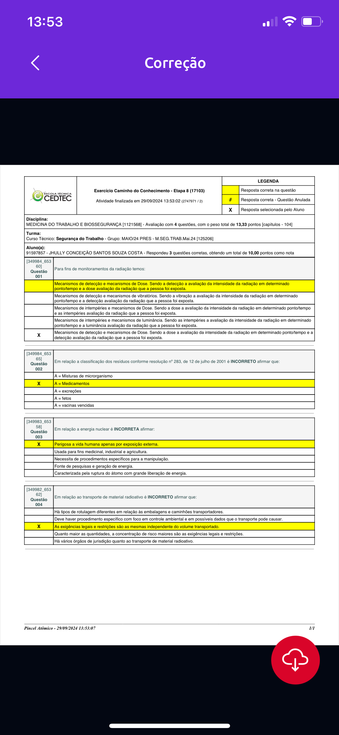 <p>13:53 Correção LEGENDA Exercício Caminho do Conhecimento Etapa 8 (17103) Resposta correta na questão ESCOLA TÉCNICA CEDTEC Atividade finalizada em 29/09/2024 13:53:02 (2747971/2) # Resposta correta Questão Anulada X Resposta selecionada pelo Aluno Disciplina: MEDICINA DO TRABALHO E BIOSSEGURANÇA [1121568] Avaliação com 4 questões, com o peso total de pontos 104] Turma: Curso Técnico: Segurança do Trabalho Grupo: MAIO/24 PRES - [125206] Aluno(a): 91597857 JHULLY CONCEIÇÃO SANTOS SOUZA COSTA Respondeu 3 questões corretas, obtendo um total de 10,00 pontos como nota 60] Para fins de monitoramentos da radiação temos: Questão 001 Mecanismos de detecção e mecanismos de Sendo a detecção a avaliação da intensidade da radiação em determinado ponto/tempo e a dose avaliação da radiação que a pessoa foi exposta. Mecanismos de detecção e mecanismos de vibratórios. Sendo a vibração a avaliação da intensidade da radiação em determinado ponto/tempo e a detecção avaliação da radiação que a pessoa foi exposta. Mecanismos de intempéries e mecanismos de Dose. Sendo a dose a avaliação da intensidade da radiação em determinado ponto/tempo e as intempéries avaliação da radiação que a pessoa foi exposta. Mecanismos de intempéries e mecanismos de Sendo as intempéries a avaliação da intensidade da radiação em determinado ponto/tempo e a luminância avaliação da radiação que a pessoa foi exposta. Mecanismos de detecção e mecanismos de Dose. Sendo a dose a avaliação da intensidade da radiação em determinado ponto/tempo e a X detecção avaliação da radiação que a pessoa foi exposta. Questão Em relação a classificação dos conforme resolução 283, de 12 de julho de 2001 é INCORRETO afirmar que: 002 A = Misturas de microrganismo X A Medicamentos A excreções A fetos A vacinas vencidas [349983_653 Em relação a energia nuclear é INCORRETA Questão 003 Perigosa a vida humana apenas por exposição externa Usada para fins medicinal, industrial e agricultura. Necessita de procedimentos específicos para a manipulação. Fonte de pesquisas e geração de energia. Caracterizada pela ruptura do átomo com grande liberação de energia. [349982_653 Em relação ao transporte de material radioativo é INCORRETO afirmar que: Questão 004 Há tipos de rotulagem diferentes em relação às embalagens e caminhões transportadores. Deve haver procedimento específico com foco em controle ambiental e em possíveis dados que o transporte pode X As exigências legais e restrições são as mesmas independente do volume transportado. Quanto maior as quantidades, a concentração de risco são as exigências legais e restrições. Há vários órgãos de jurisdição quanto ao transporte de material radioativo. Pincel 29/09/2024 13:53:07 1/1</p>