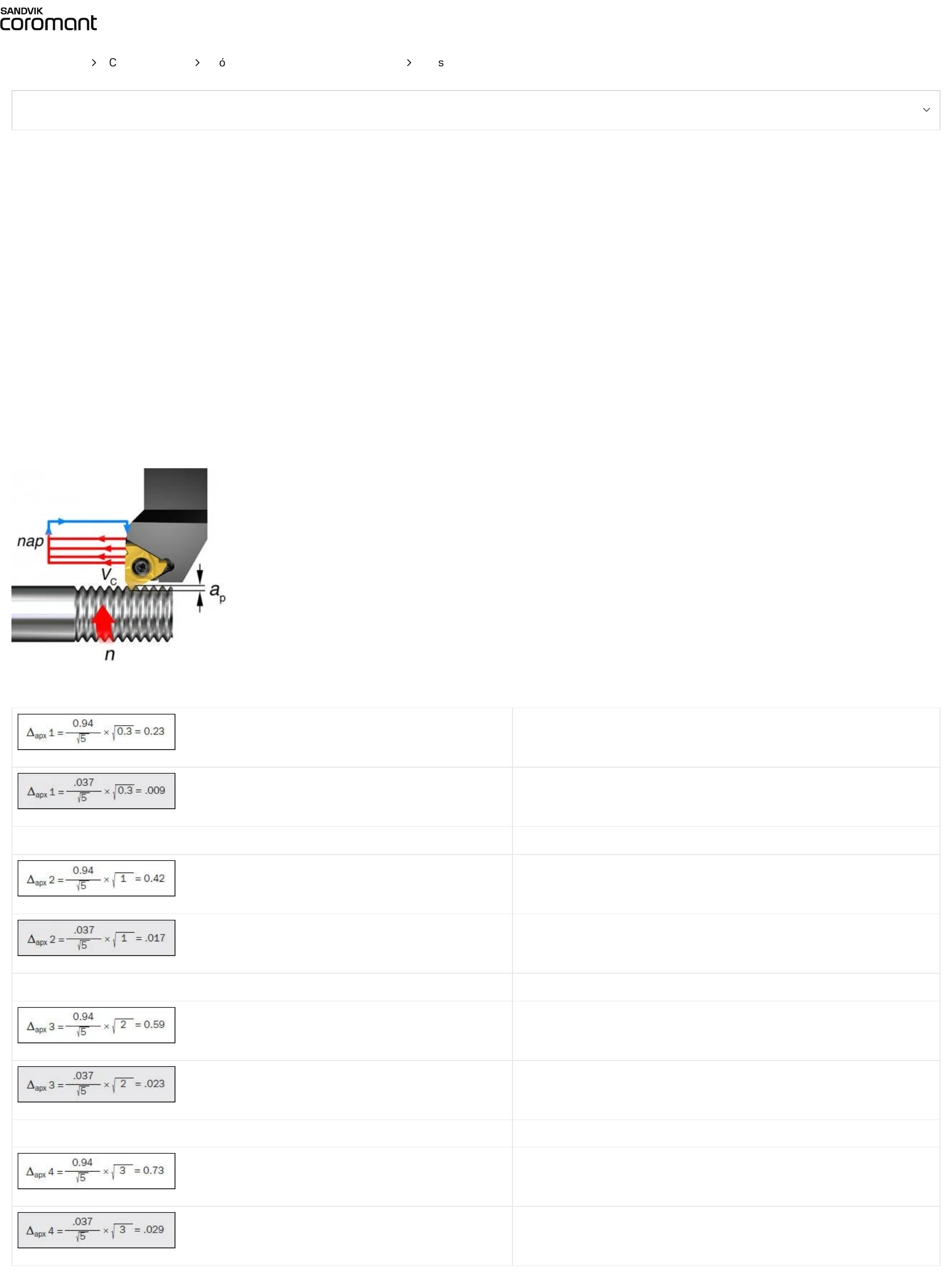 <p>Página inicial Conhecimento Fórmulas e definições de usinagem Rosqueamento</p><p>Fórmulas e definições</p><p>Esta seção abrange as fórmulas e definições para rosqueamento para o cálculo da velocidade de corte, faixa de avanço ou outros parâmetros para suas operações de torneamento</p><p>de rosca, fresamento de rosca ou rosqueamento com macho. Você encontra também a designação de diferentes perfis de rosca de acordo com as normas internacionais.</p><p>Fórmulas e definições de torneamento de rosca</p><p>Penetração</p><p>Ao dividir a profundidade de corte total da rosca em cortes menores, o raio de ponta sensível da pastilha não é sobrecarregado.</p><p>Exemplo: Ao usar 0,23–0,10 mm (0,009–0,004 pol.) de profundidade de corte por passe (penetração radial), profundidade de corte total (ap) e profundidade do perfil da rosca</p><p>(0,94 mm (0,037 pol.)), produz-se uma rosca métrica com passo de 1,5 mm (0,06 pol.) em 6 passes (nap).</p><p>1º passe, penetração</p><p>0,23 mm</p><p>= 0,009 pol</p><p>2º passe, penetração</p><p>0,42 - 0,23 = 0,19 mm</p><p>0,017–0,009 = 0,008 pol.</p><p>3º passe, penetração</p><p>0,59 – 0,42 = 0,17 mm</p><p>0,023–0,017 = 0,006 pol.</p><p>4º passe, penetração</p><p>0,73 – 0,59 = 0,14 mm</p><p>0,029–0,023 = 0,006 pol.</p><p>Fórmulas e definições de usinagem </p><p>https://www.sandvik.coromant.com/</p><p>https://www.sandvik.coromant.com/</p><p>5º passe, penetração</p><p>0,84 – 0,73 = 0,11 mm</p><p>0,033–0,029 = 0,004 pol.</p><p>6º passe, penetração</p><p>0,94 – 0,84 = 0,10 mm</p><p>0,037-0,033 = 0,004 pol.</p><p>A penetração pode ser calculada de acordo com a fórmula:</p><p>Δa = penetração radial, profundidade de corte por passe</p><p>X = Passe real (em uma série de 1 a número de passes nap)</p><p>a = profundidade total da rosca + sobremetal</p><p>nap = número de passes</p><p>Y = 1º passe = 0,3</p><p>2º passe = 1</p><p>3º e posteriores = x-1</p><p>Passo 1,5 mm (0,06 pol.)</p><p>a = 0,94 mm (0,037 pol.)</p><p>nap = 6</p><p>γ = 0,3</p><p>γ =1</p><p>γ = x-1</p><p>Símbolo Designação/definição Métrico Imperial</p><p>a Penetração, profundidade de corte total mm polegadas</p><p>n Velocidade do fuso rpm rpm</p><p>V Velocidade de corte m/min</p><p>nap Número de passes</p><p>1. Raiz/inferior</p><p>A superfície inferior que une dois flancos adjacentes da rosca</p><p>2. Flanco/lateral</p><p>A lateral da superfície da rosca que conecta a crista e a raiz</p><p>3. Crista/superior</p><p>A superfície superior que une os dois lados ou flancos.</p><p>P = passo, mm ou fios por polegadas (t.p.i.)</p><p>p</p><p>p</p><p>p</p><p>1</p><p>2</p><p>n</p><p>p</p><p>c</p><p>A distância de um ponto na rosca do parafuso a um ponto correspondente na próxima rosca paralela ao eixo.</p><p>β = Ângulo do perfil de rosca</p><p>O ângulo entre os flancos da rosca medido em um plano axial.</p><p>φ = Ângulo de ataque (ângulo de hélice) da rosca</p><p>O ângulo da rosca em um diâmetro de passo com um plano perpendicular ao eixo.</p><p>Parâmetros do diâmetro</p><p>d = Diâmetro externo maior</p><p>D = Diâmetro interno maior</p><p>d = Diâmetro externo menor</p><p>D = Diâmetro interno menor</p><p>d = Diâmetro externo do passo</p><p>D = Diâmetro interno do passo</p><p>O diâmetro efetivo da rosca do parafuso; aproximadamente metade do caminho entre os diâmetros principal e secundário.</p><p>Ângulo de ataque (ângulo de hélice)</p><p>O ângulo de ataque, φ, (Ângulo de hélice) depende e está relacionado ao diâmetro e ao passo da rosca. Esta medida pode ser representada por um triângulo sendo desenrolado da</p><p>peça. O ângulo de ataque é calculado de acordo com a fórmula abaixo.</p><p>Fórmula para cálculo do ângulo de ataque.</p><p>N = número de entradas</p><p>O mesmo passo em diâmetros diferentes propicia um</p><p>ângulo de ataque diferente.</p><p>Fórmulas e definições de fresamento para rosca</p><p>Velocidade de corte (v )</p><p>Métrica (m/min)</p><p>Imperial (pés/min)</p><p>1</p><p>1</p><p>2</p><p>2</p><p>Você está procurando recomendações</p><p>de ferramentas?</p><p>Veja nossas ferramentas de corte aqui </p><p>Precisa de conselhos?</p><p>Faça-nos uma pergunta </p><p>Quer saber mais sobre os fundamentos</p><p>básicos da usinagem?</p><p>Registre-se gratuitamente em nosso programa</p><p>de e-learning </p><p>c</p><p>https://www.sandvik.coromant.com/pt-pt/tools/coroplus-toolguide</p><p>https://www.sandvik.coromant.com/pt-pt/contact/ask-us-a-question</p><p>https://www.sandvik.coromant.com/pt-pt/services/education/e-learning/mct</p><p>Fórmulas para fresamento de roscas internas</p><p>Versão calculada</p><p>Avanço periférico (mm/min) (pol./min)</p><p>Profundidade de corte radial (mm)(pol)</p><p>Avanço central da ferramenta (mm/min) (pol./min)</p><p>Avanço por dente (mm)(pol)</p><p>Fresamento de roscas com uma entrada por rolagem no percurso da ferramenta,D</p><p>Fórmulas para fresamento de roscas externas</p><p>Versão calculada</p><p>Avanço periférico (mm/min) (pol./min) Avanço central da ferramenta (mm/min)(pol/min)</p><p>Avanço por dente (mm) (pol)</p><p>vf1</p><p>Fórmulas e definições para rosqueamento com macho</p><p>Métrico polegadas</p><p>Velocidade do fuso (n) (rpm)</p><p>Faixa de avanço</p><p>Torque (M ) (Nm)</p><p>Potência (P) (kW)</p><p>Parâmetros Significado Unidade métrica Unidade em polegadas</p><p>M Torque Nm pol.-lb</p><p>p Passo mm polegadas</p><p>D / DC Diâmetro nominal mm pol.</p><p>k Força de corte específica N/mm lbs/pol.2</p><p>n Velocidade do fuso rpm (rot./min.) rpm (rot./min.)</p><p>P Potência kW HP</p><p>v Velocidade de corte m/min Pés/min</p><p>v Faixa de avanço mm/min pol./min</p><p>Fórmulas para o tamanho do furo</p><p>Um cálculo básico do tamanho do furo pode ser feito com as seguintes fórmulas.</p><p>Cálculo básico do tamanho do furo para macho de corte</p><p>Por exemplo: Para determinar o tamanho do furo para um